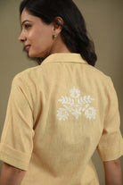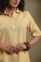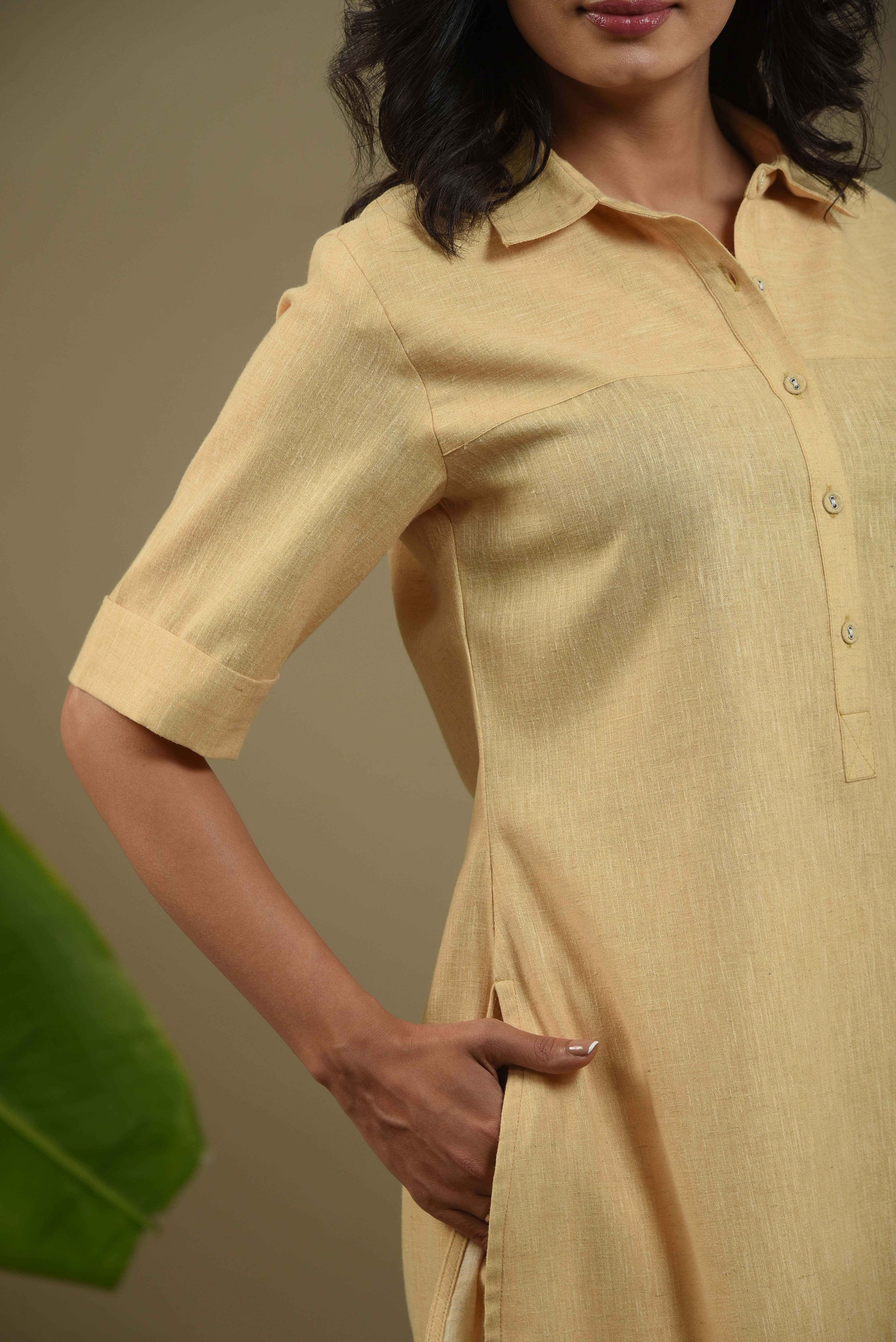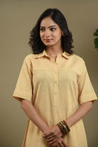 • Brighten your everyday wardrobe with this elegant pastel yellow cord set in fine cotton linen blend fabric.