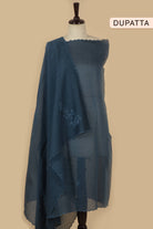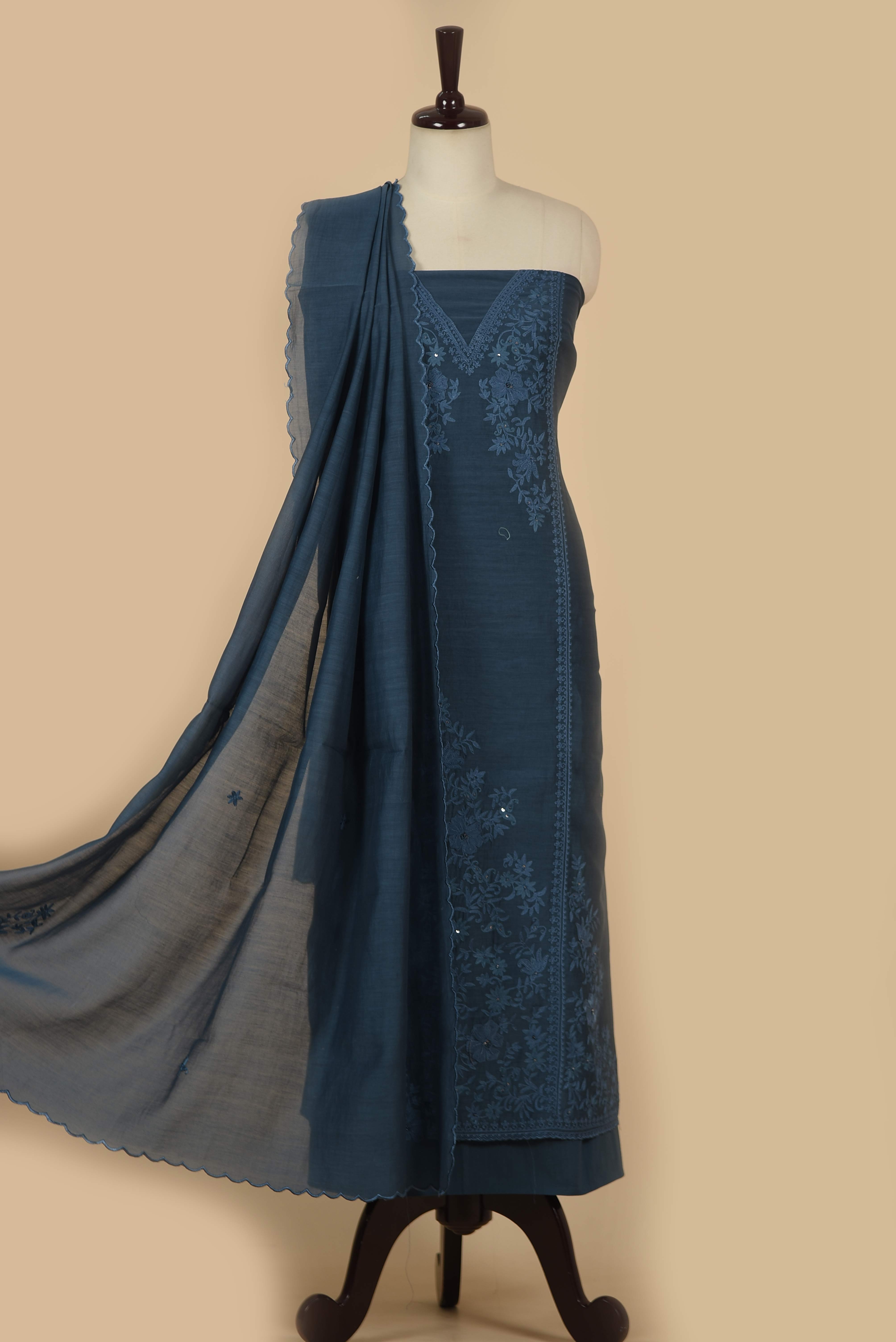 Blue Mul chanderi Embroidered Unstitched Suit Fabric Set With Mul Chanderi Dupatta