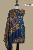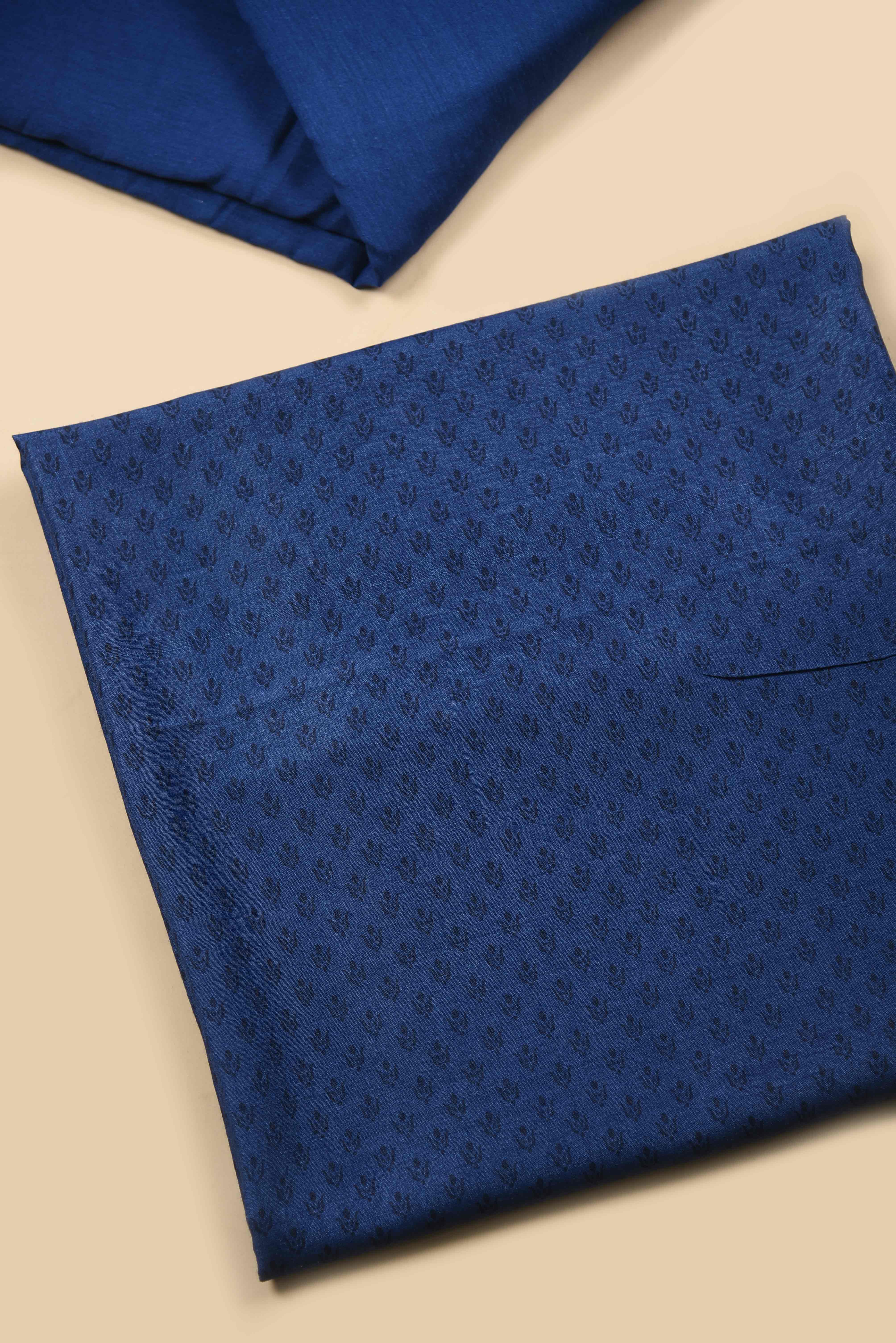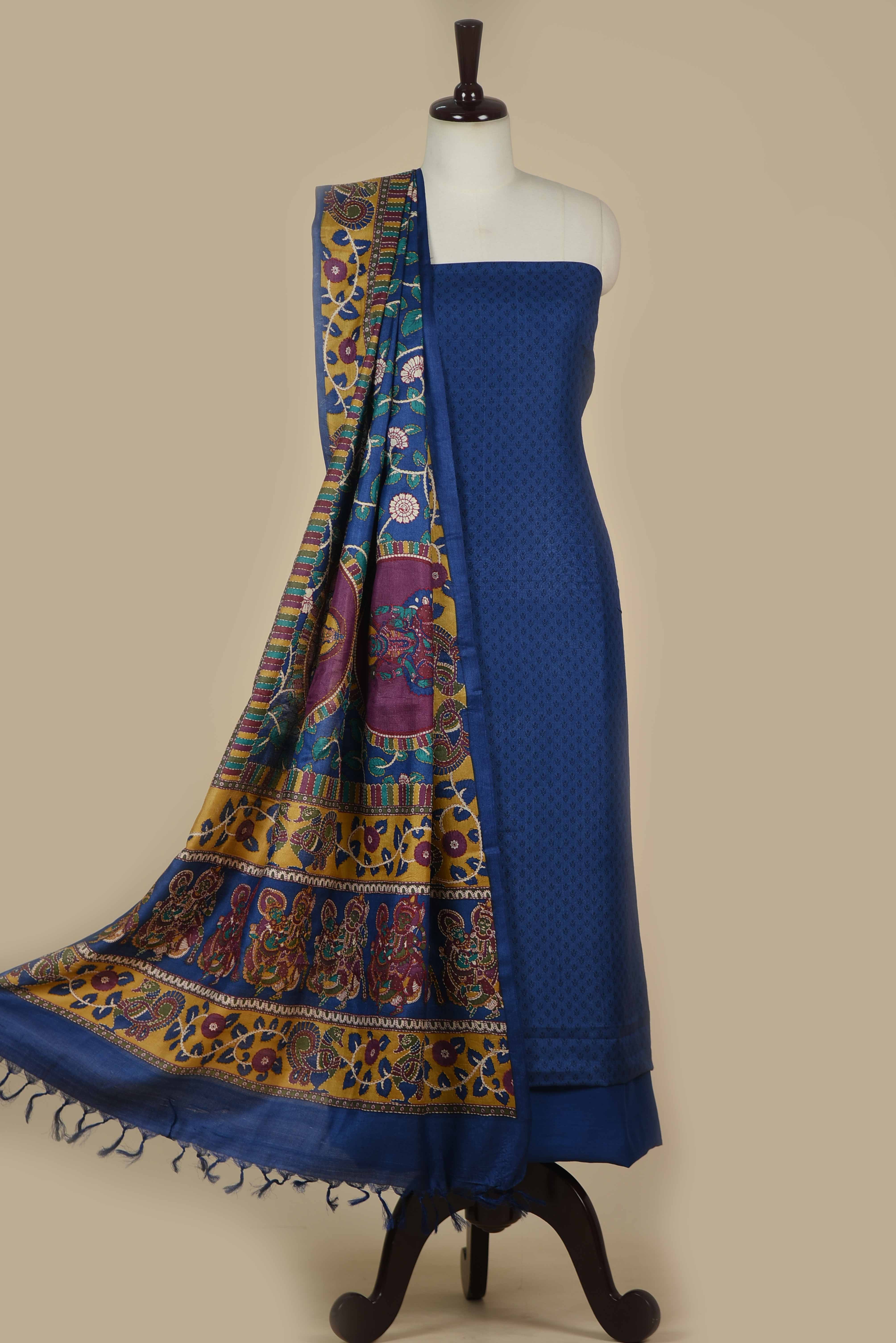 Blue Tussar Silk Printed Unstitched Suit Fabric Set With Tussar Silk Embroidered Dupatta