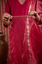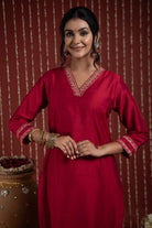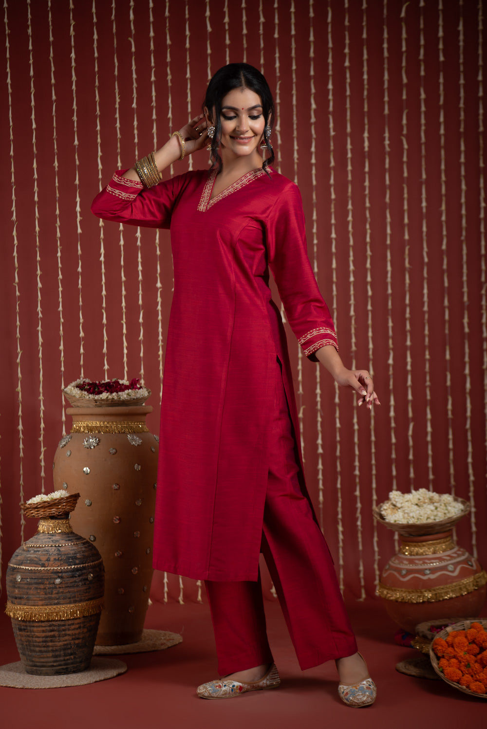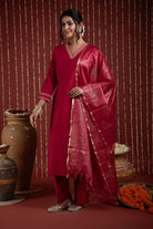Electric Pink Cotton Silk Bordered V-Neck Zari Work Kurta Set Regular Fit