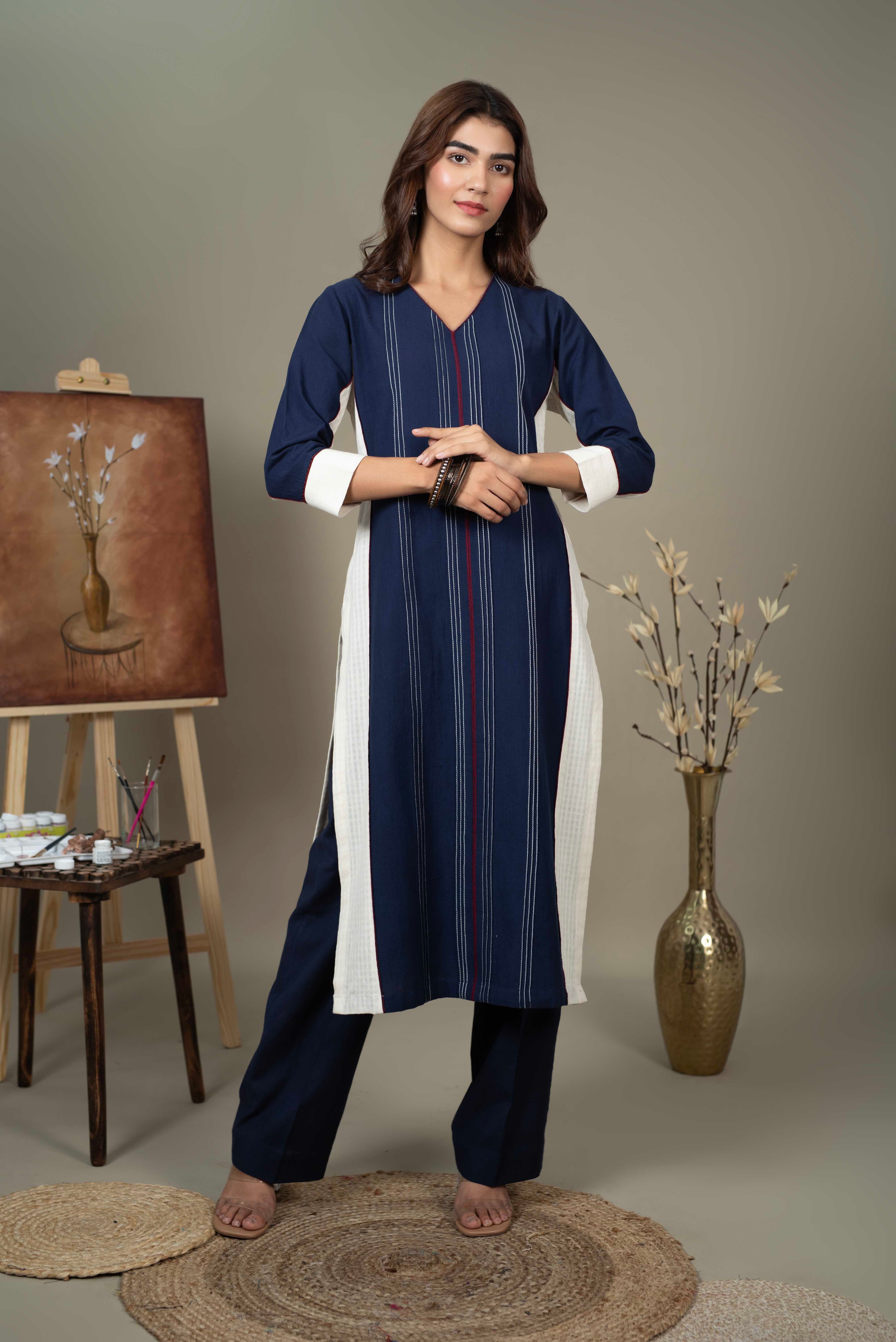 - Embrace understated elegance with our Blue with White Pure Handloom Cotton Straight Kurta Set with Pants – Regular Fit.