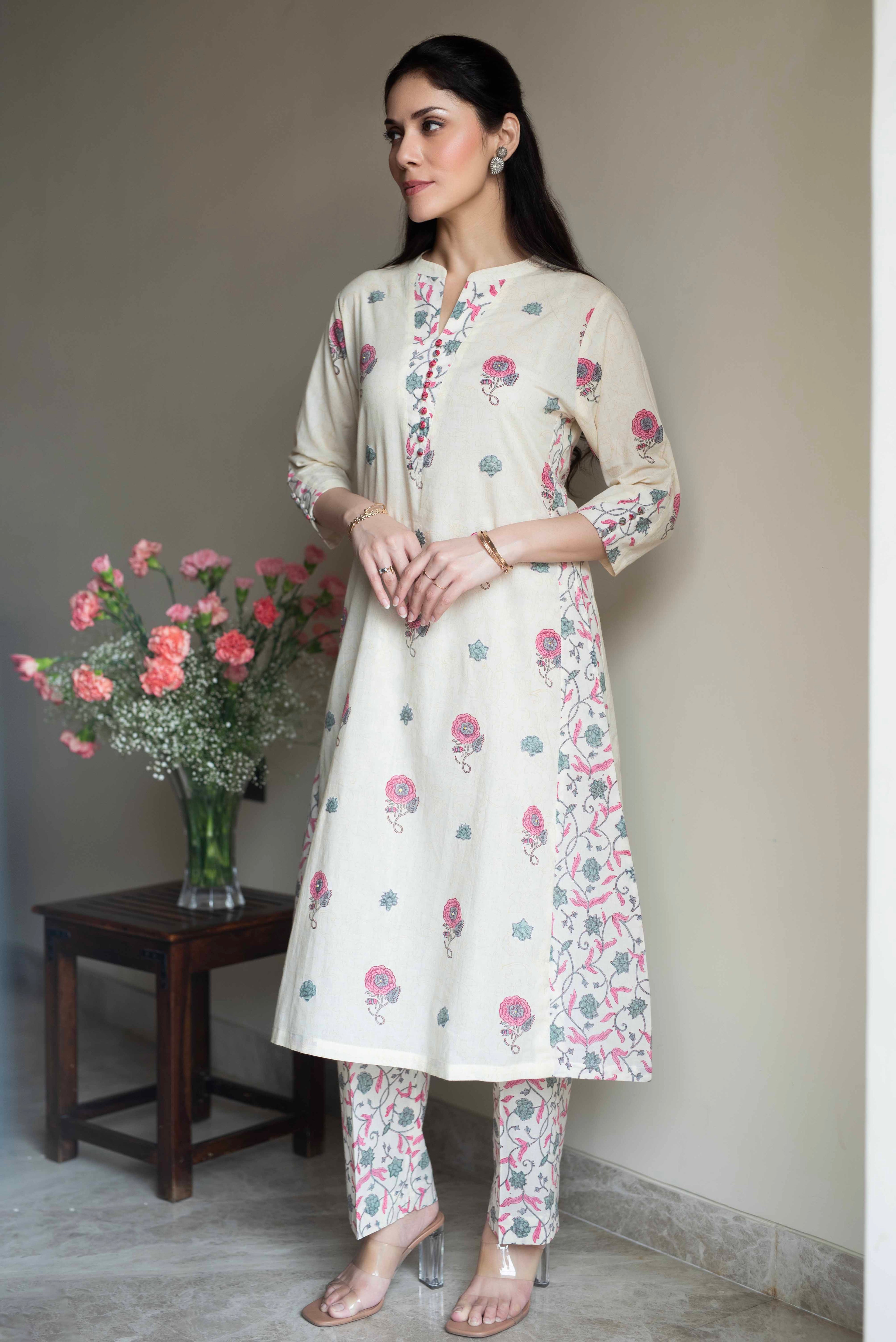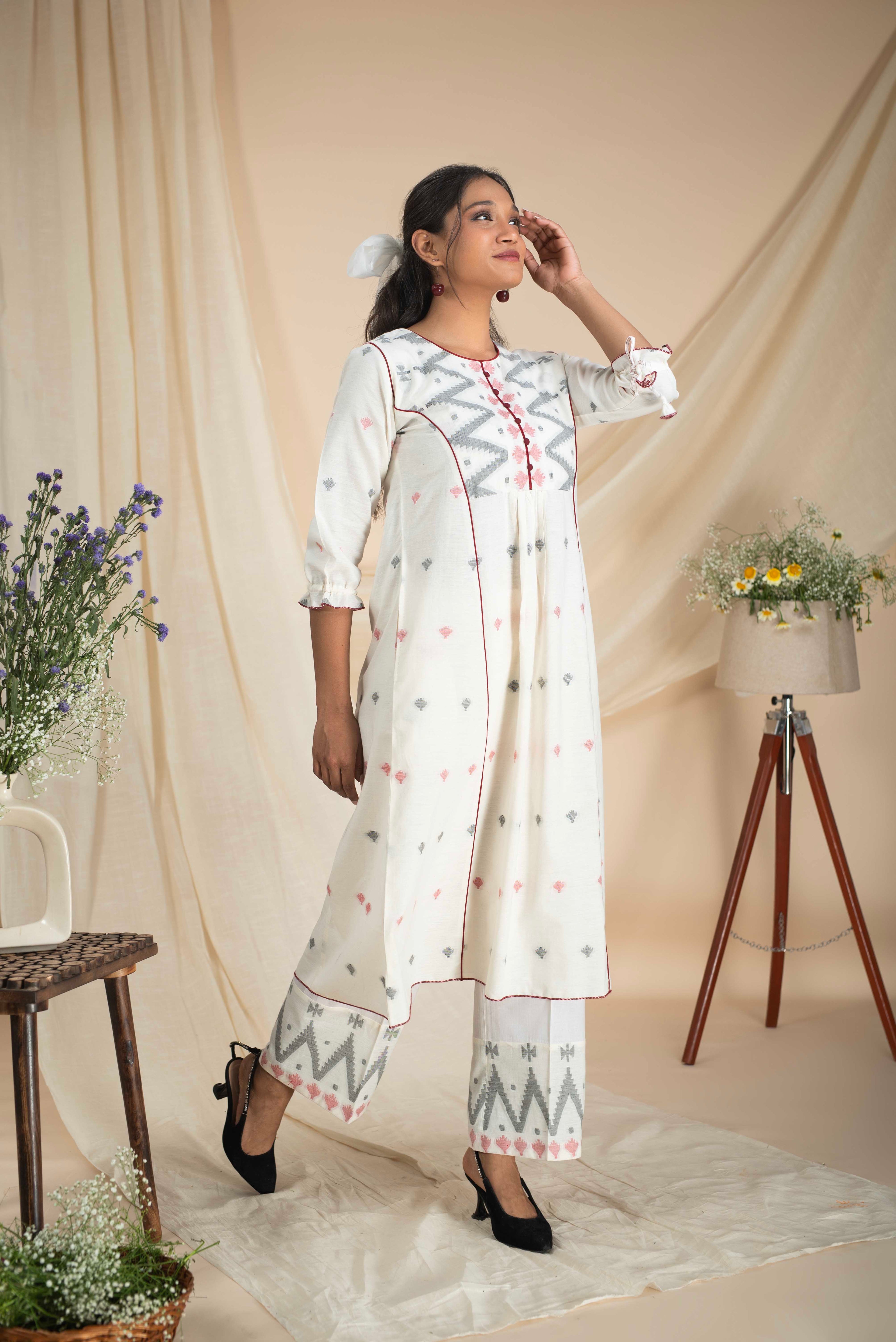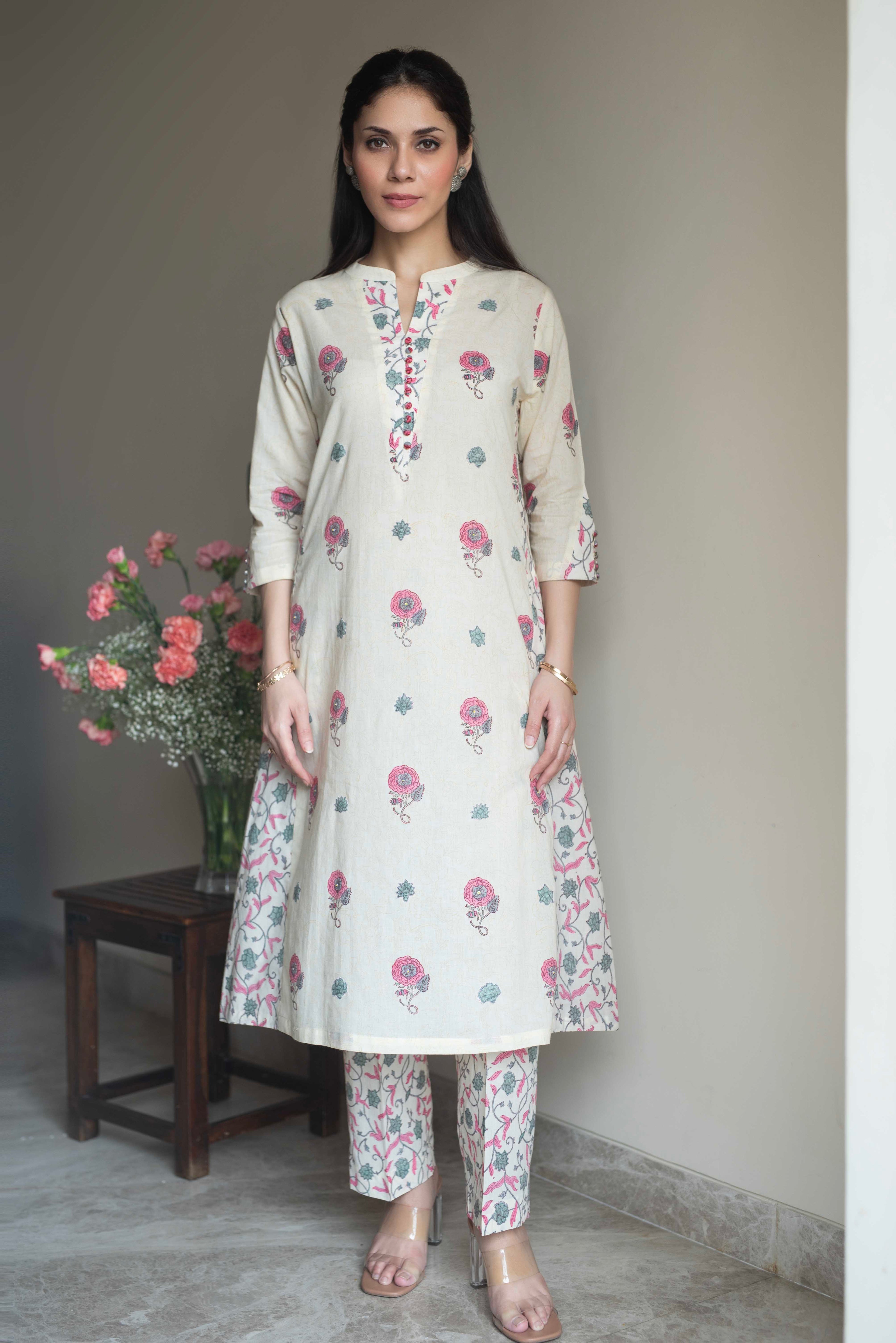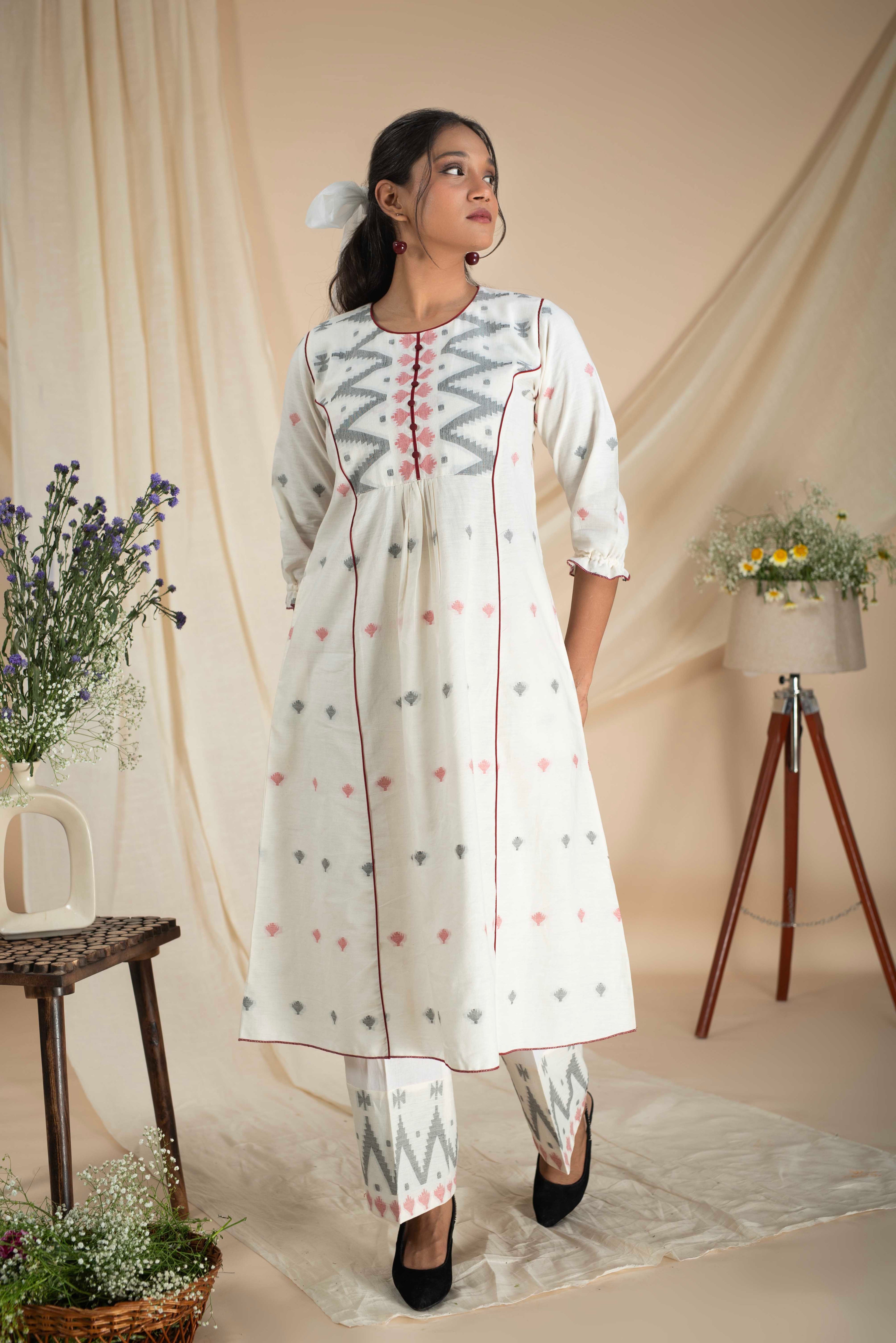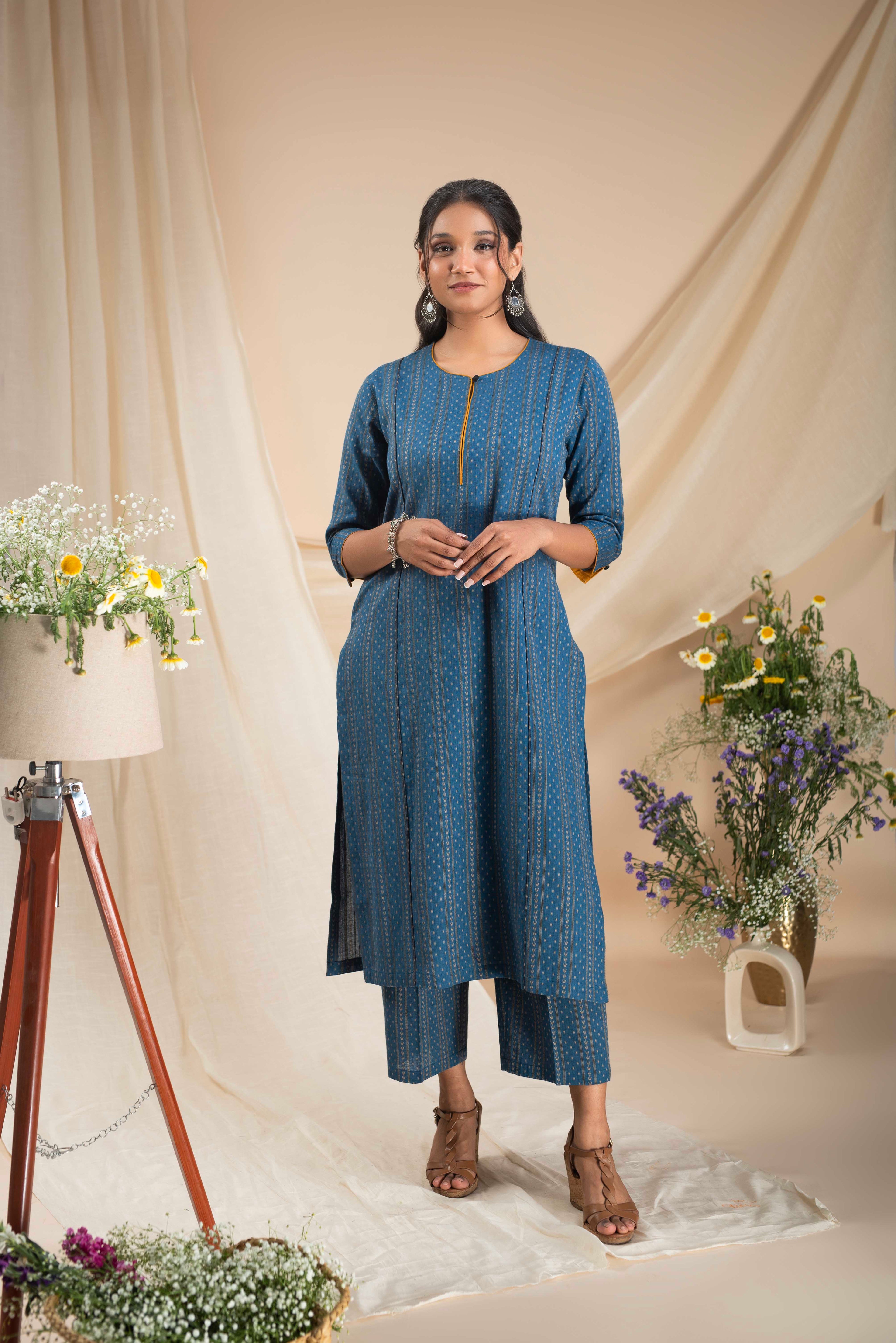 A-Line Kurta Pant Set - Embrace a feminine and flattering silhouette with our A-line kurta pant sets. The A-line cut of the kurta adds a touch of elegance, while the matching pants complete the ensemble for a stylish look.