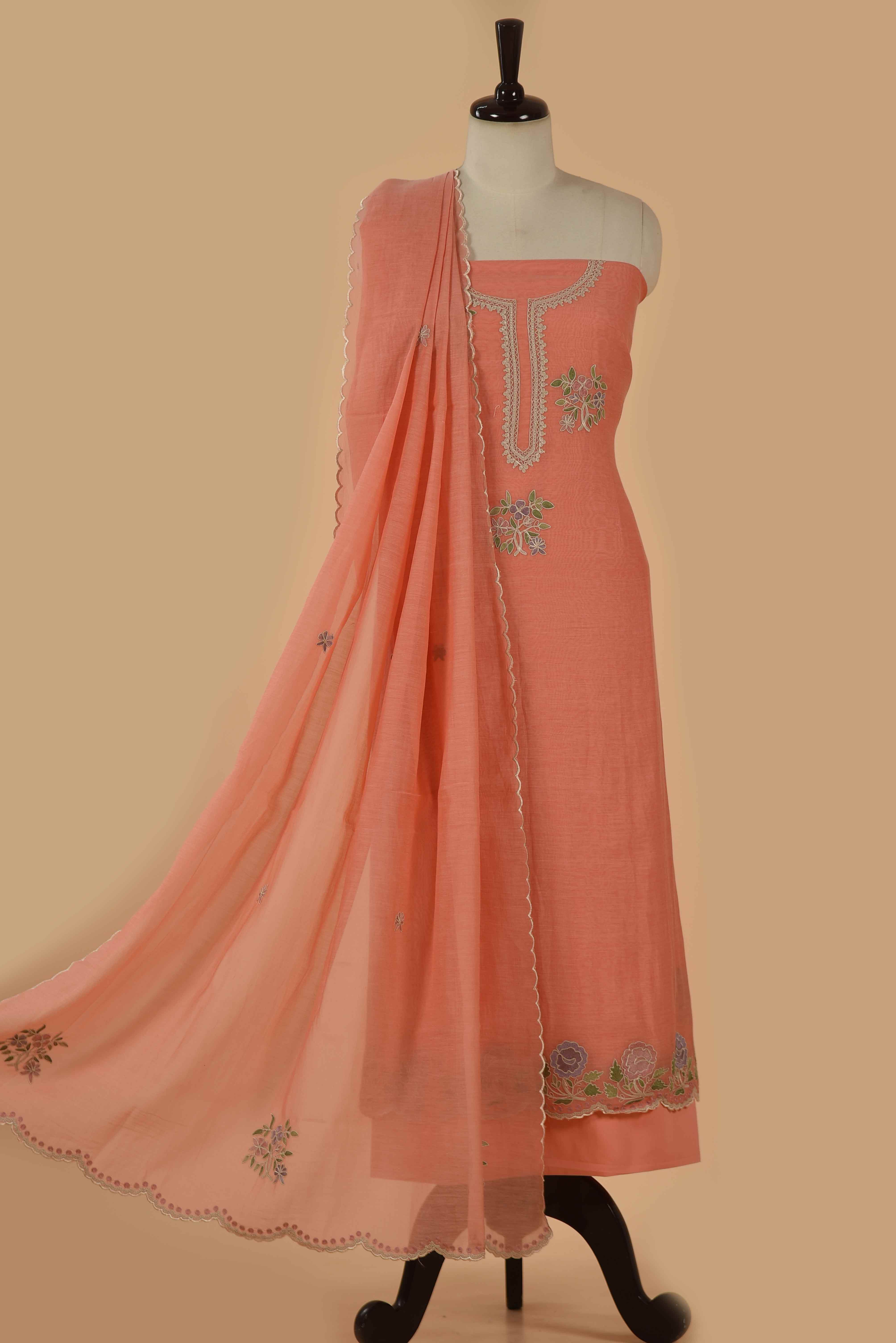 - Made for women who love subtle sophistication with a touch of festive charm, this Peach Mul Chanderi Embroidered Unstitched Suit Fabric Set With Mul Chanderi Embroidered Dupatta is perfect for graceful, effortless dressing.