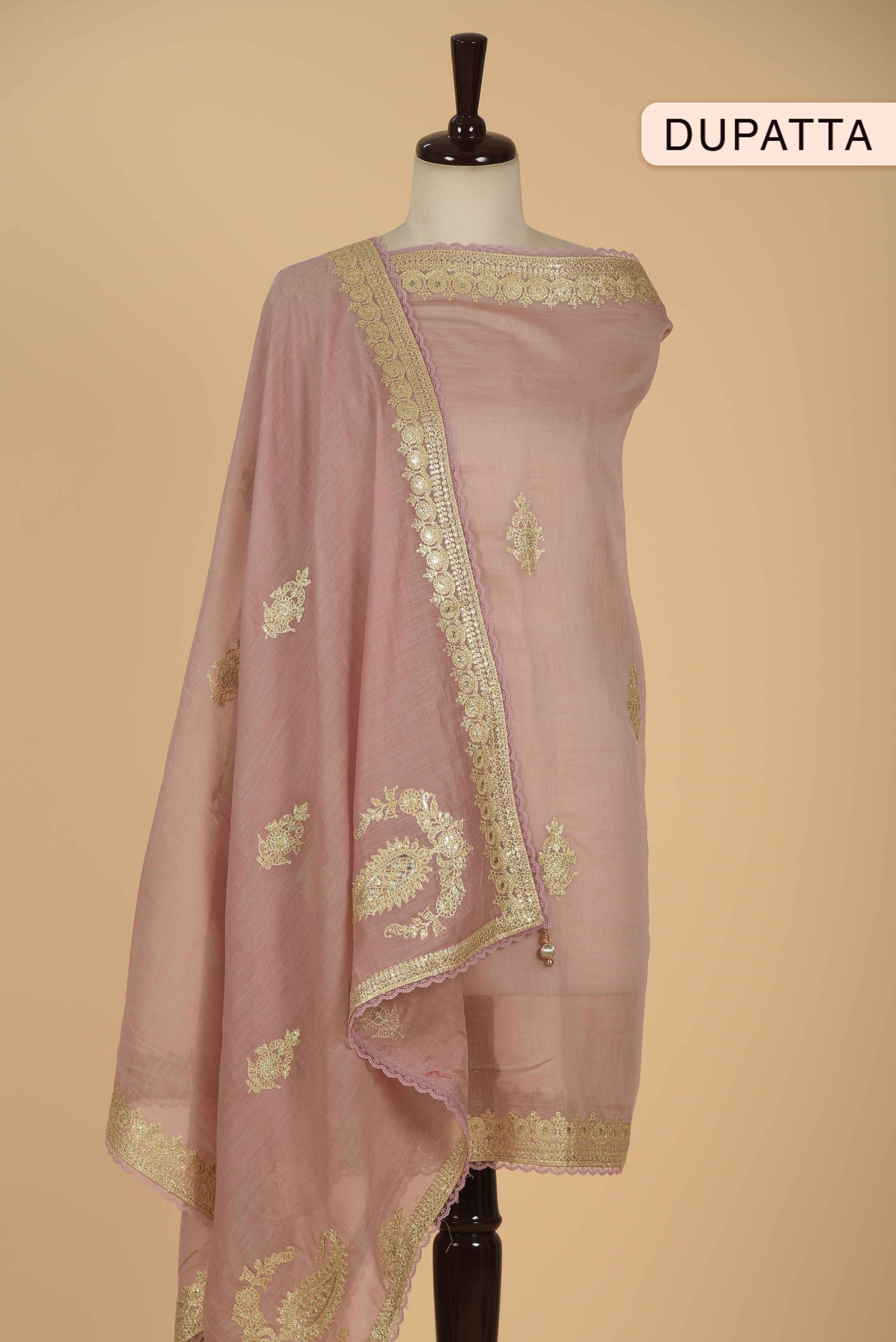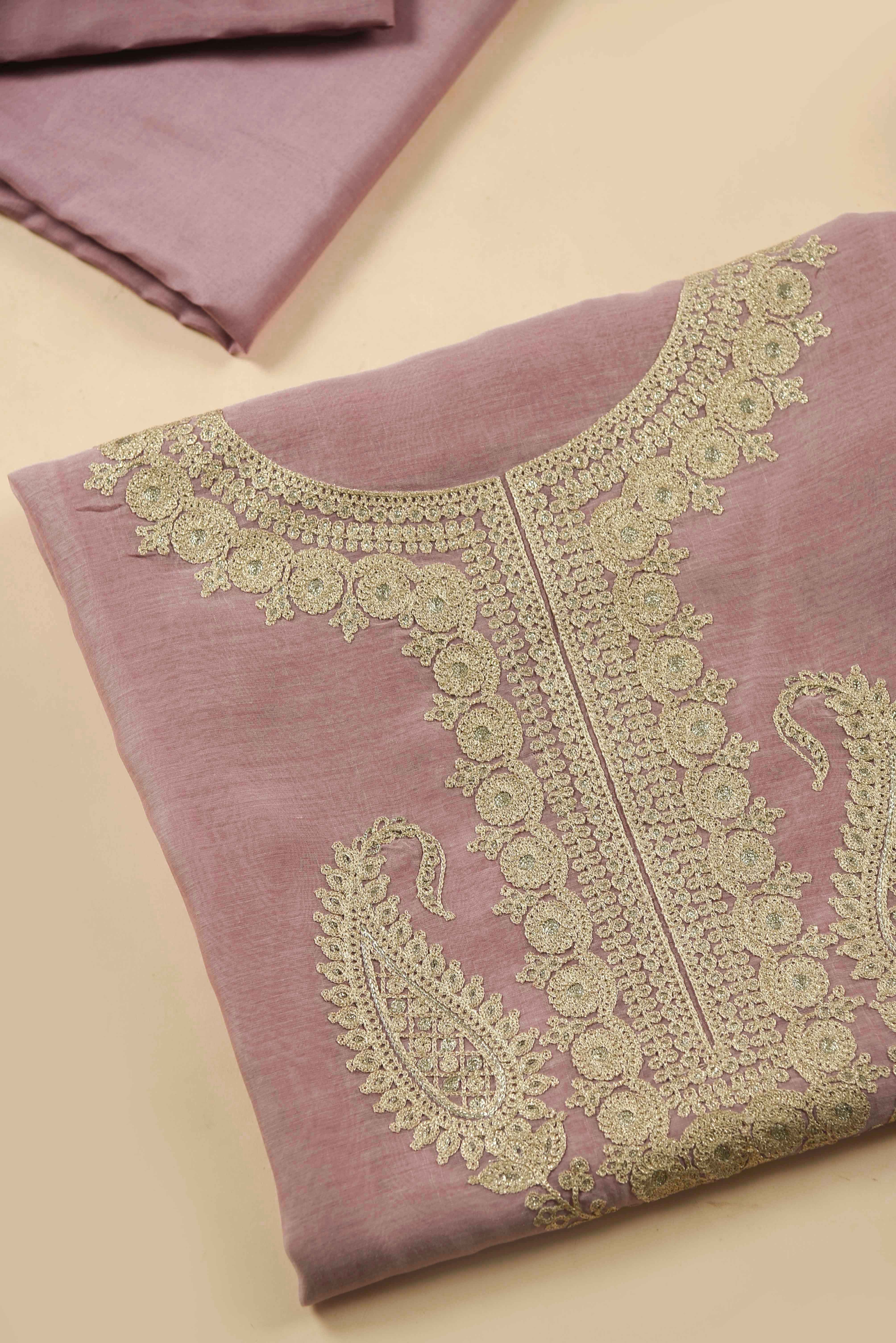 - Make a graceful statement at special occasions with this Pink Mul Chanderi Embroidered Unstitched Suit Fabric Set, designed exclusively for elegant party wear.