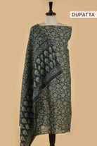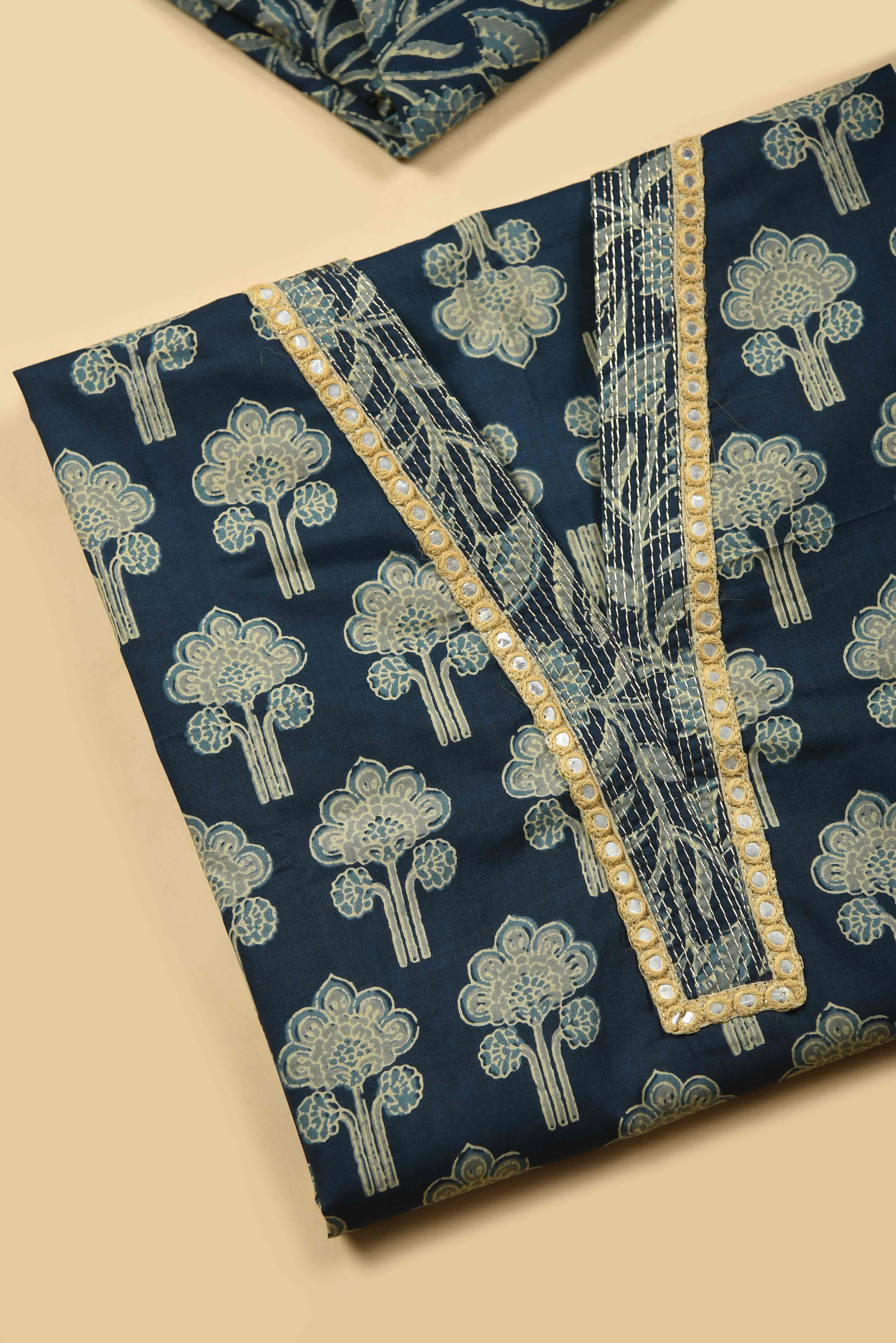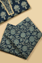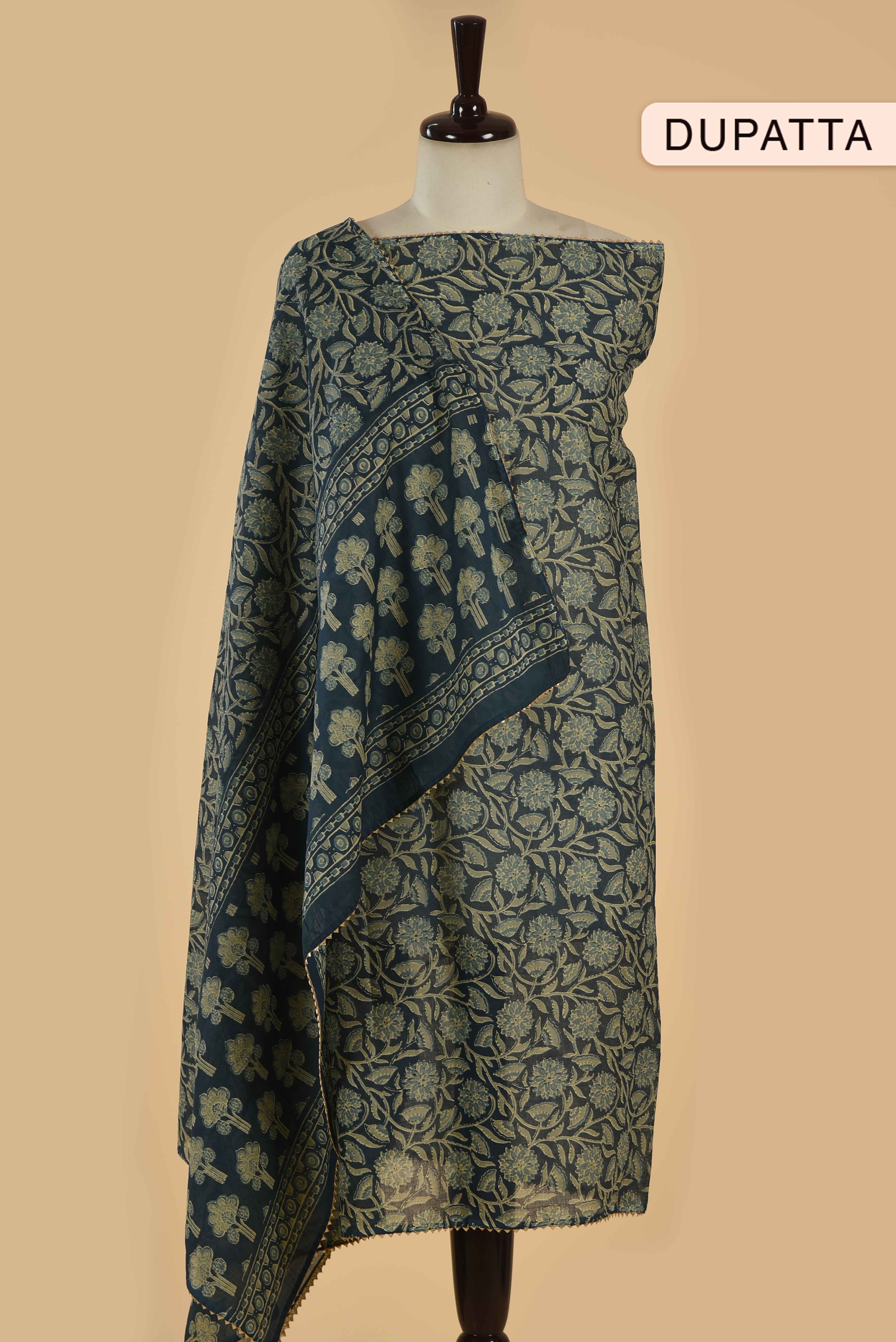Blue Cotton Handblock Printed Unstitched Suit Fabric Set With Cotton Printed Dupatta