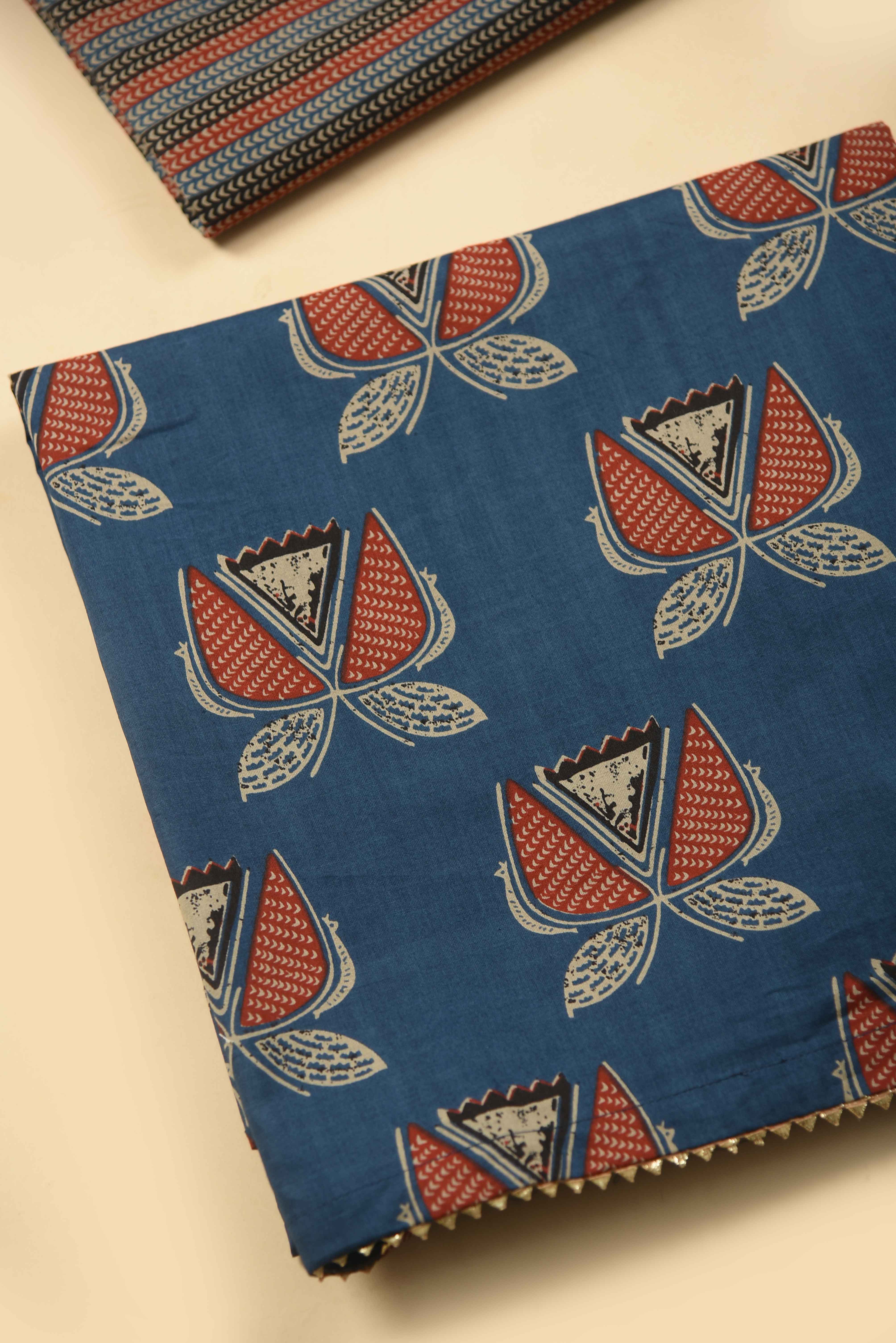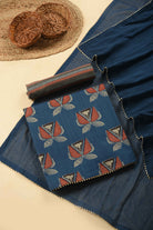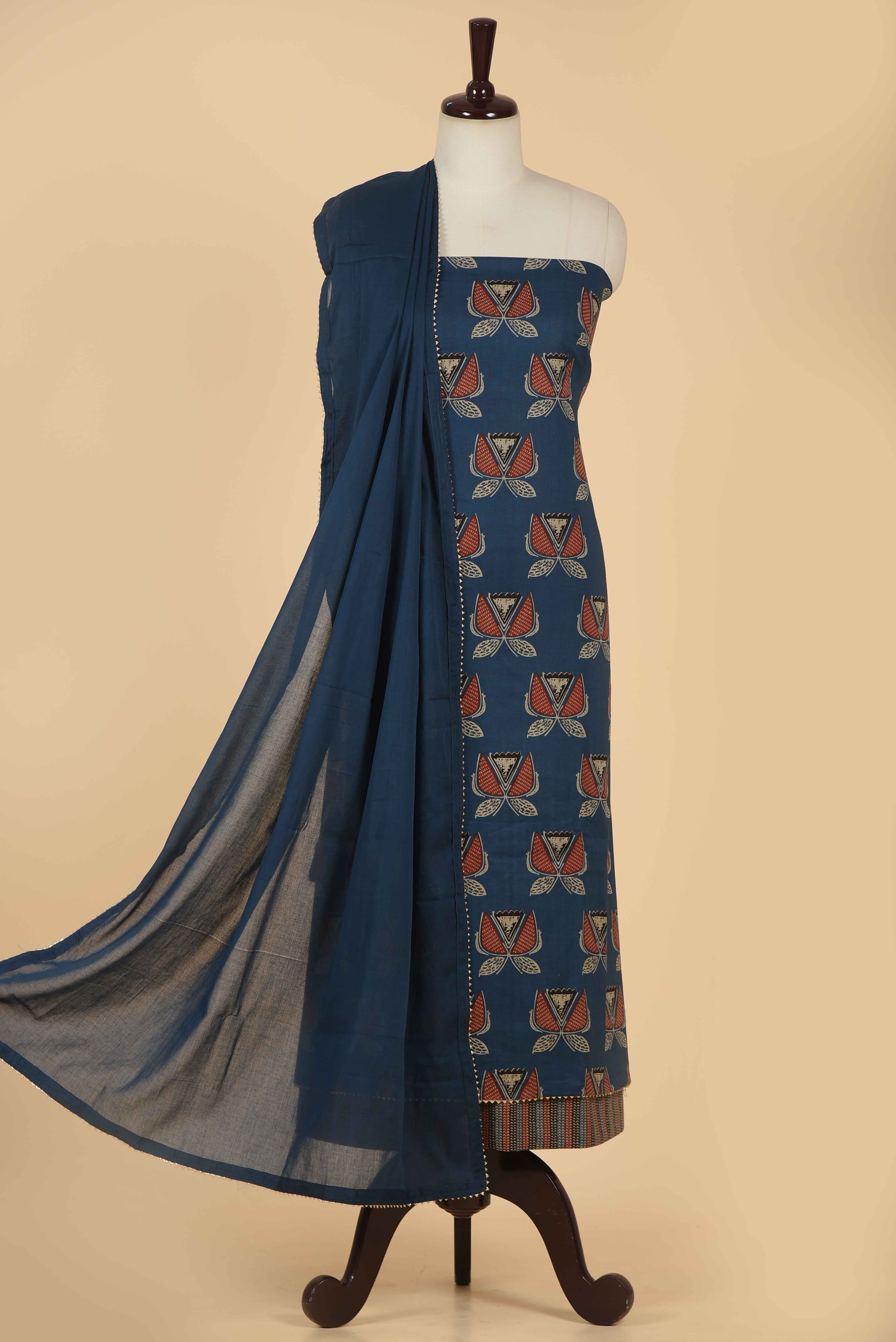 Blue Pure Cotton Hand Block Printed Unstitched Suit Fabric Set With Cotton Printed Dupatta