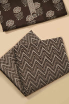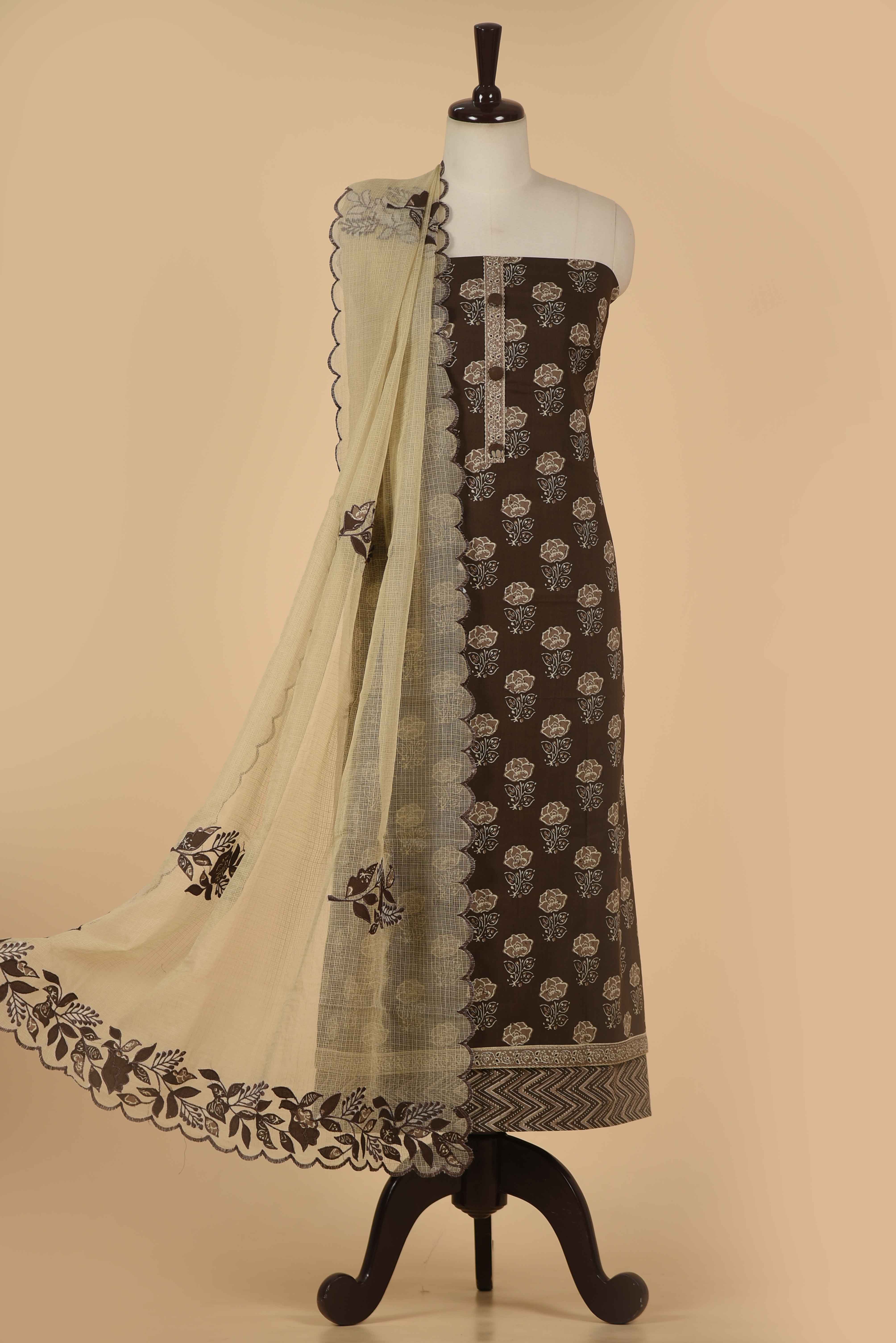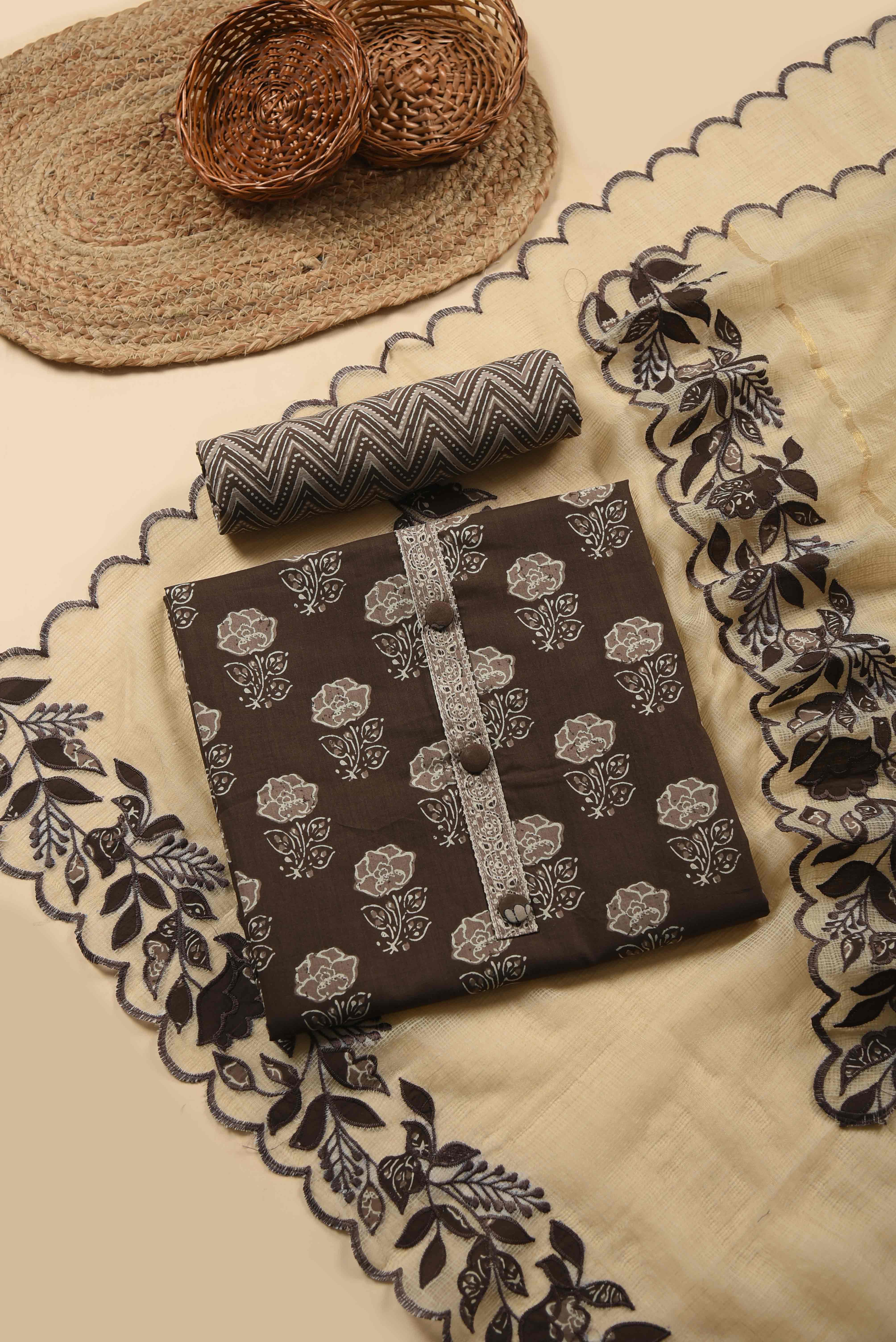 Brown Pure Cotton Hand Block Printed Unstitched Suit Fabric Set With Kota Embroidered Dupatta - II