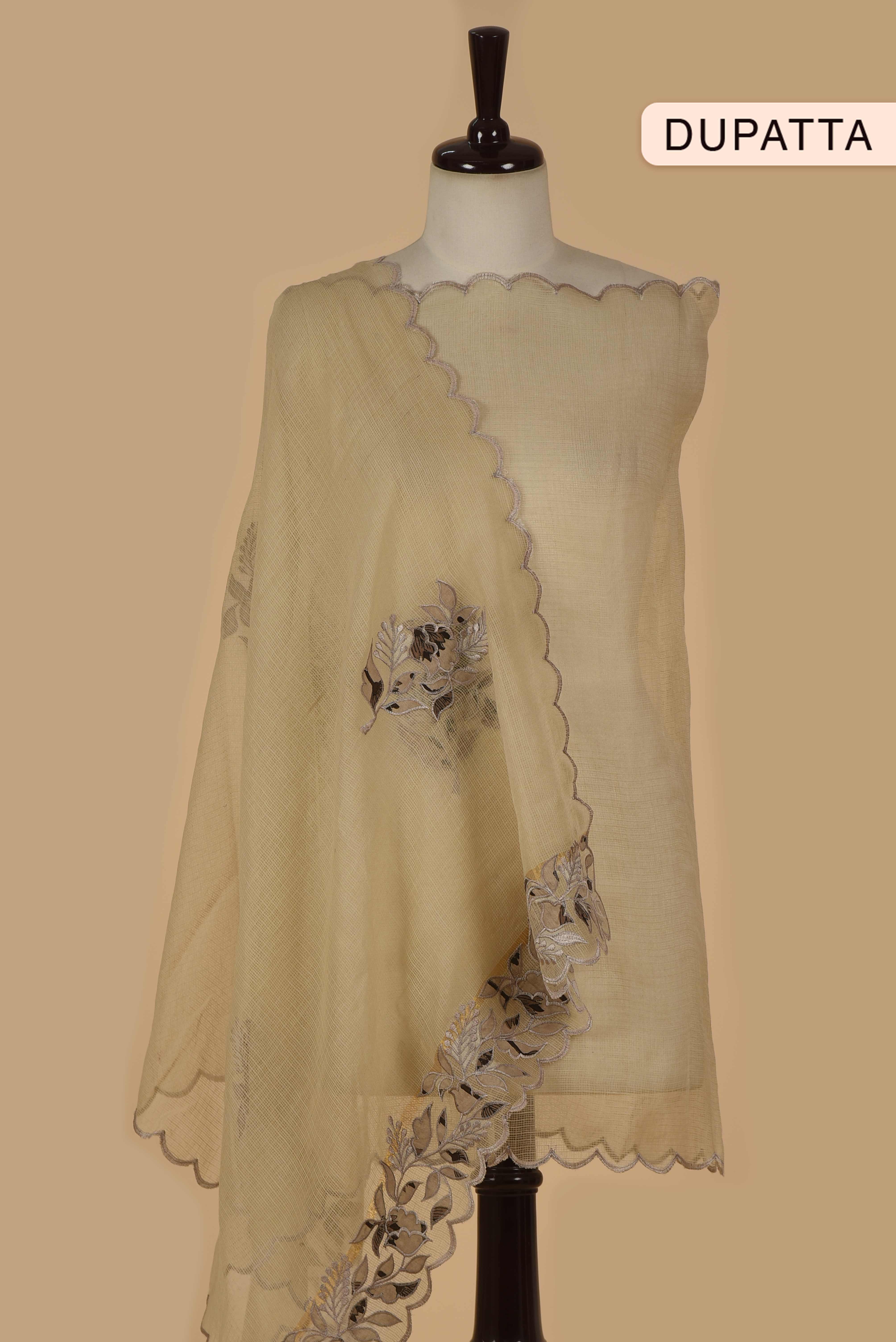 • The set is paired with a lightweight Kota dupatta, beautifully enhanced with delicate embroidery and scalloped edges, adding a touch of sophistication and charm.