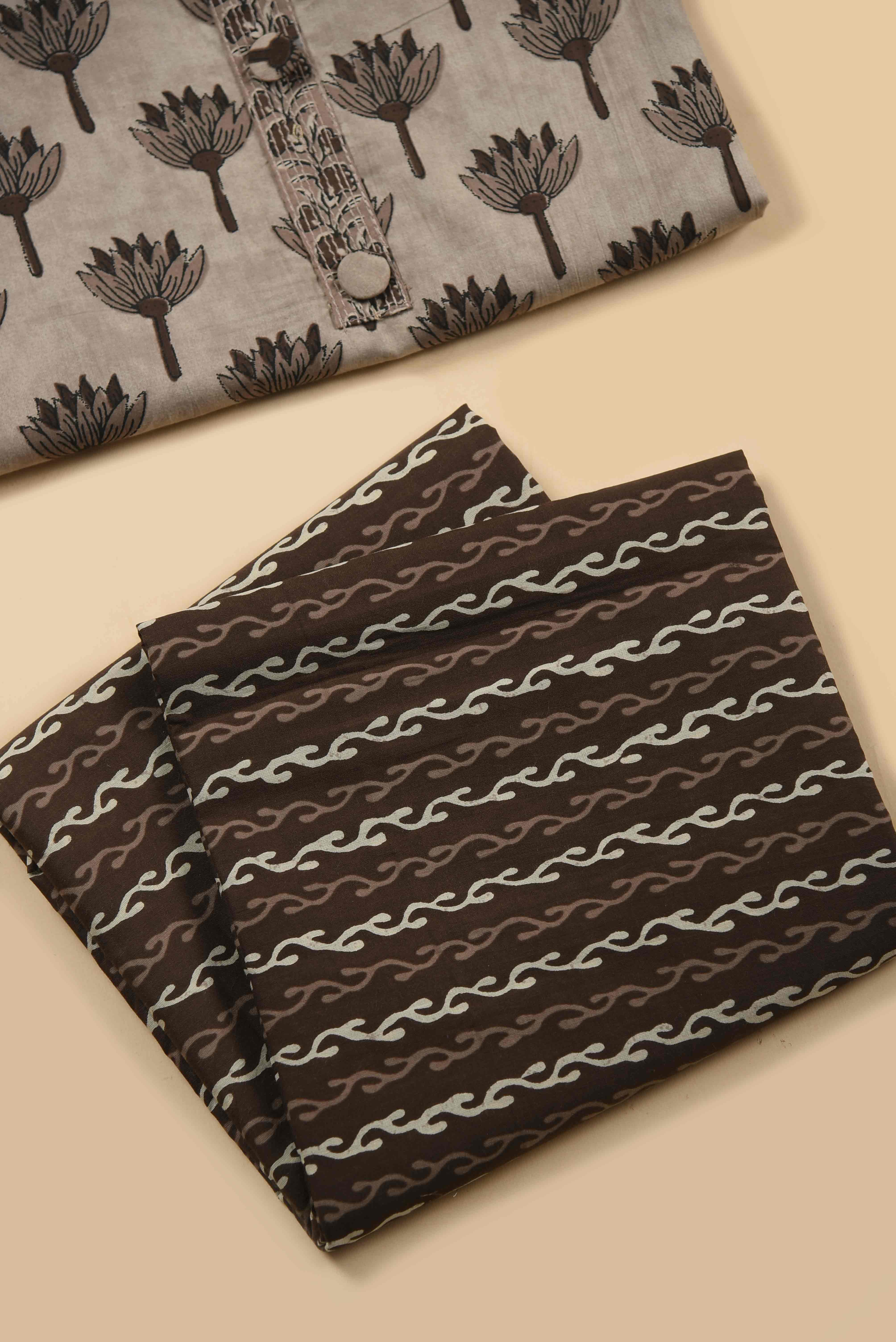 • Celebrate the beauty of traditional craftsmanship with this elegant brown suit set, adorned with intricate hand block printed floral motifs.