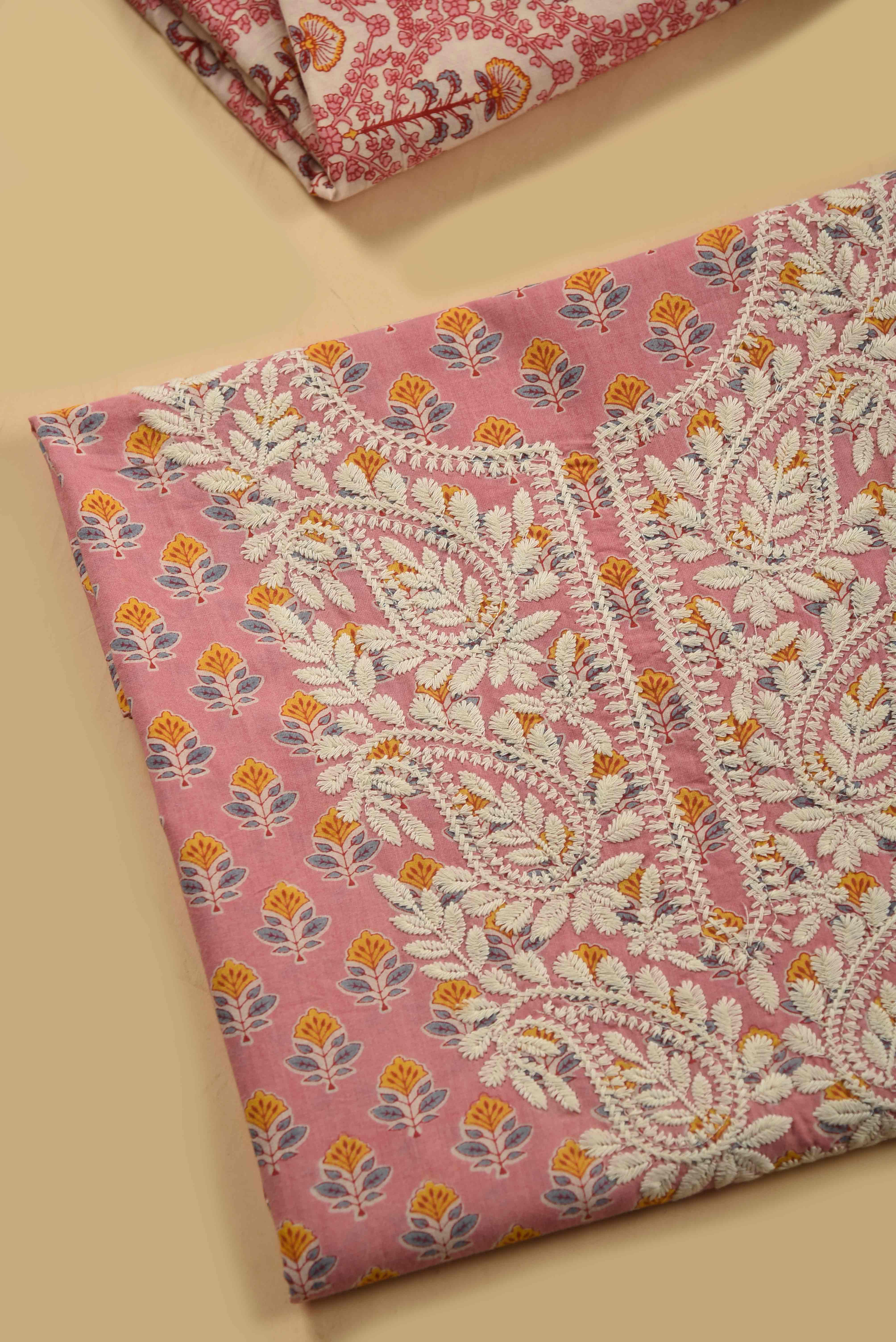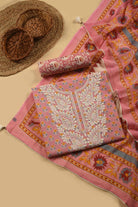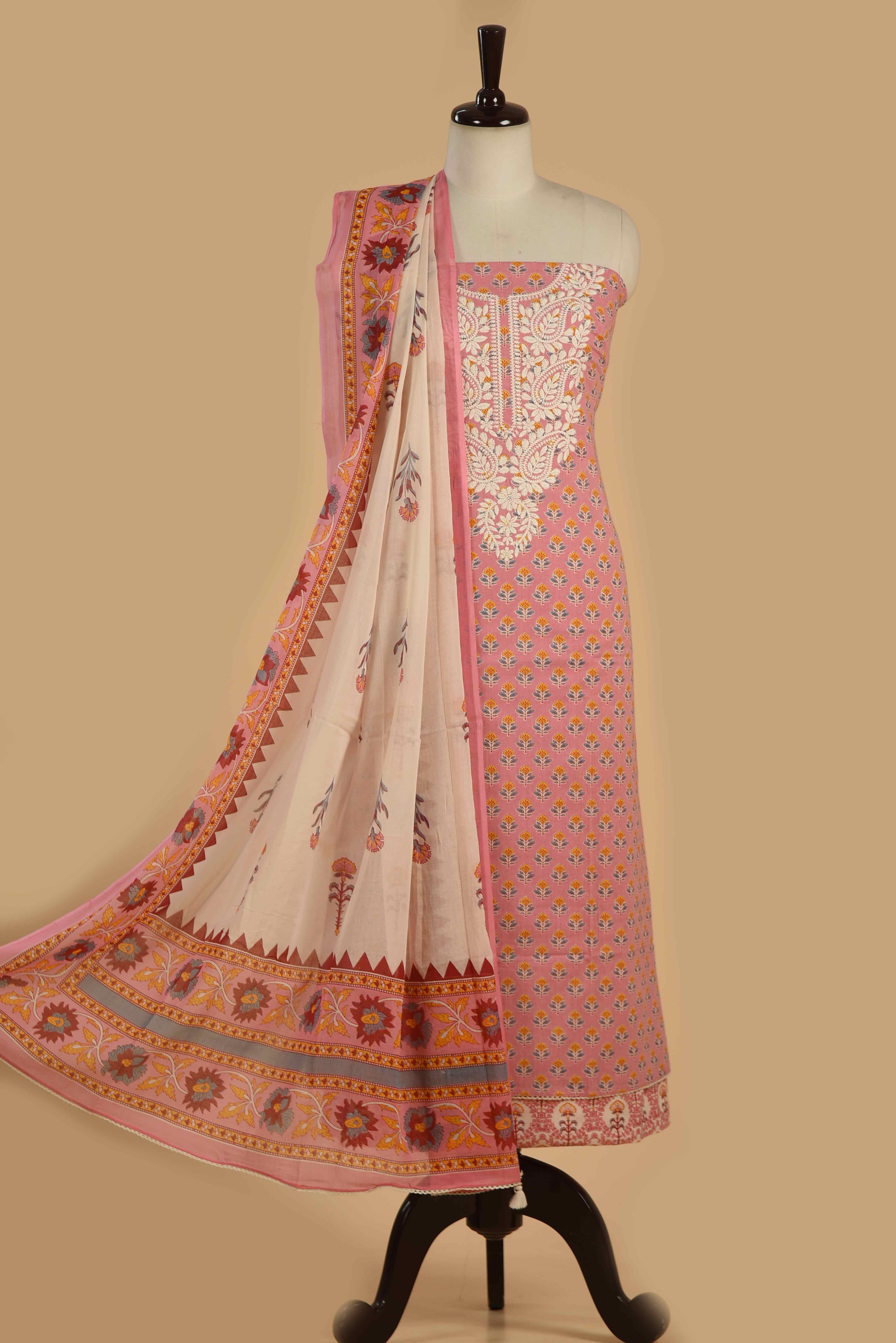 Pink Pure Cotton Printed With Embroidered Unstitched Suit Fabric Set With Cotton Printed Dupatta
