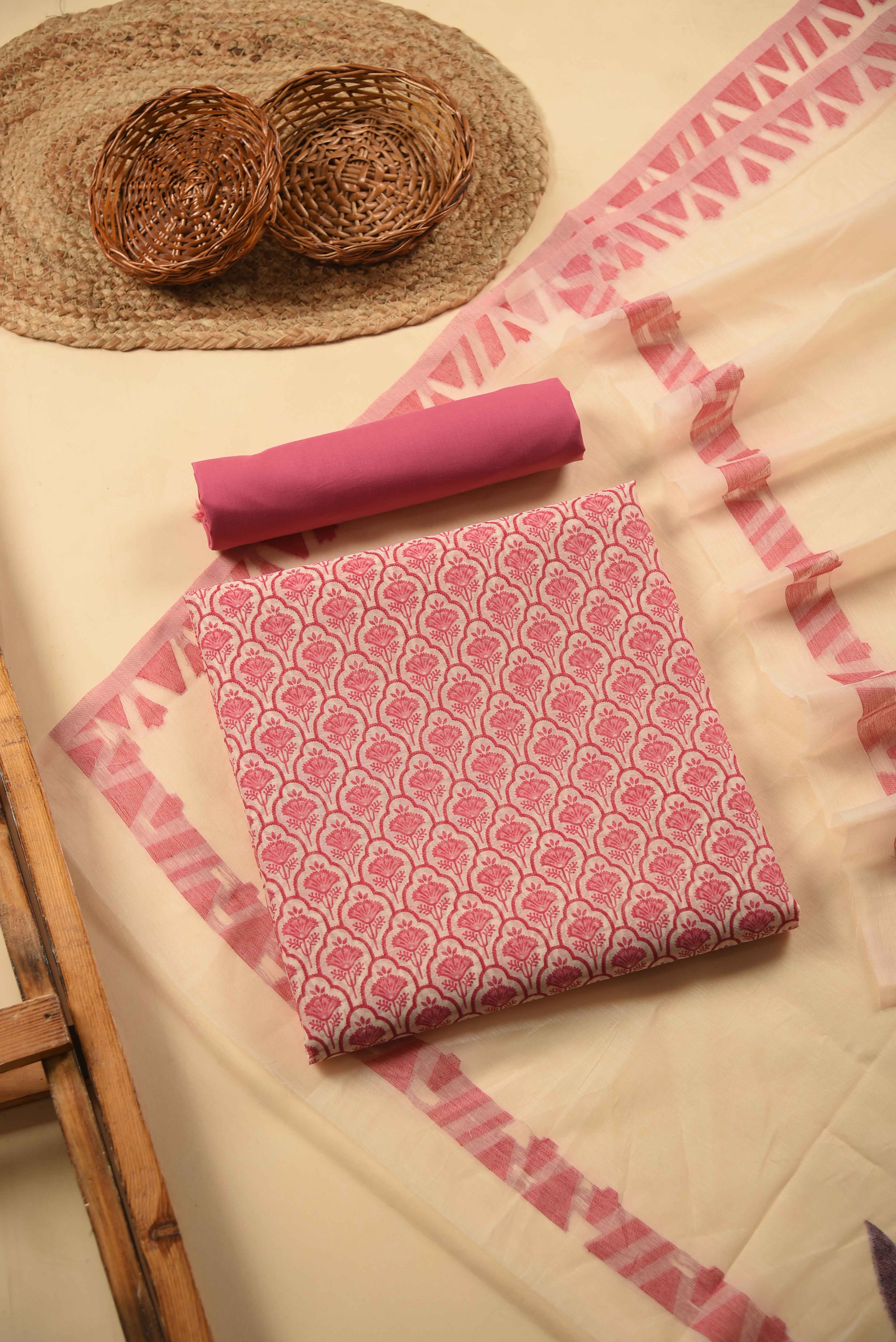 - Beige with Pink Chanderi Blend Printed Unstitched Suit Fabric Set with Chanderi Printed Dupatta Understated and refreshing, this suit fabric set pairs a soft beige base with soothing Pink prints for a graceful everyday look.