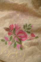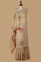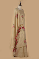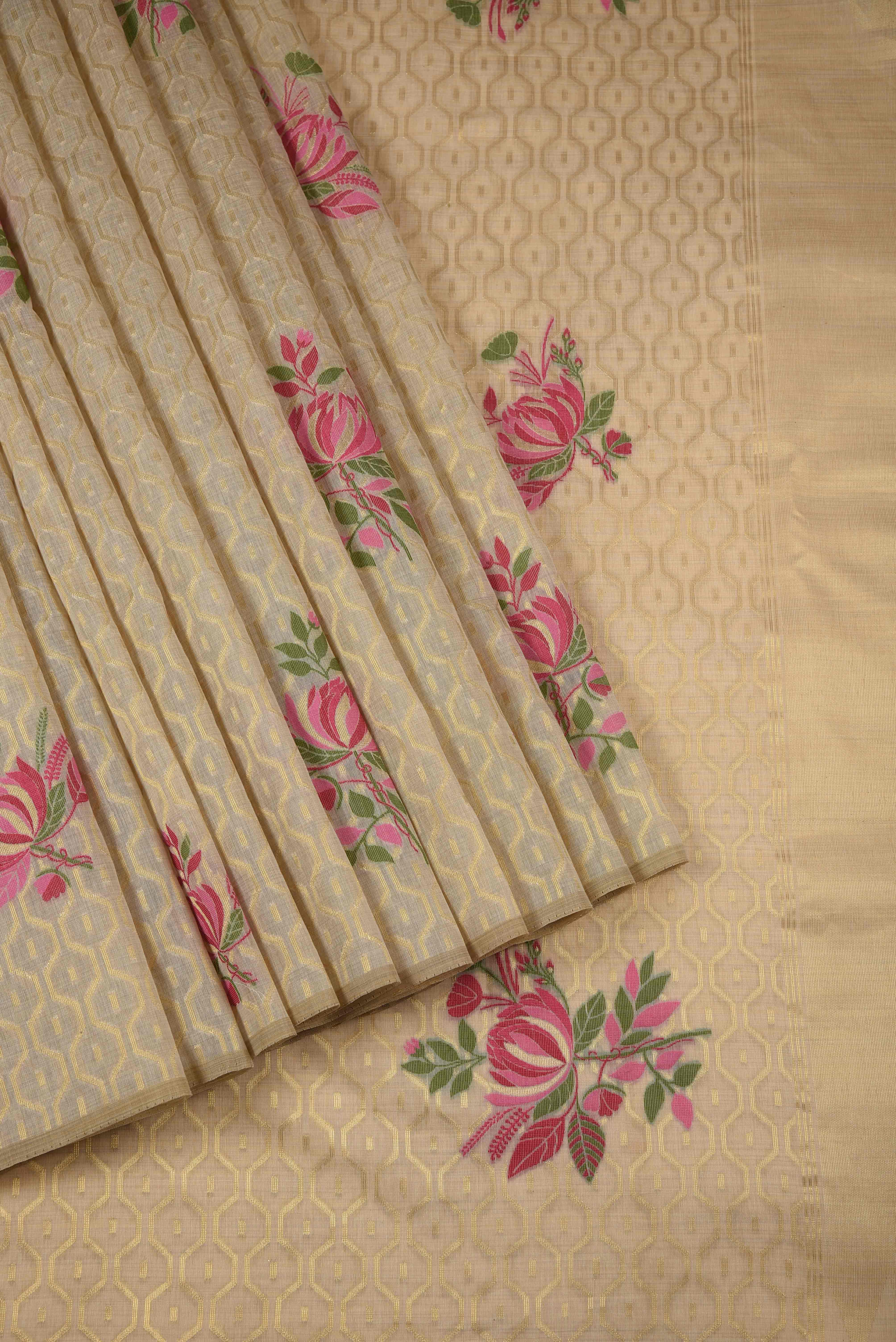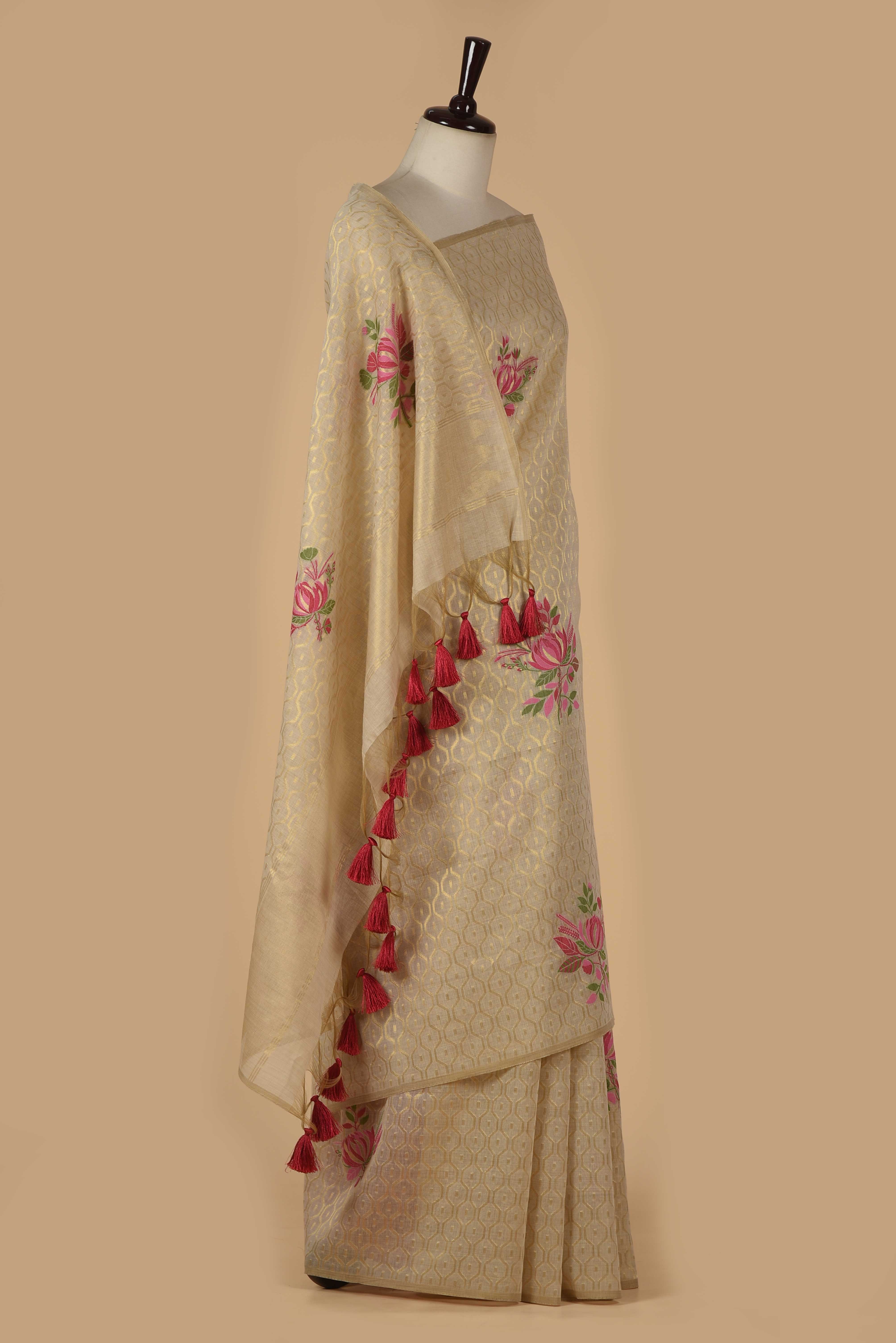 - Gracefully elegant and timeless, this beige saree with pink woven detailing showcases delicate floral motifs that add a touch of subtle charm.