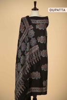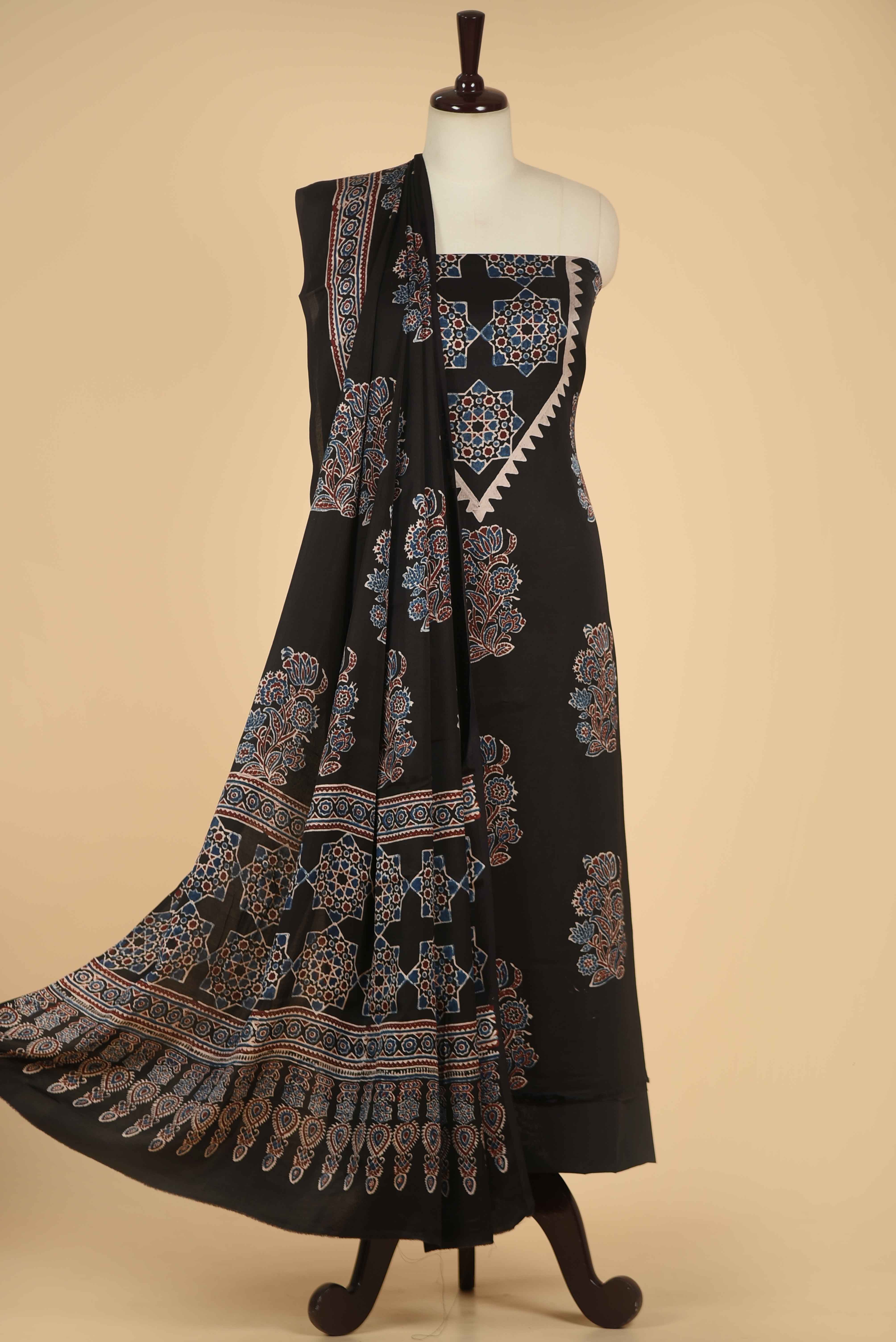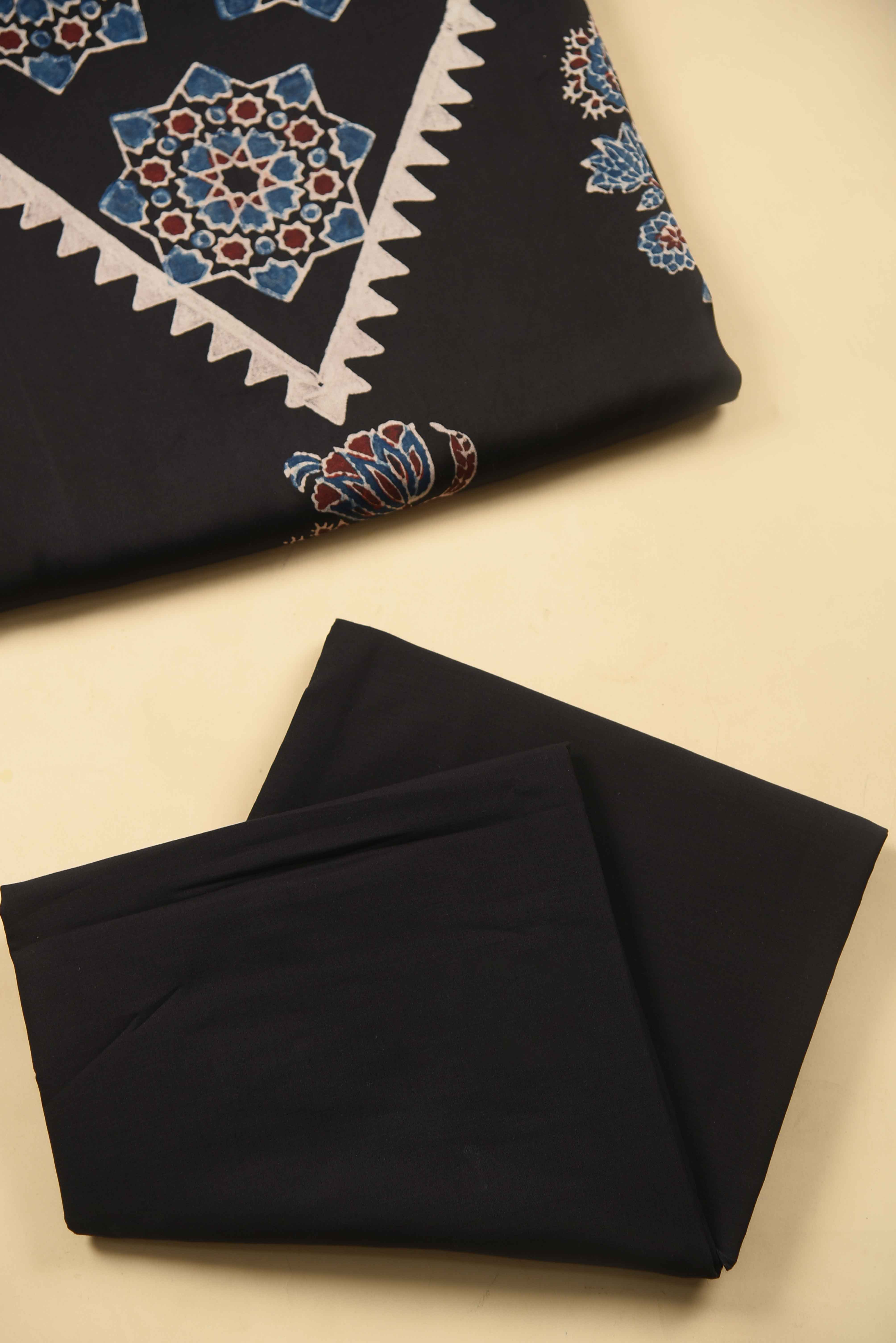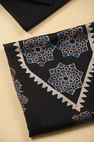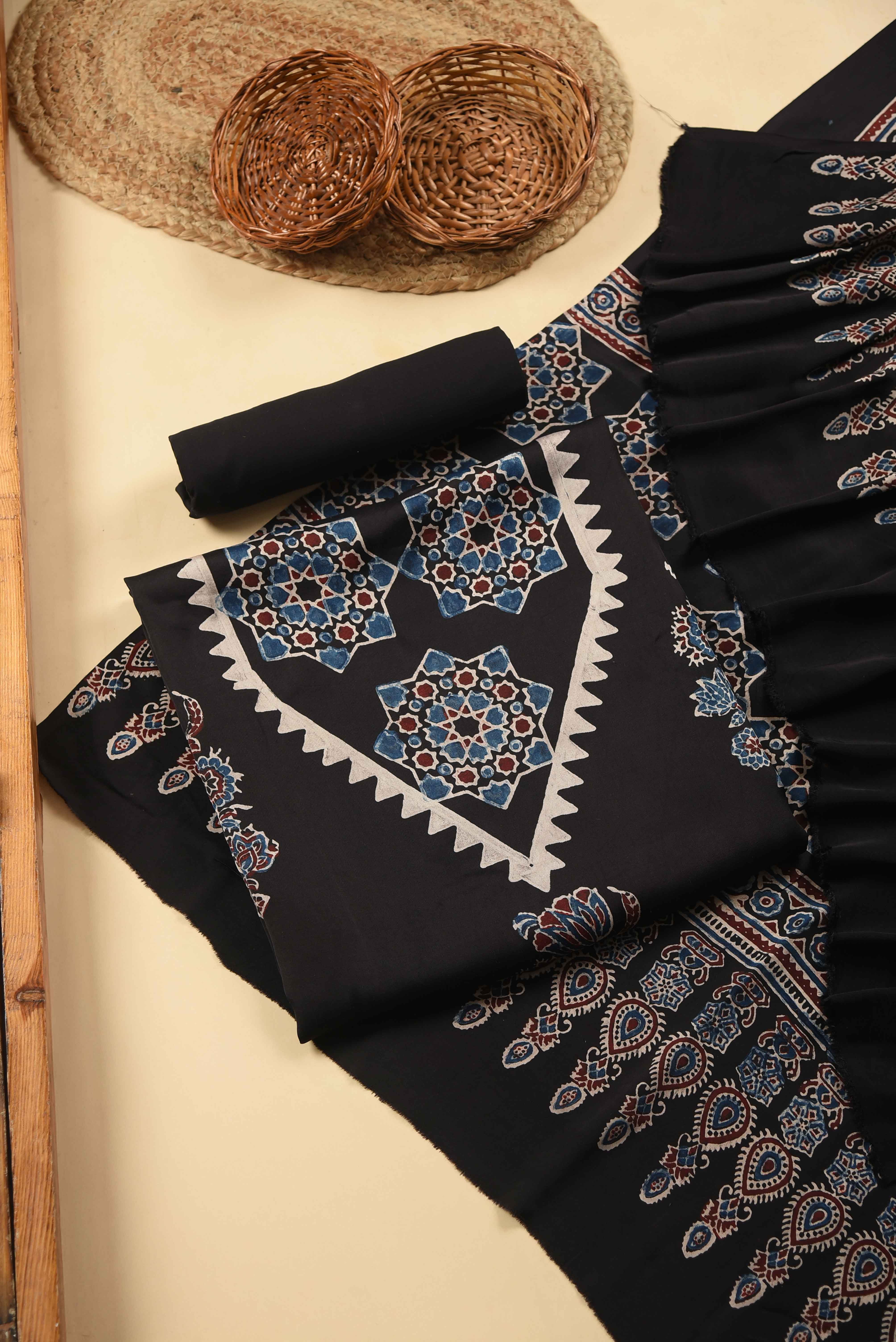 - Make a bold yet graceful statement with this Black Modal Silk Printed Unstitched Suit Fabric Set, inspired by timeless Ajrak artistry.