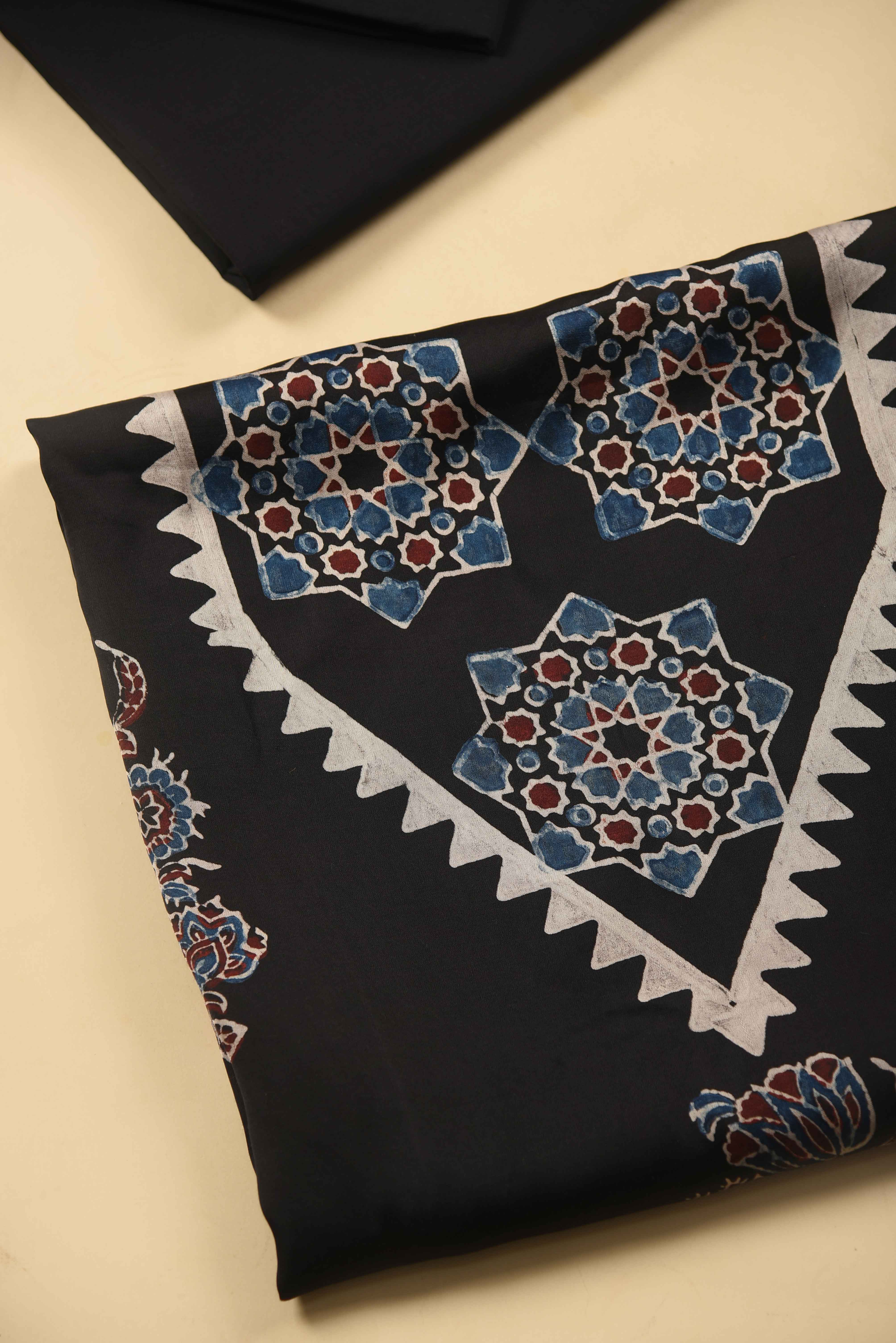 - The rich black base is beautifully adorned with traditional Ajrak prints, reflecting heritage craftsmanship with a contemporary appeal.