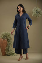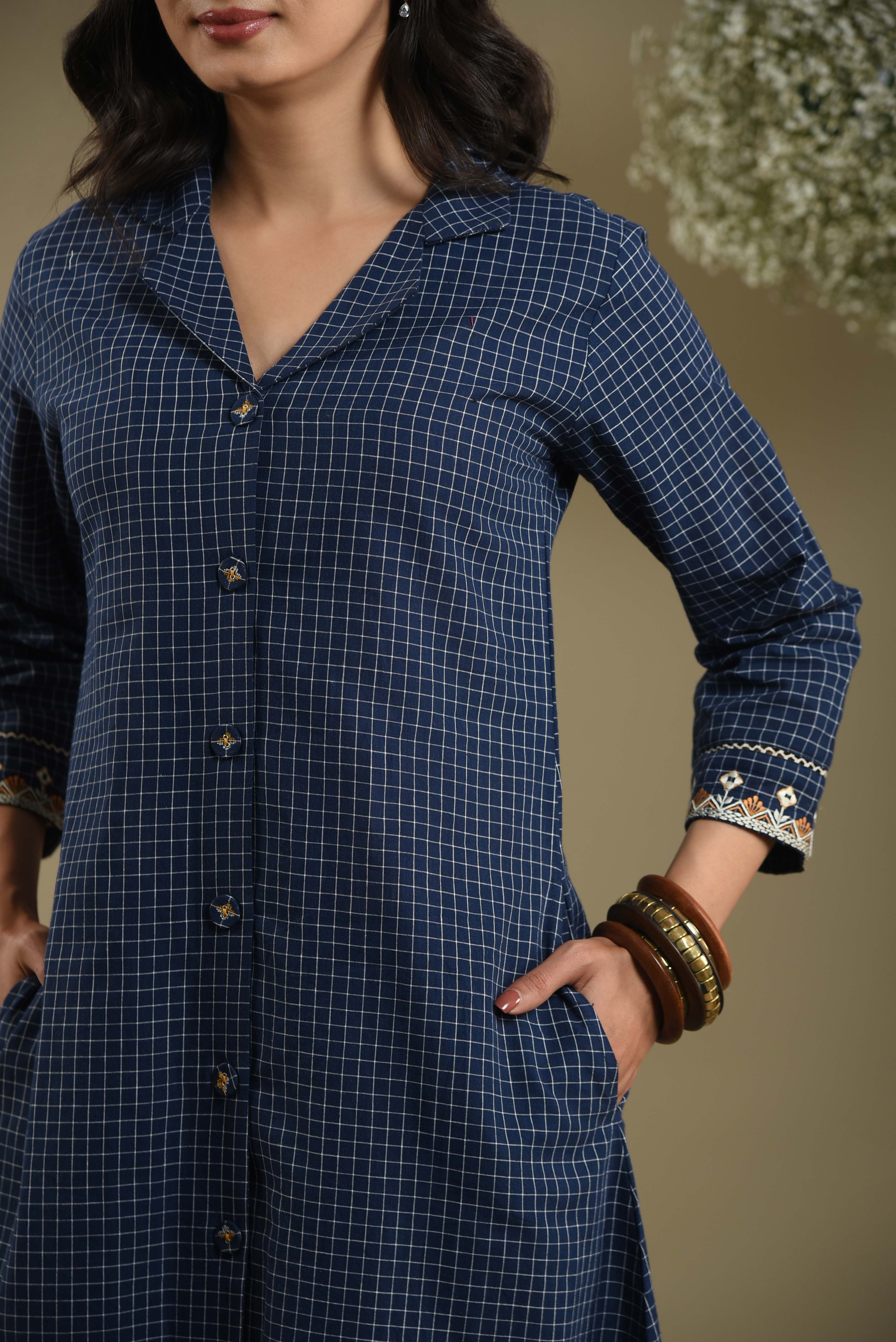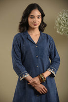 This blue woven cotton checked A-line kurta set is designed to offer a smart and sophisticated look, perfect for everyday office wear.