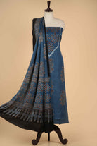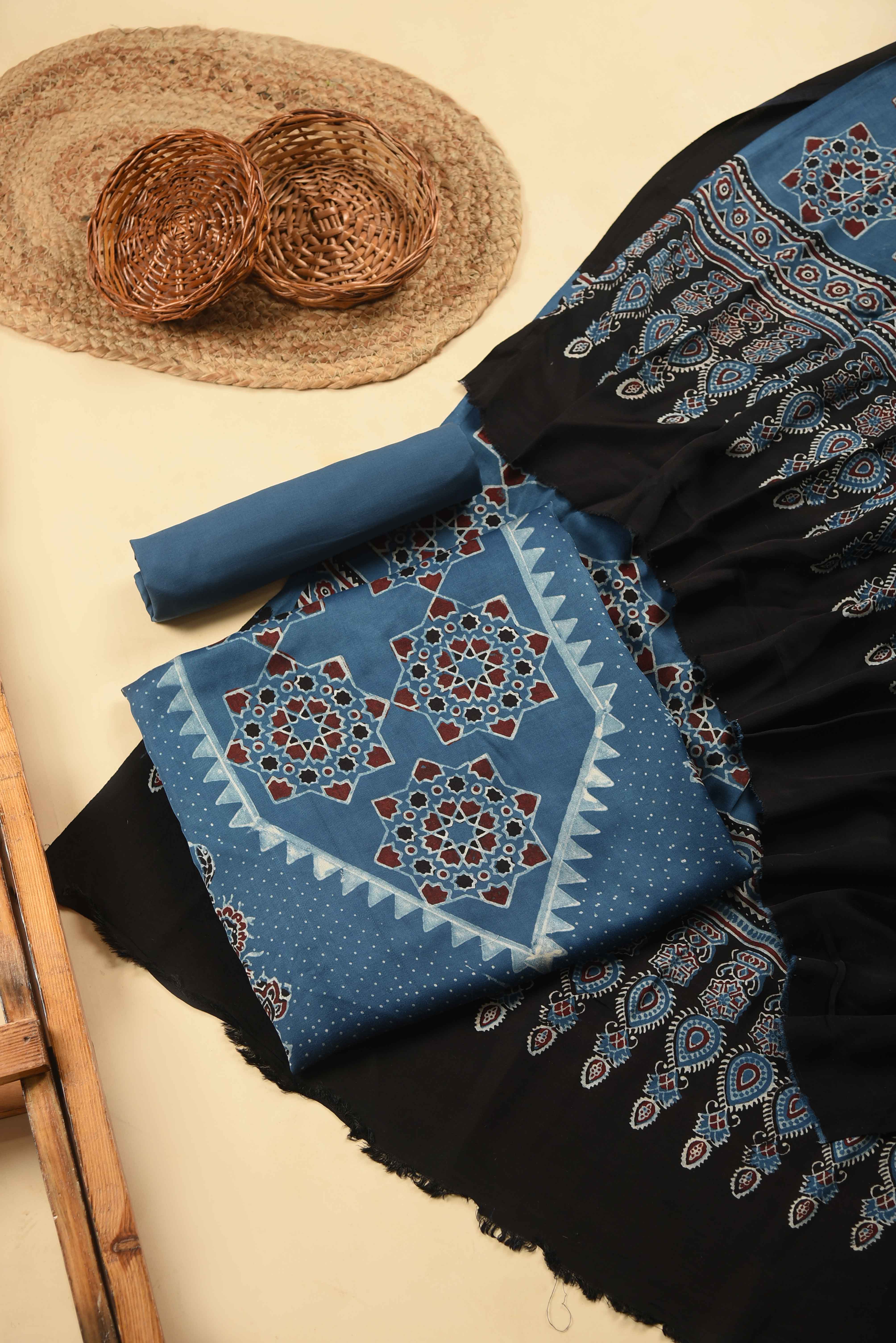 - Make a bold yet graceful statement with this Blue Modal Silk Printed Unstitched Suit Fabric Set, inspired by timeless Ajrak artistry.