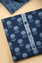 Blue Pure Cotton Hand Block Printed Unstitched Suit Fabric Set With Cut Work kota Dupatta