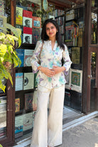Cream & Green Linen Blend Floral Co-ord Set with Long Wide Leg Pants - Relaxed Fit