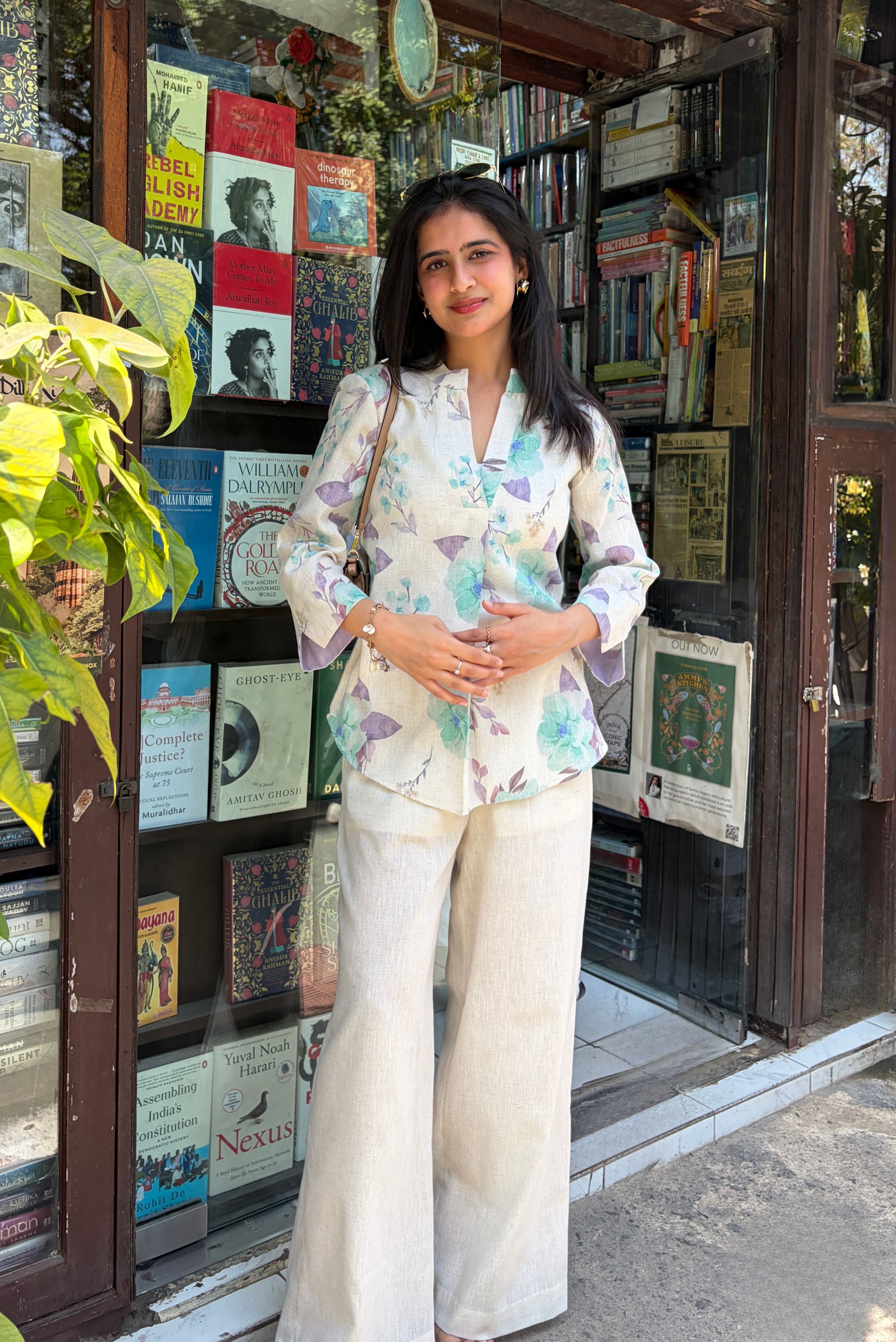 The digitally printed floral top in harmonious Cream and Green tones features a distinctive Mandarin collar and three-quarter sleeves, creating a refined yet relaxed silhouette.