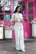 Cream & Pink Linen Blend Floral Co-ord Set with Long Wide Leg Pants - Relaxed Fit