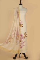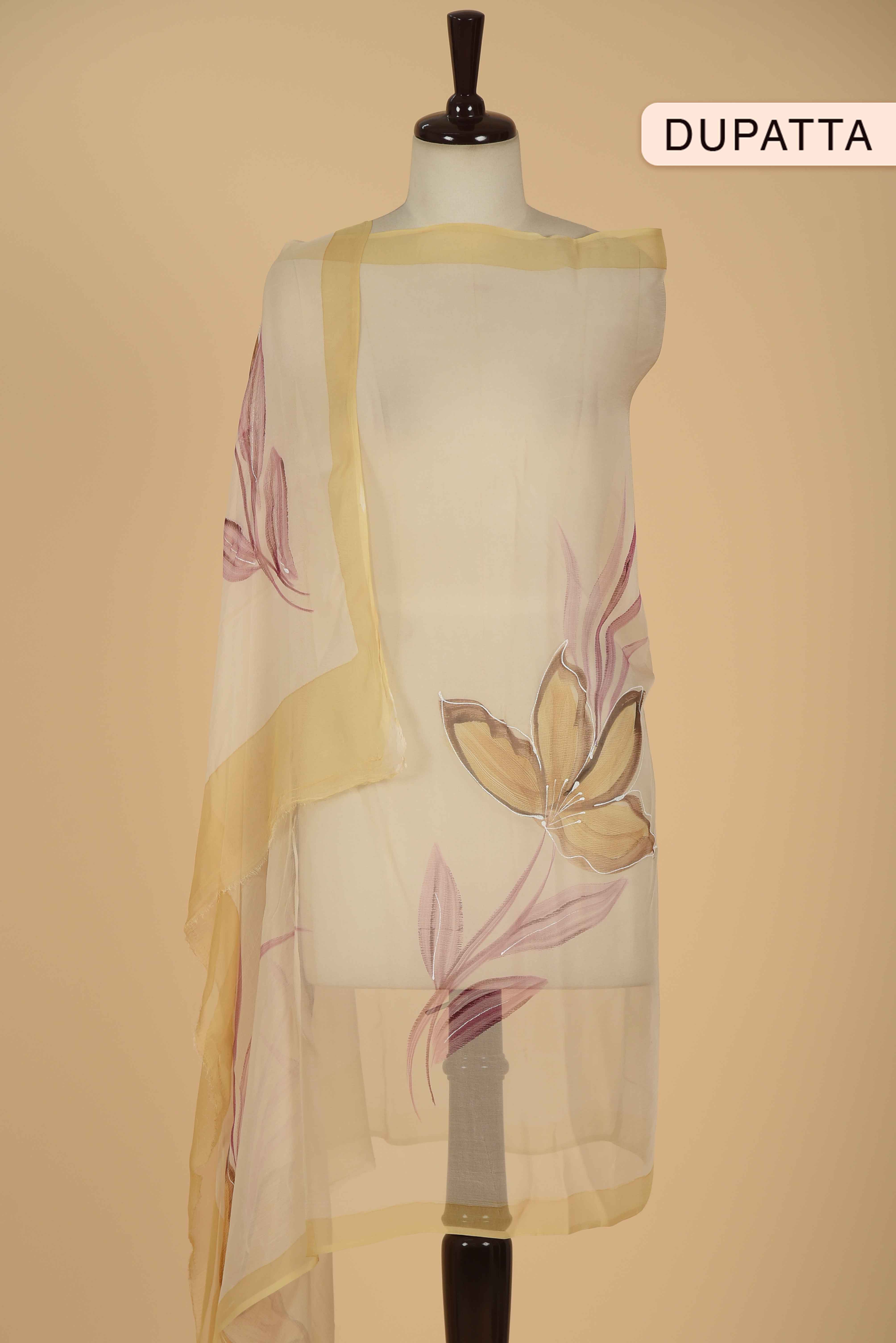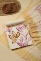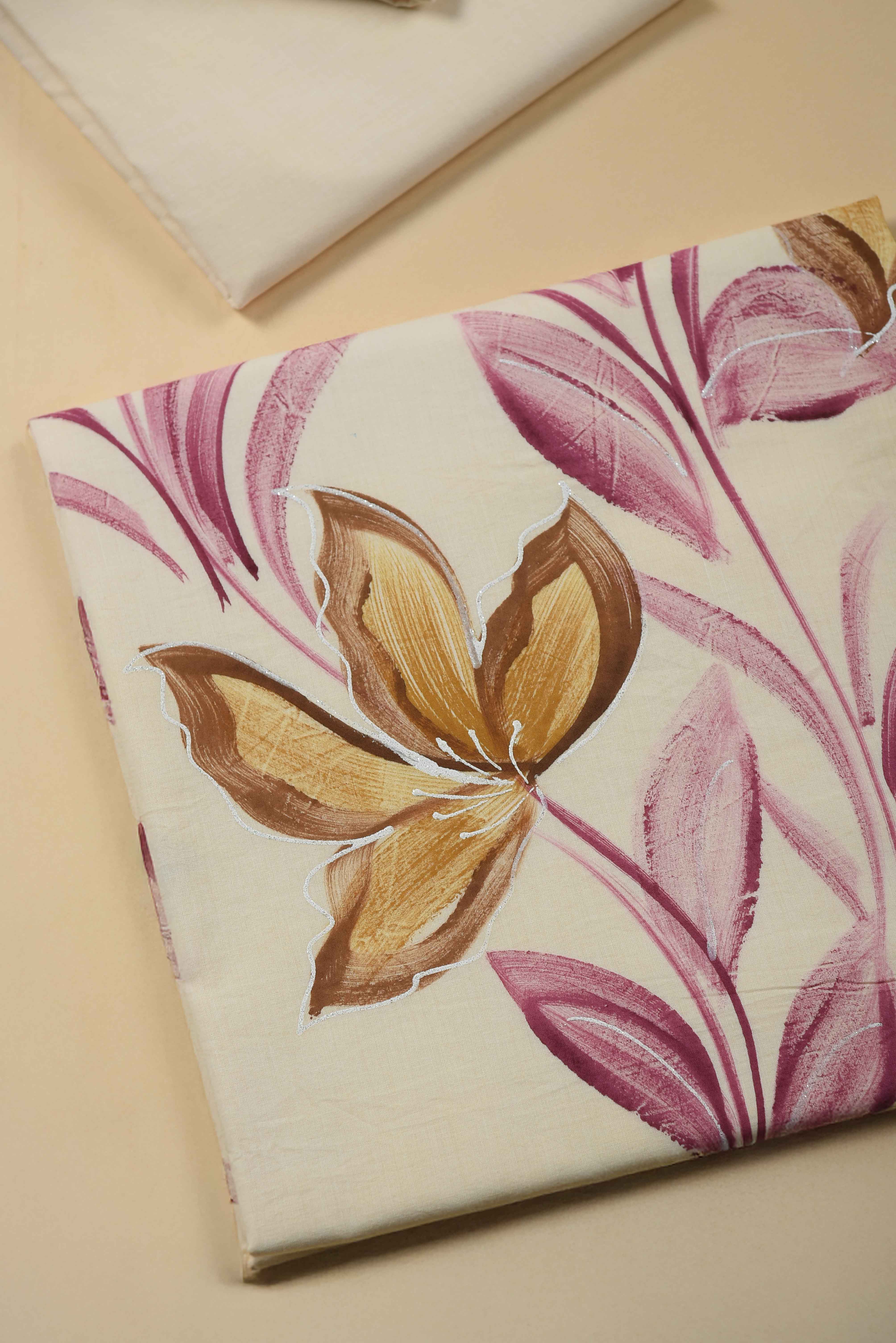 Cream With Pink Floral Paint Brushed Unstitched Suit Fabric Set With Chiffon Printed Dupatta