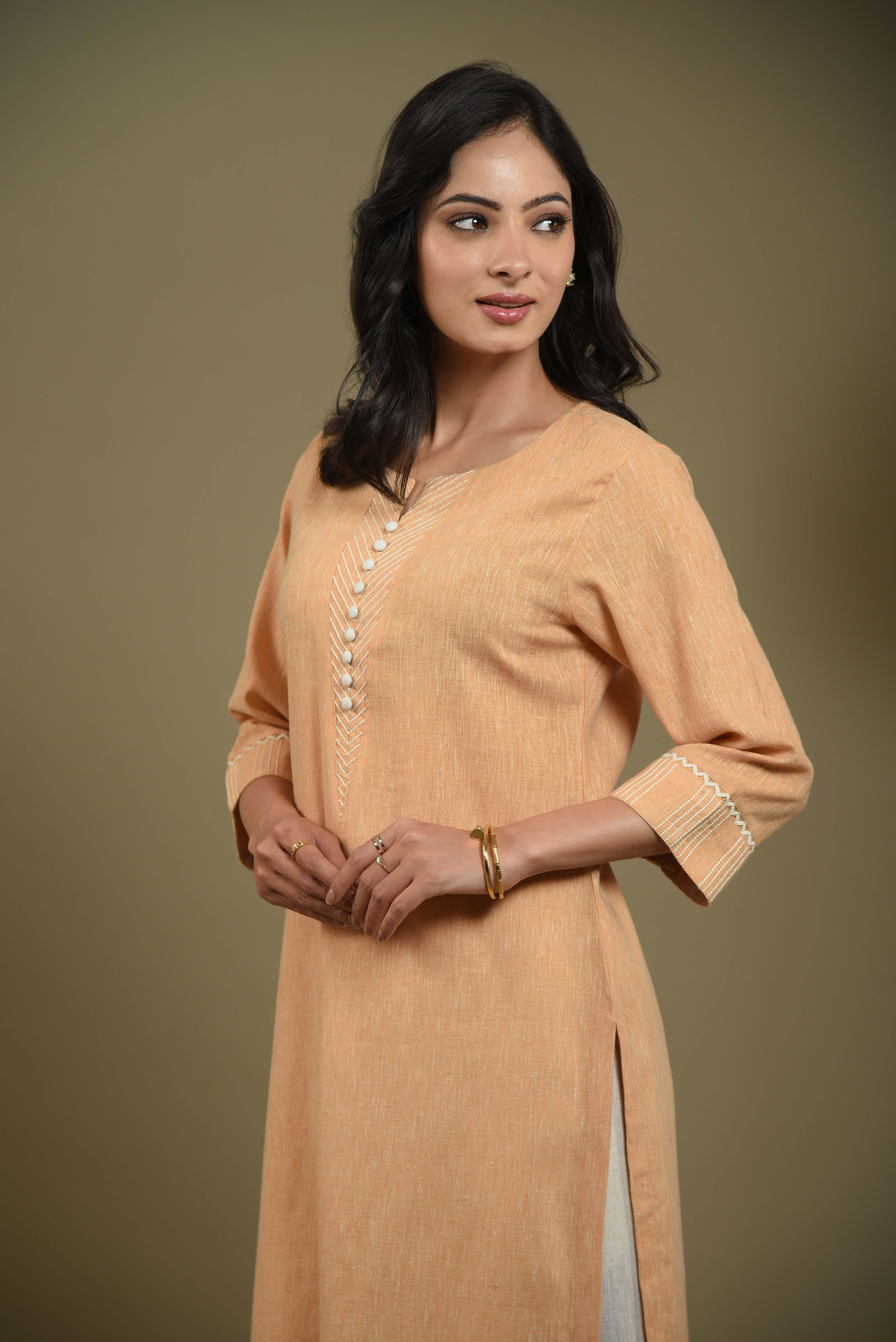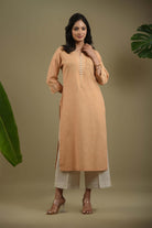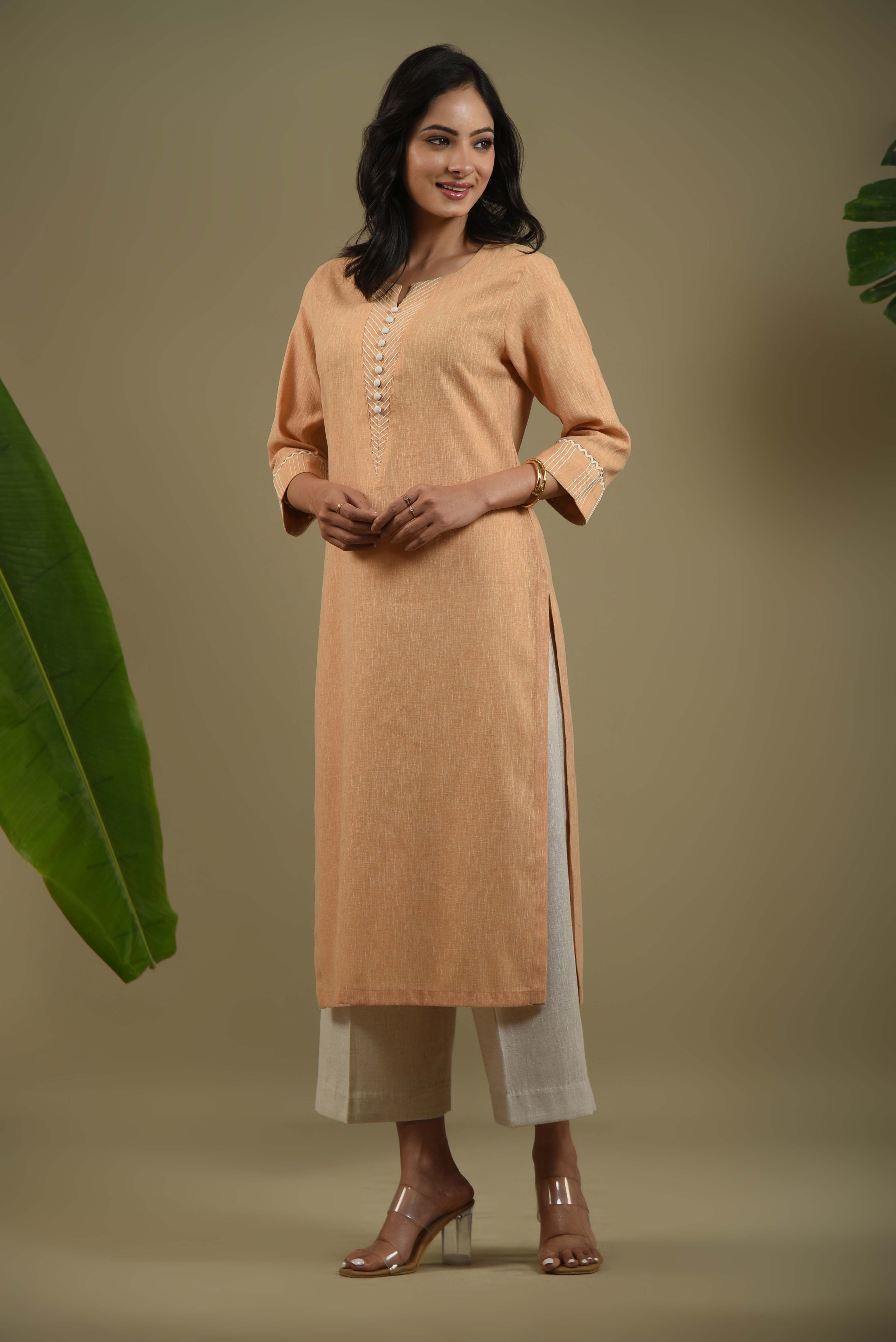 Mustard kurta set in fine cotton linen blend fabric crafted with a soft textured finish and a minimal dori embroidered placket for a refined look.