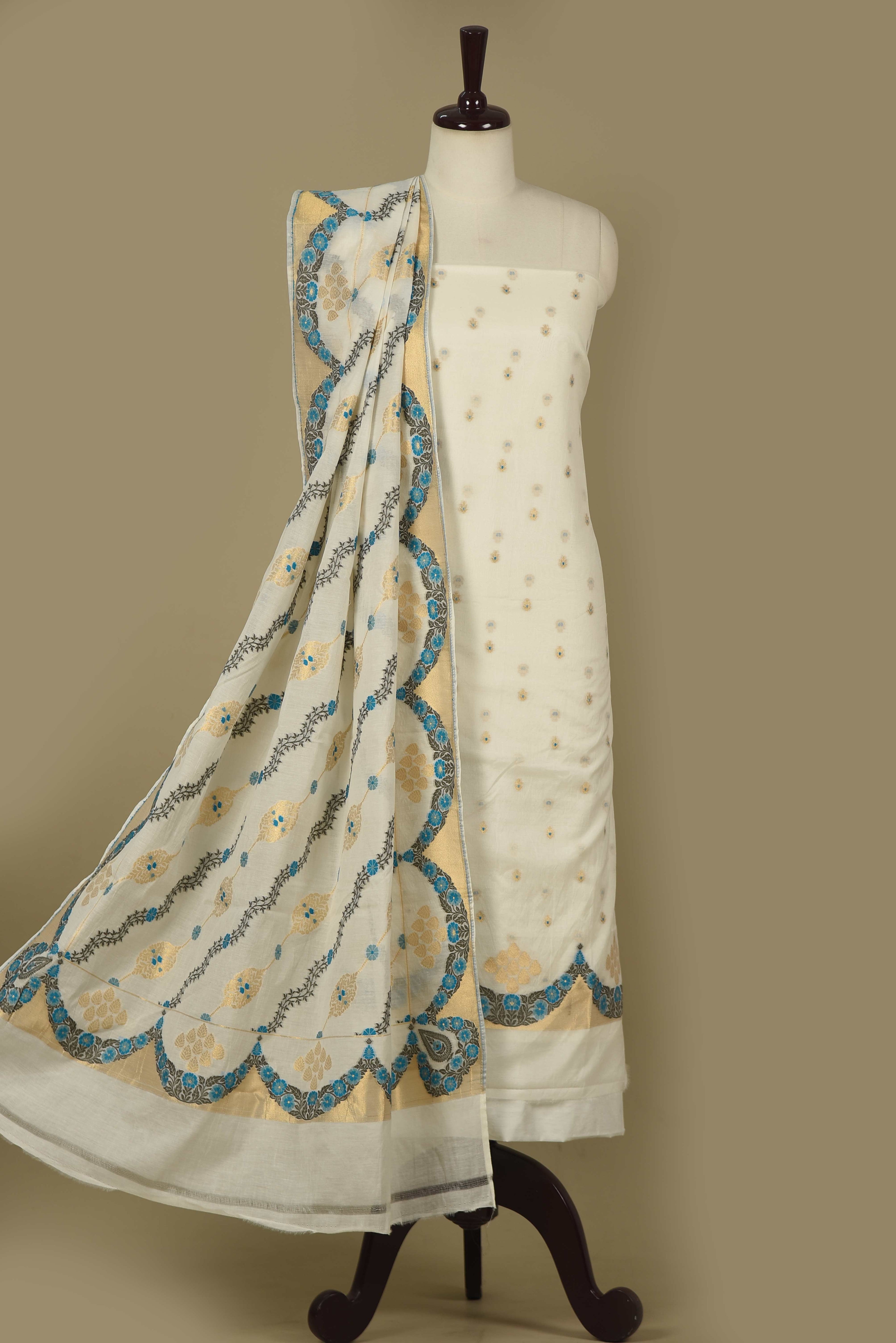 Cream with Turquoise Chanderi Silk Jamdani Woven Unstitched Suit Fabric Set with Chanderi Silk Woven Dupatta.