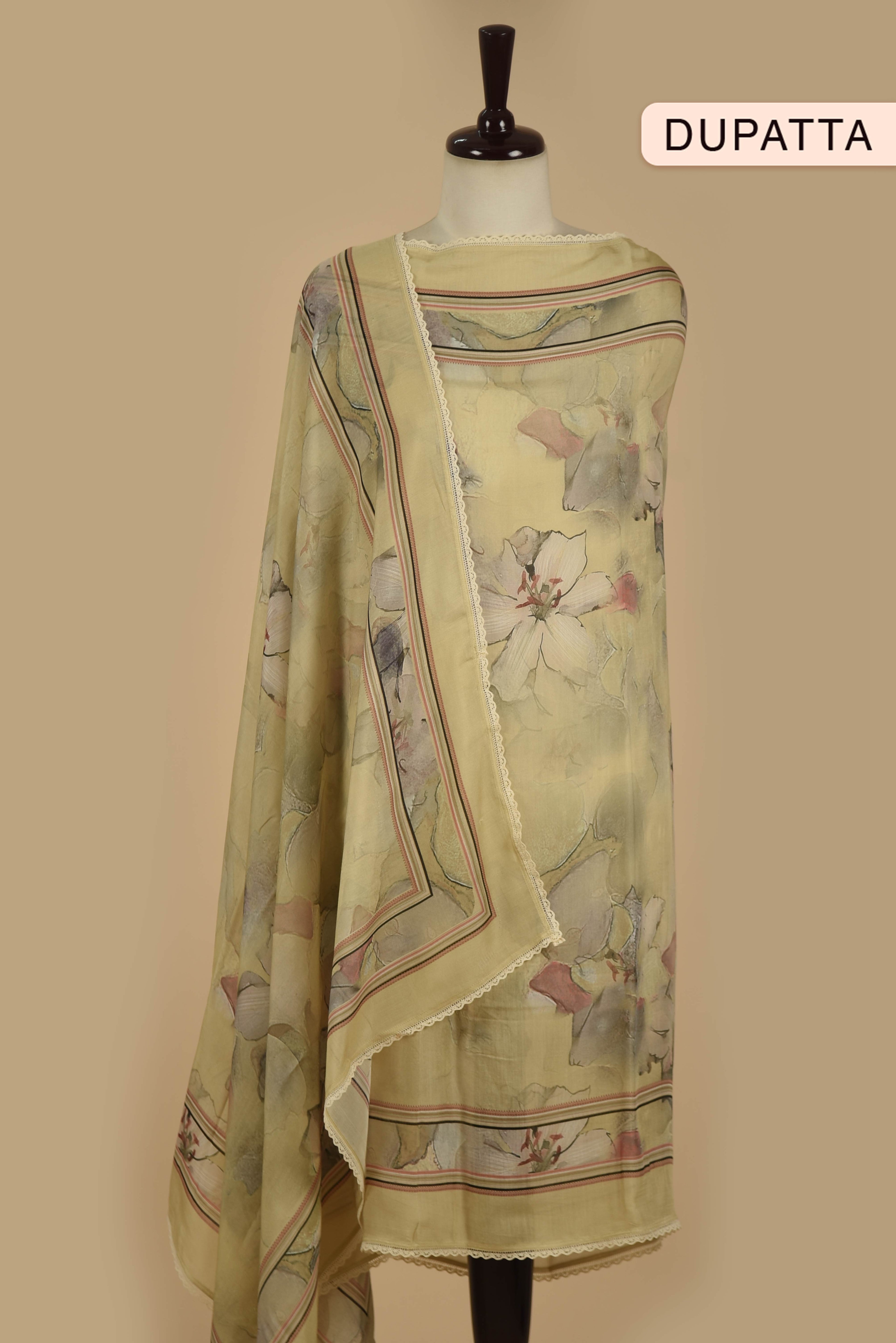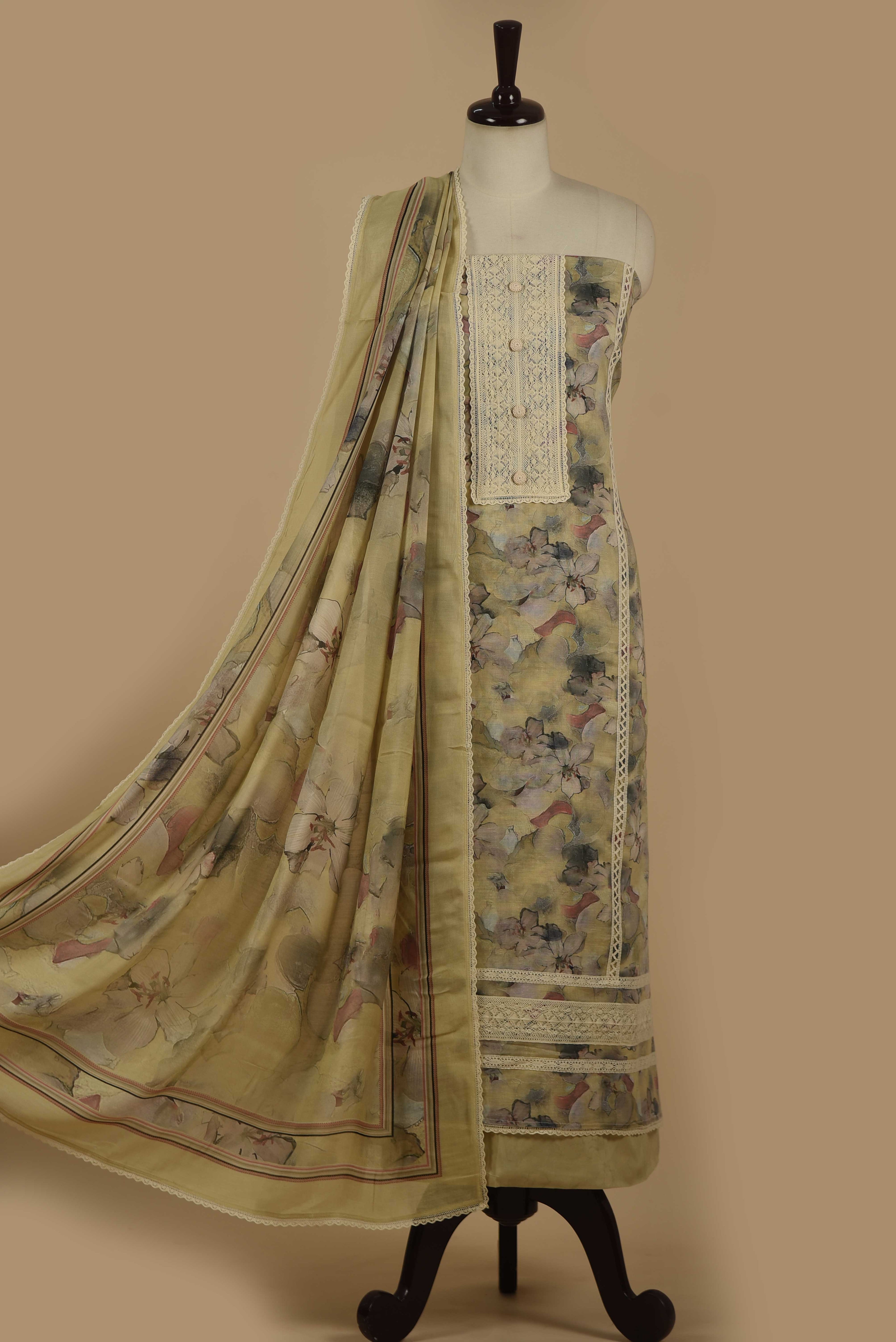 - Its matching mul cotton dupatta features beautiful floral prints, offering a light, airy drape that flows effortlessly and feels luxuriously soft against the skin.
