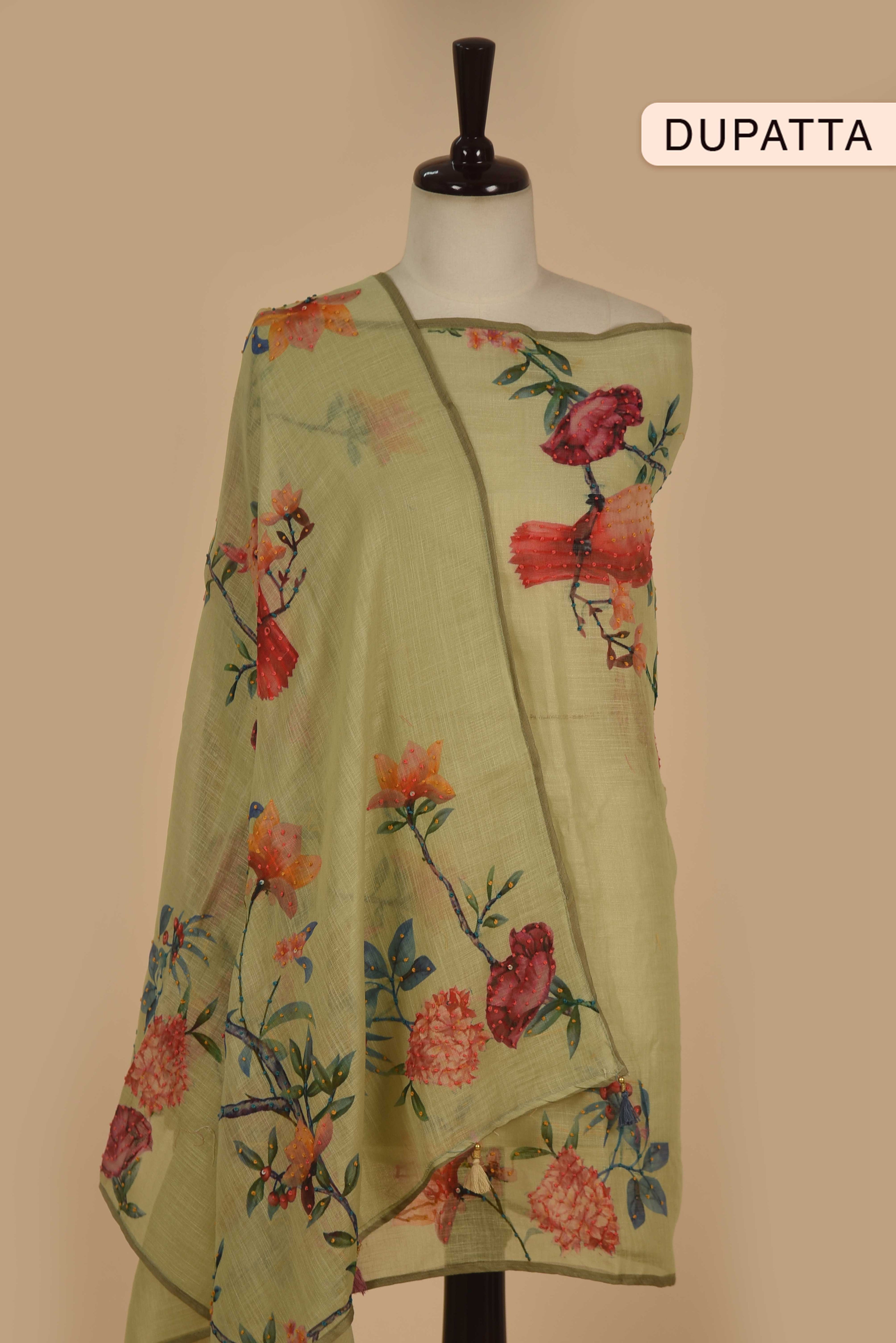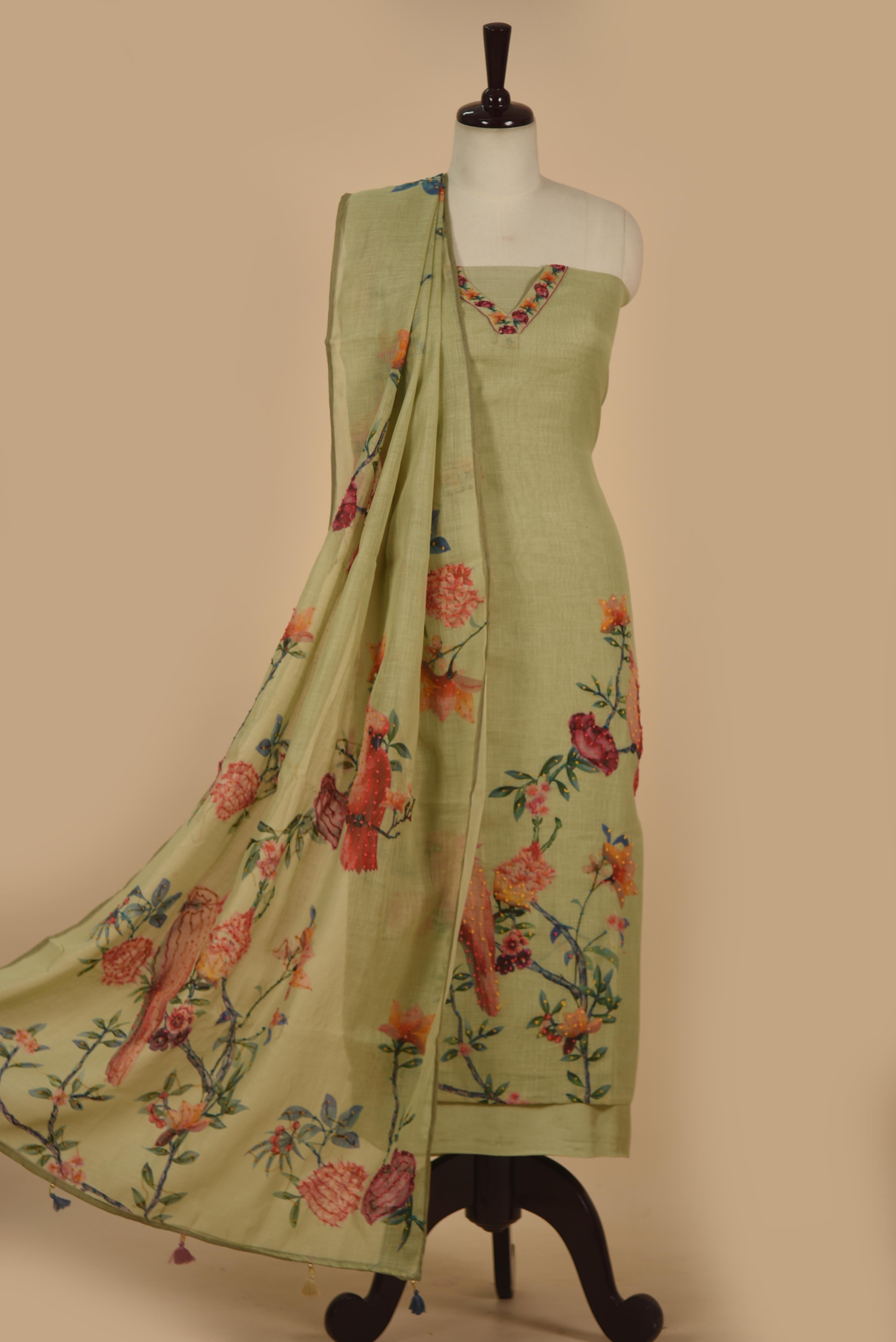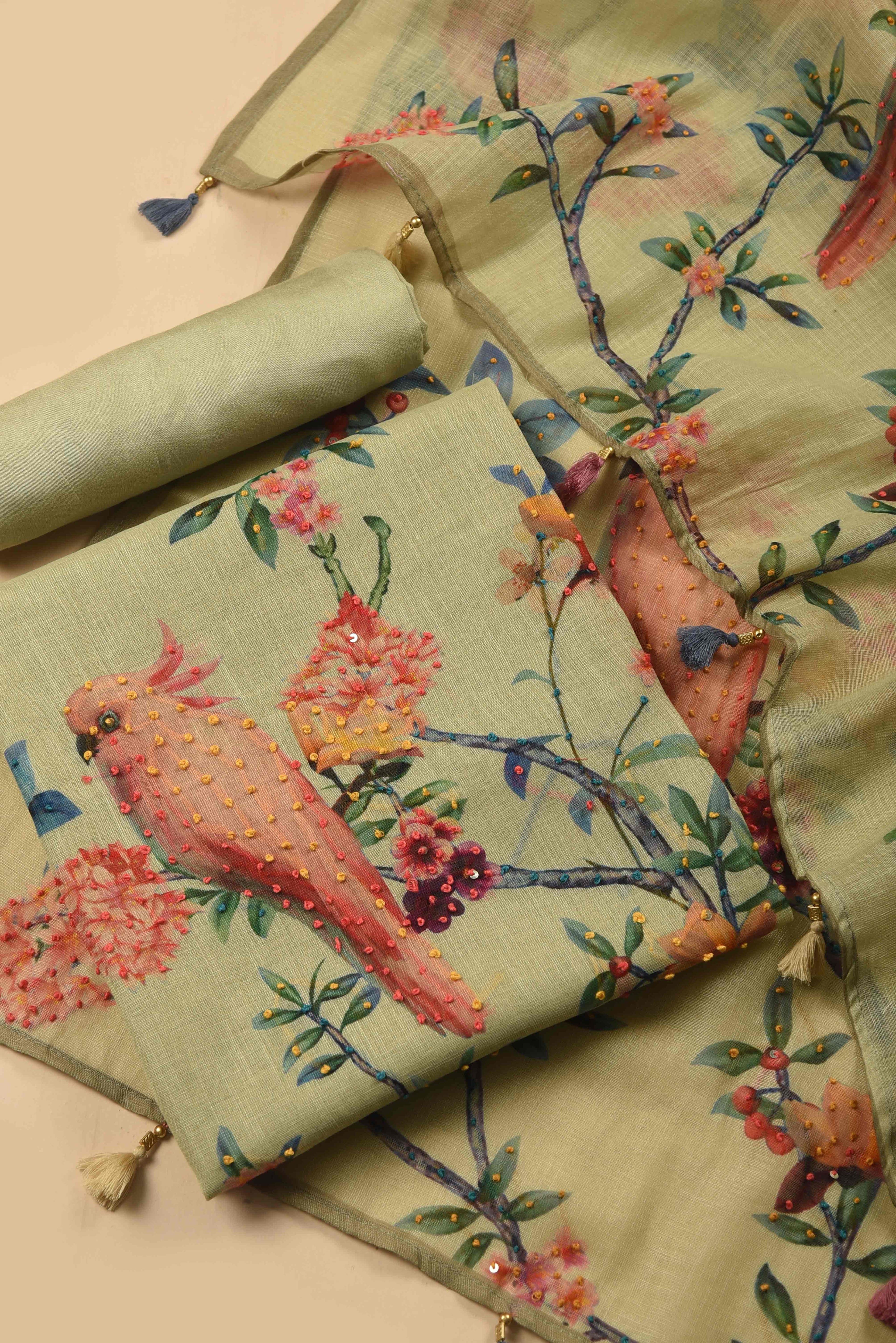 Green Linen Blend Printed With Embroidered Unstitched Suit Fabric Set With Linen Printed And Dupatta
