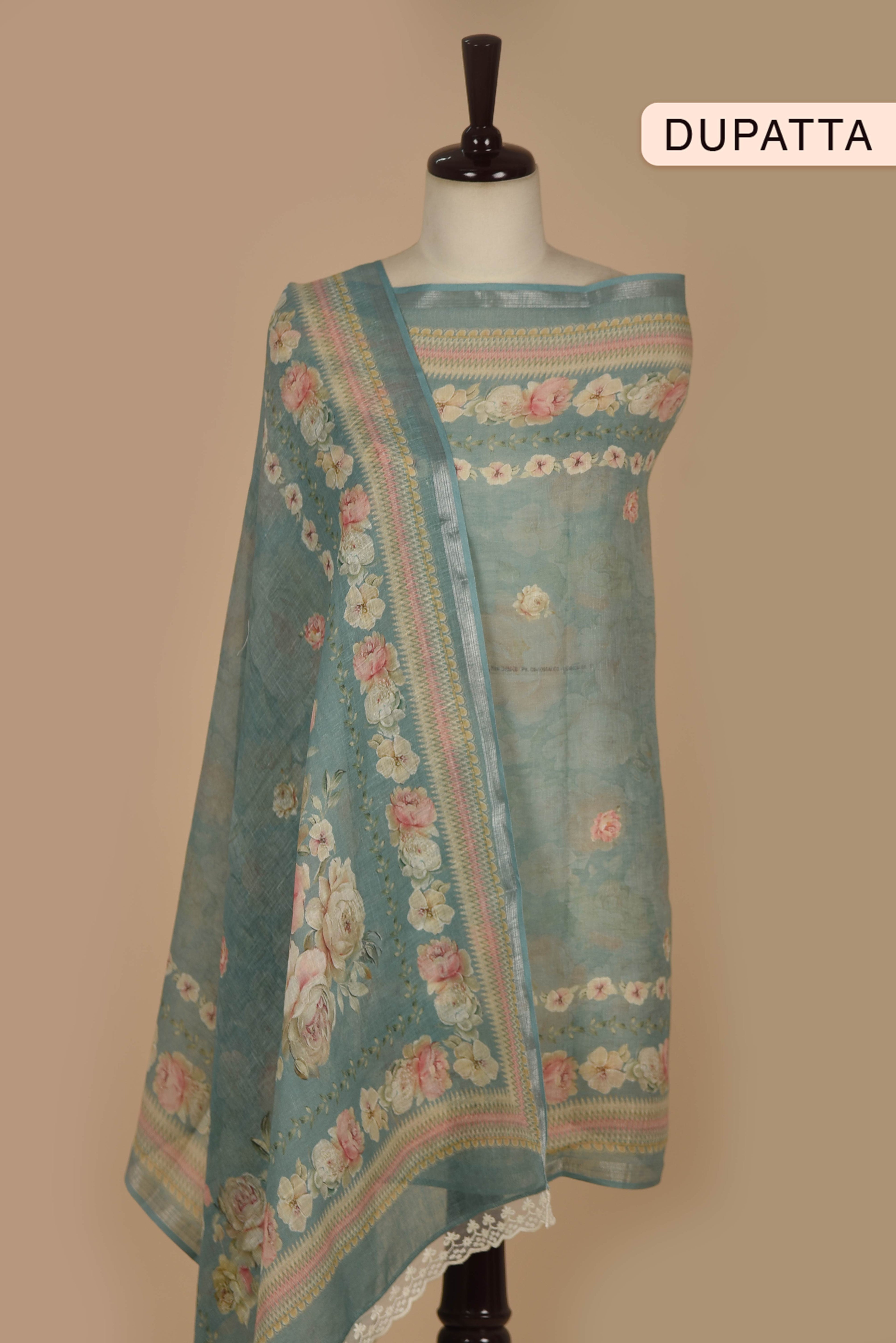 - The set is complemented by a matching linen dupatta, beautifully printed to enhance the ensemble's charm.