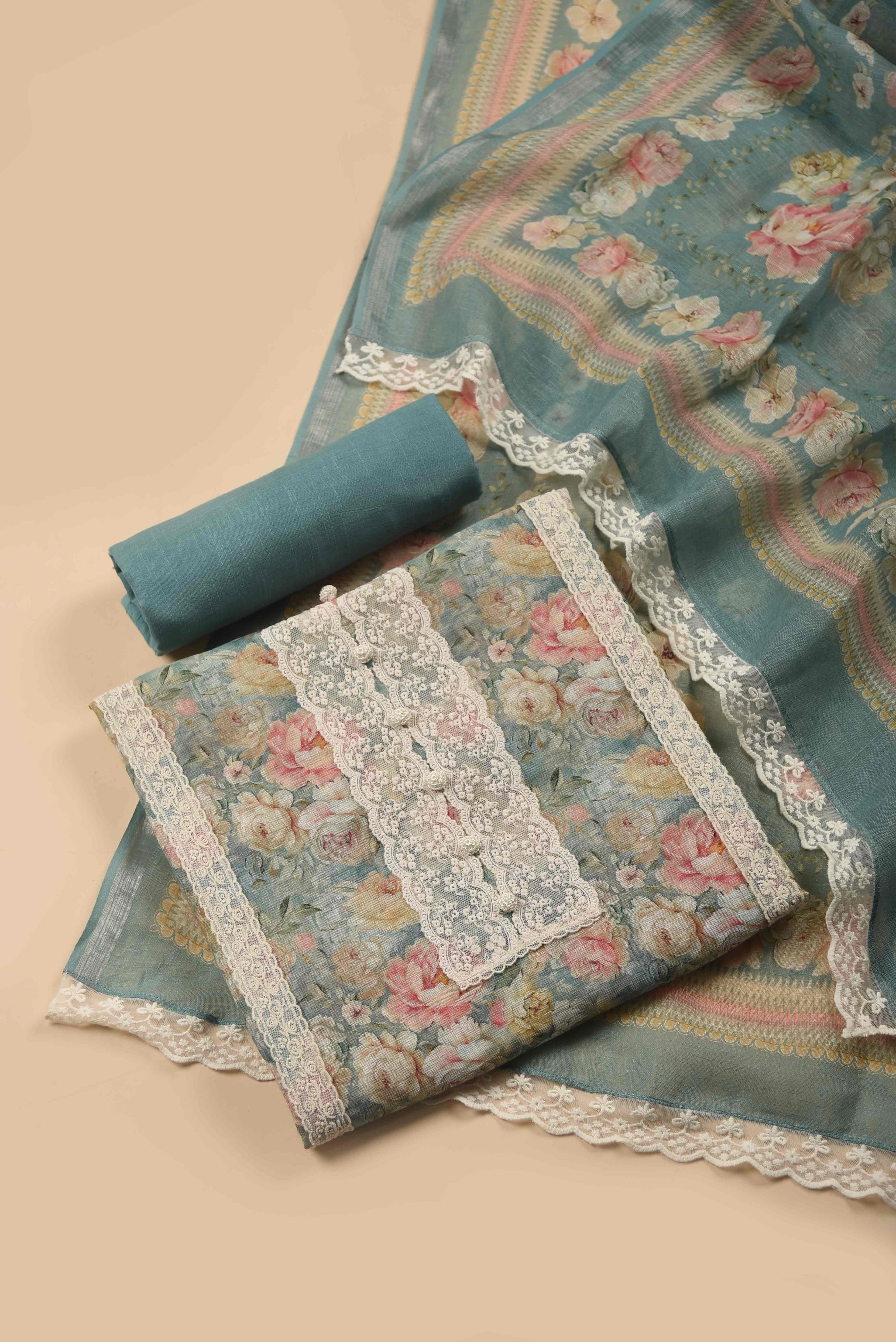 Green Linen Printed & Embroidered Unstitched Suit Fabric Set with Elegant Linen Dupatta - I