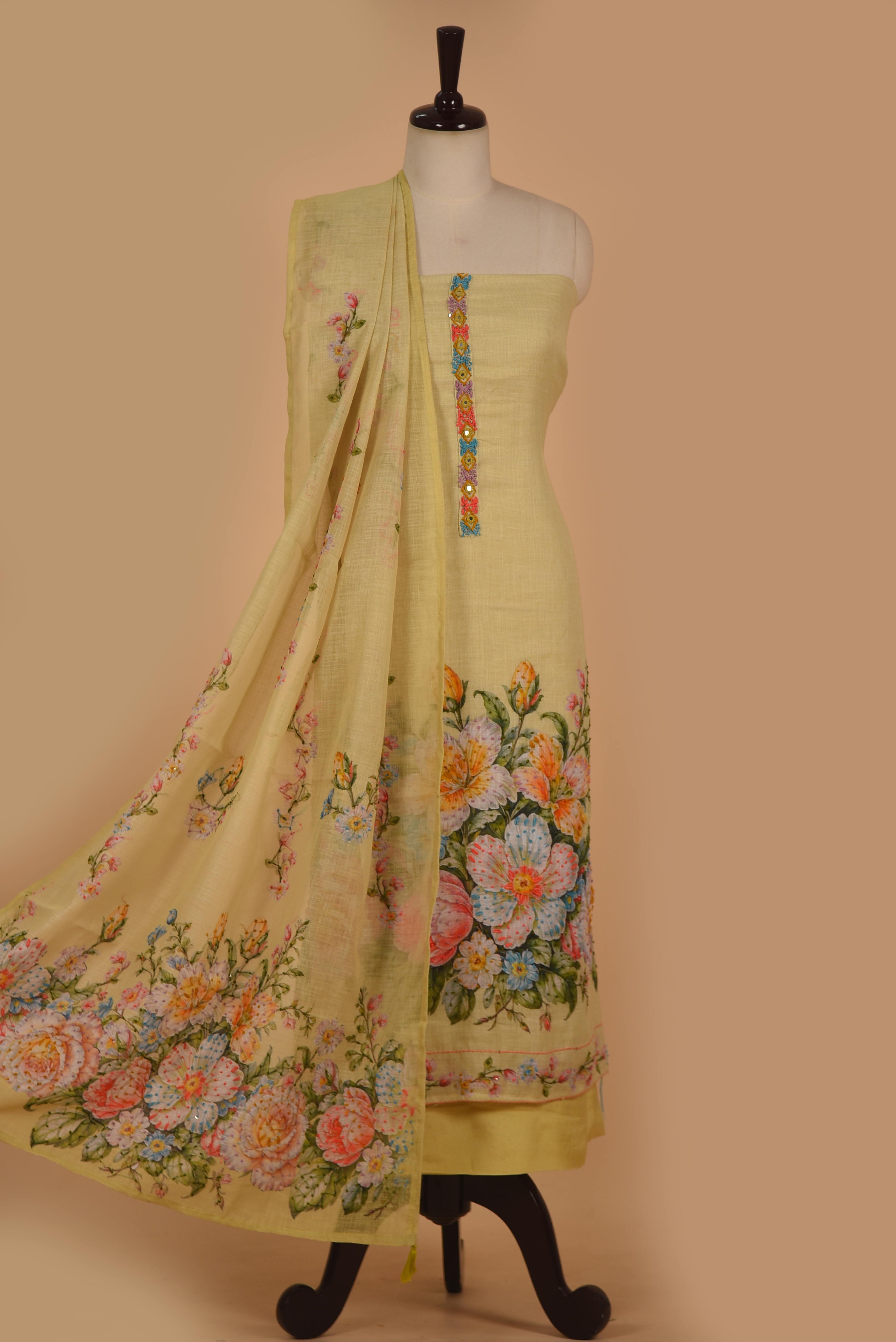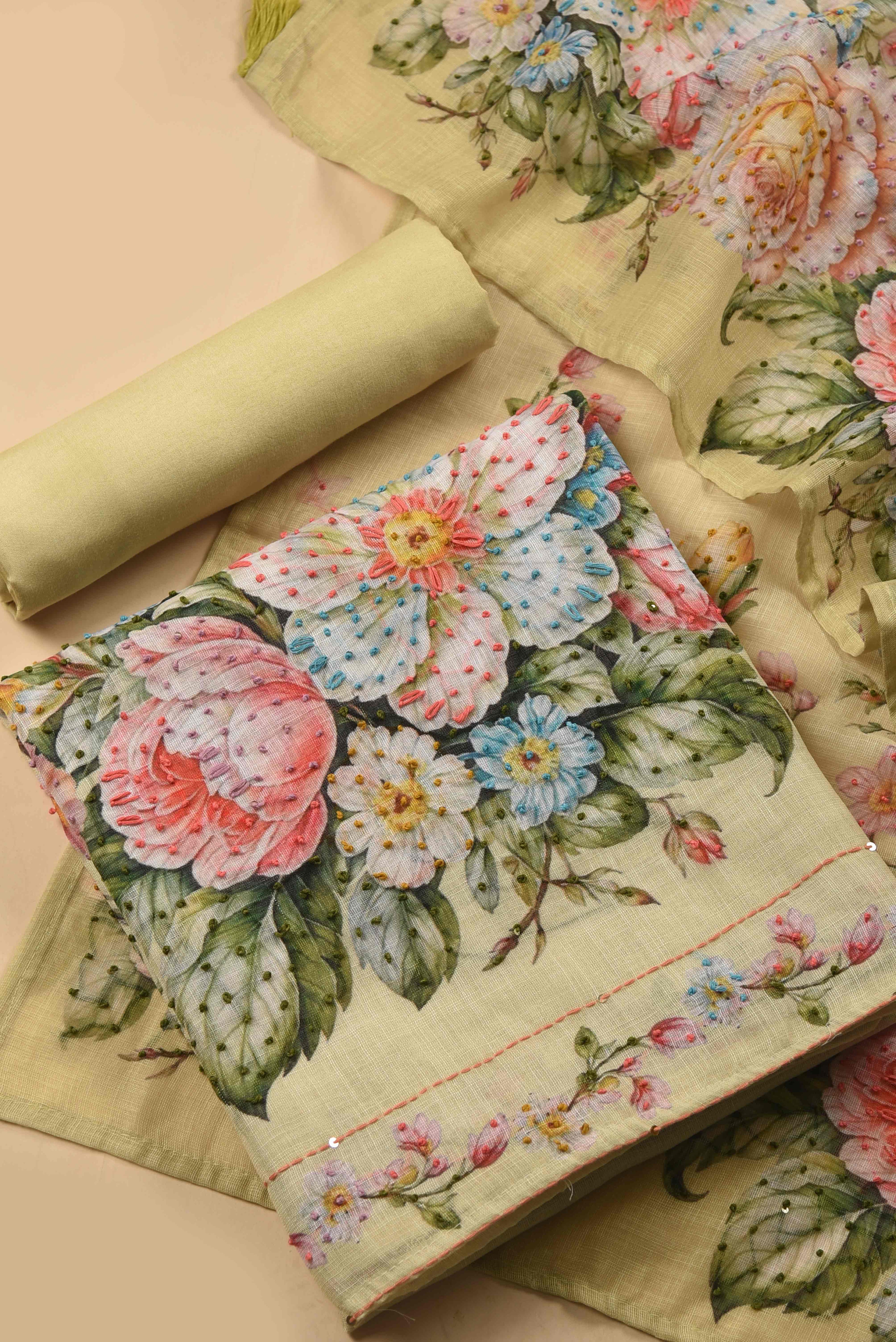 - ✨ Light Green Linen Blend Printed & Embroidered Unstitched Suit Fabric Set with Linen Printed Dupatta Celebrate timeless elegance with our latest arrival – a beautifully designed Light Green unstitched suit fabric set, crafted from a soft and breathable linen blend, perfect for the festive season.