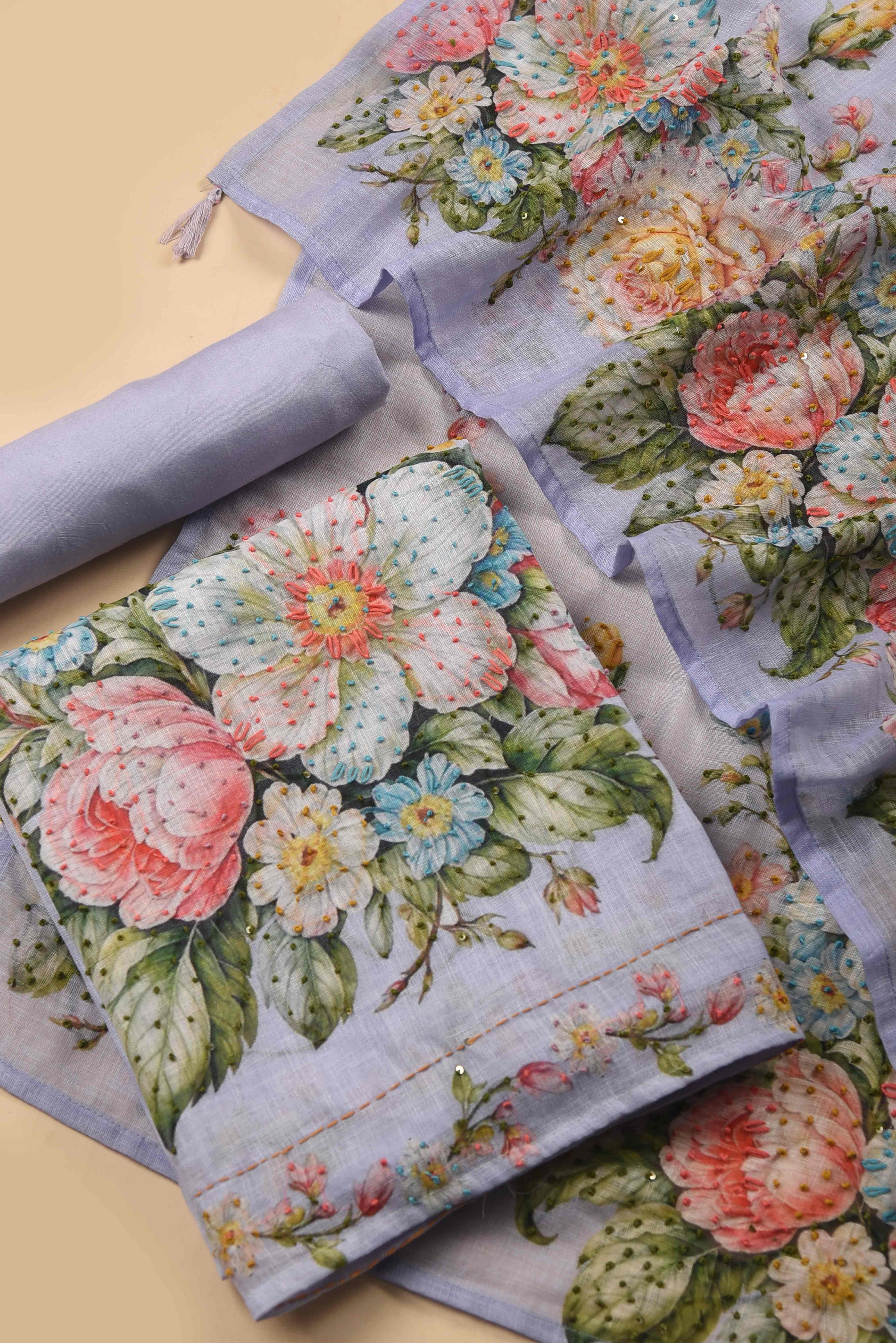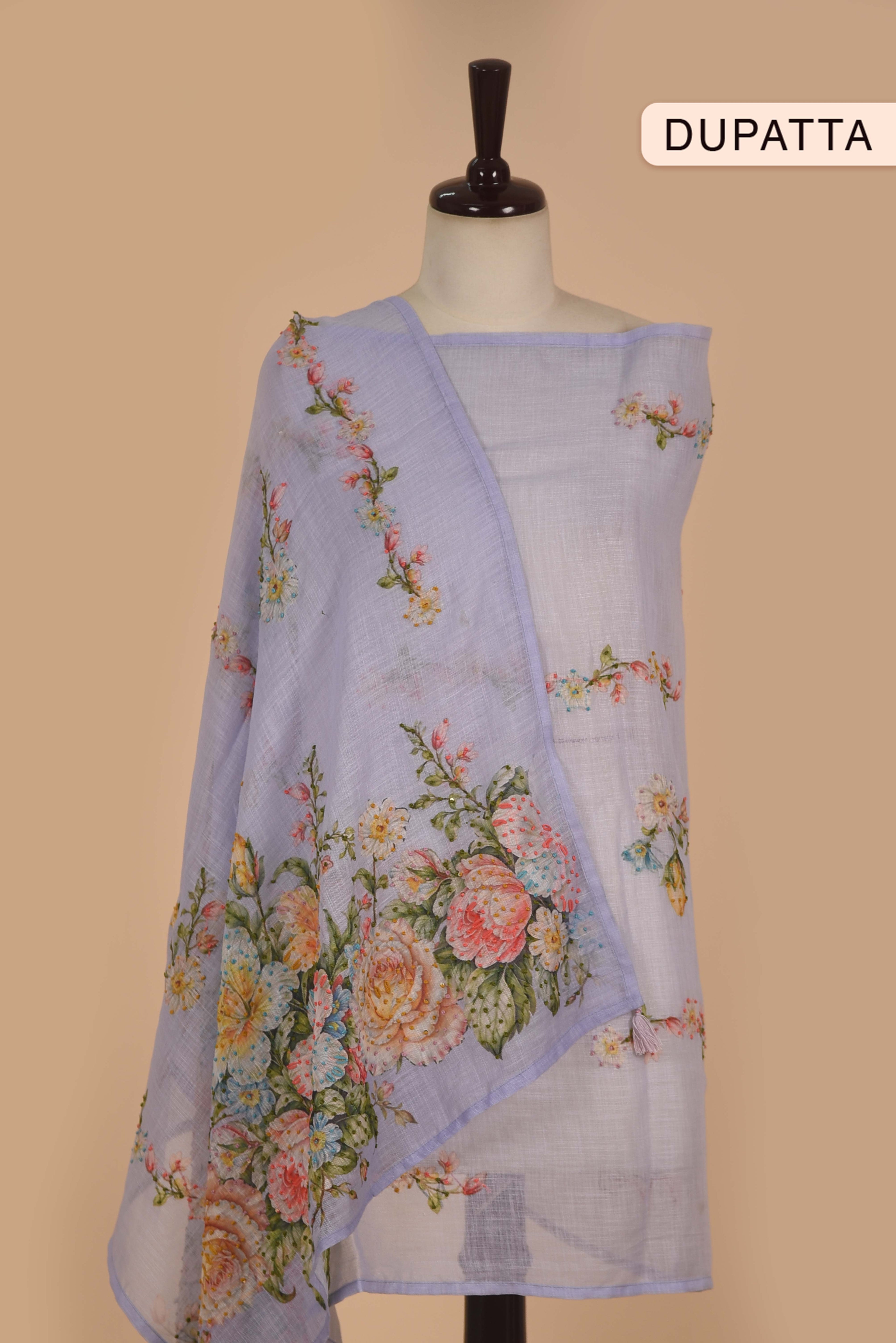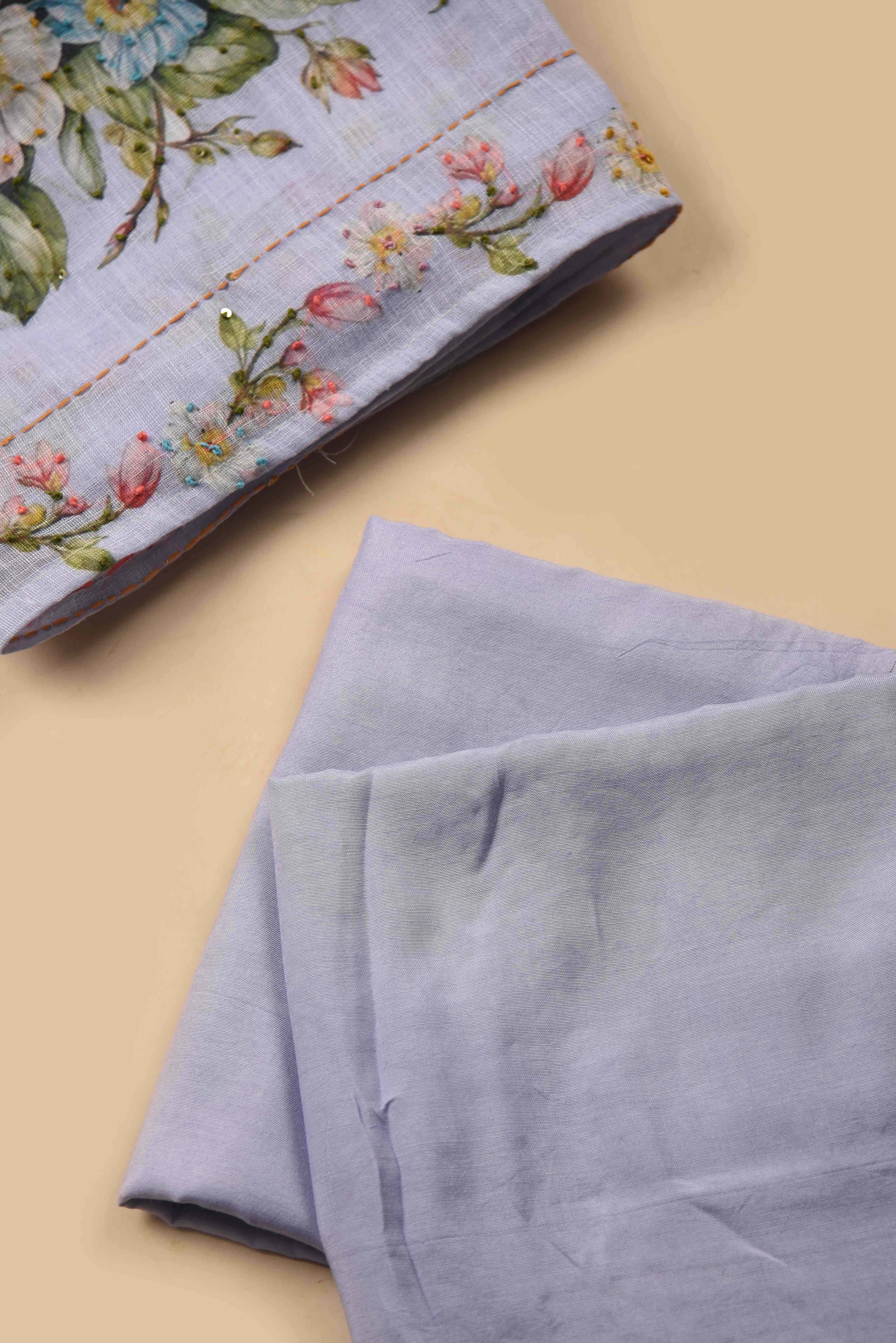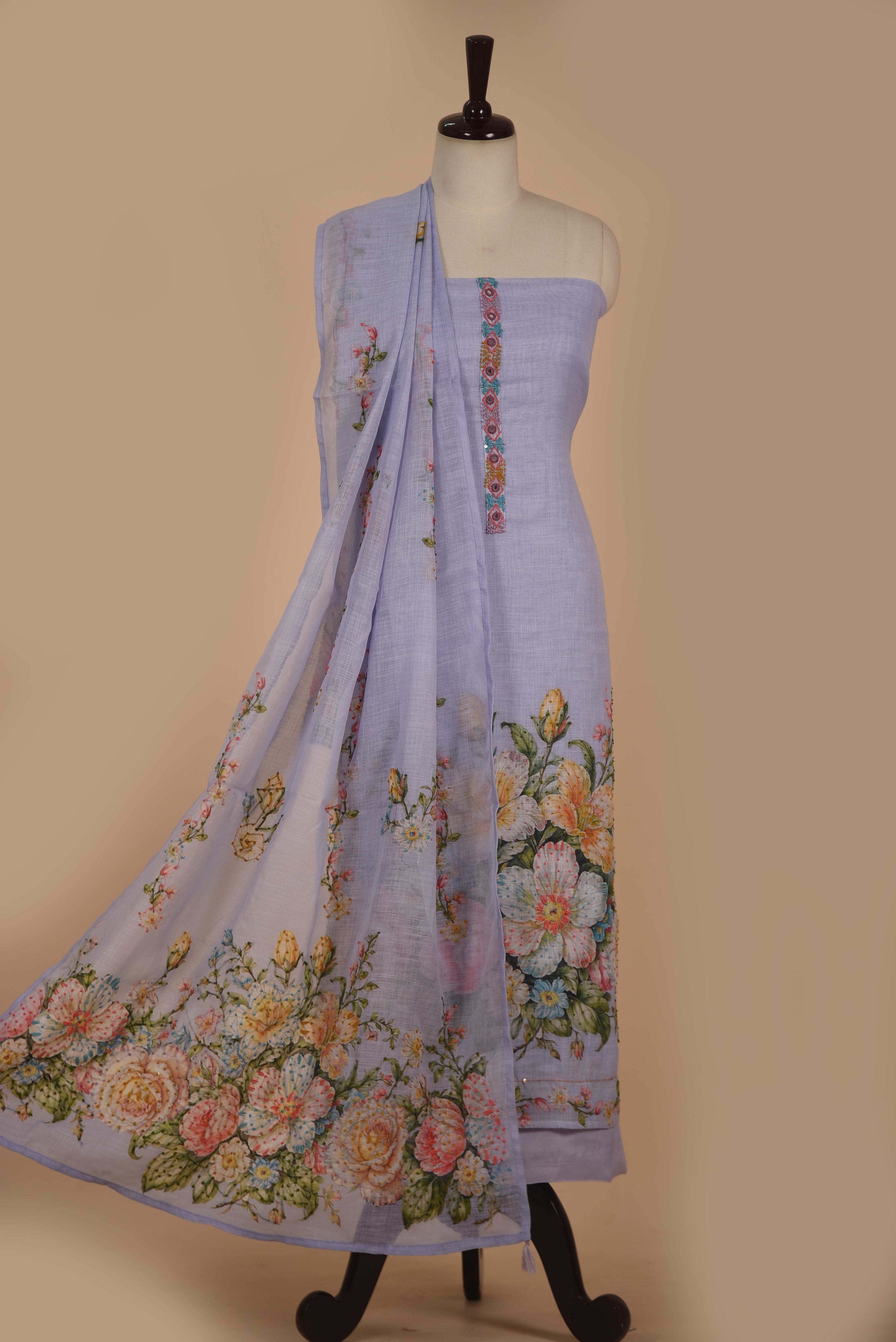 Light Purple Linen Blend Printed With Embroidered Unstitched Suit Fabric Set With Linen Printed And Dupatta