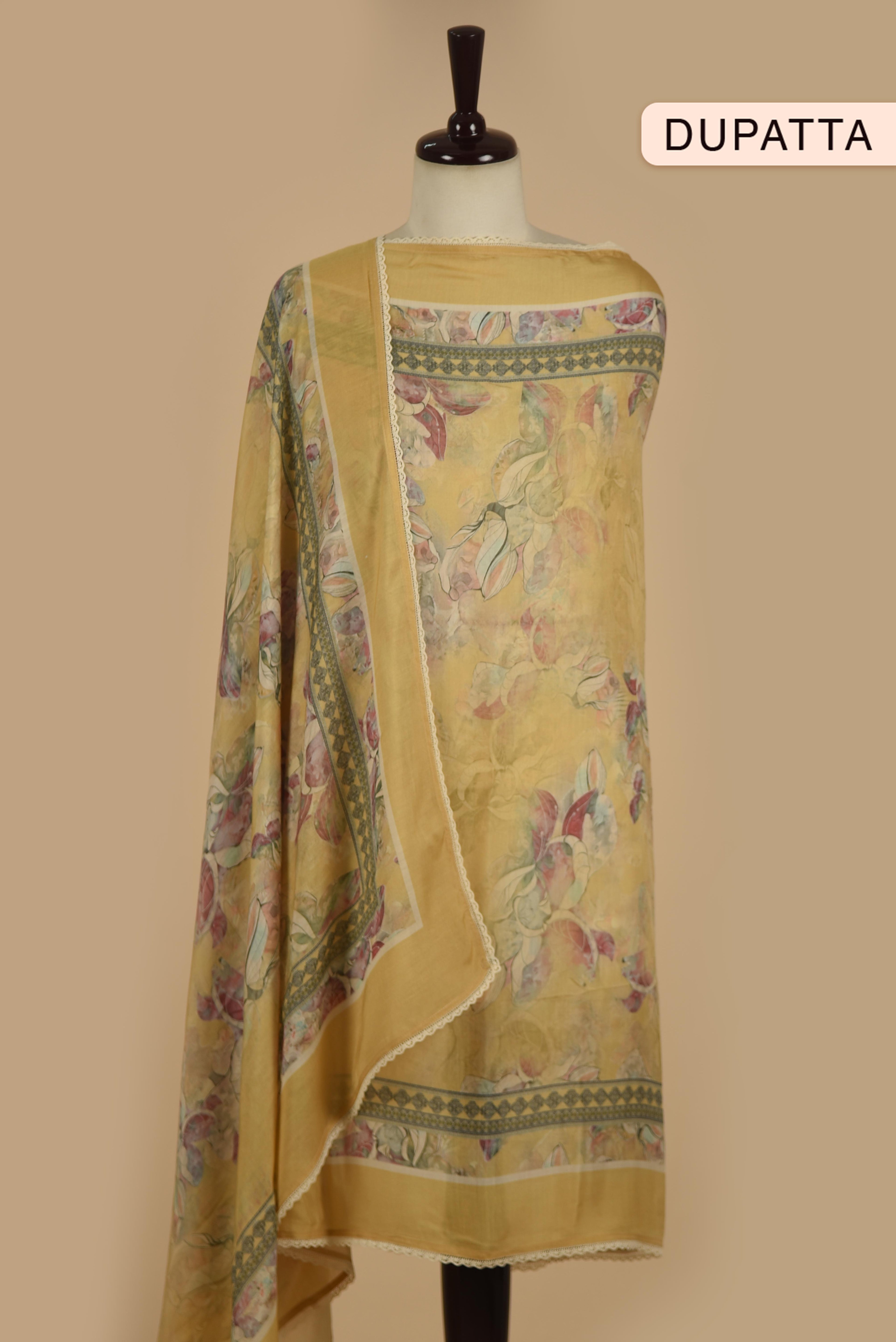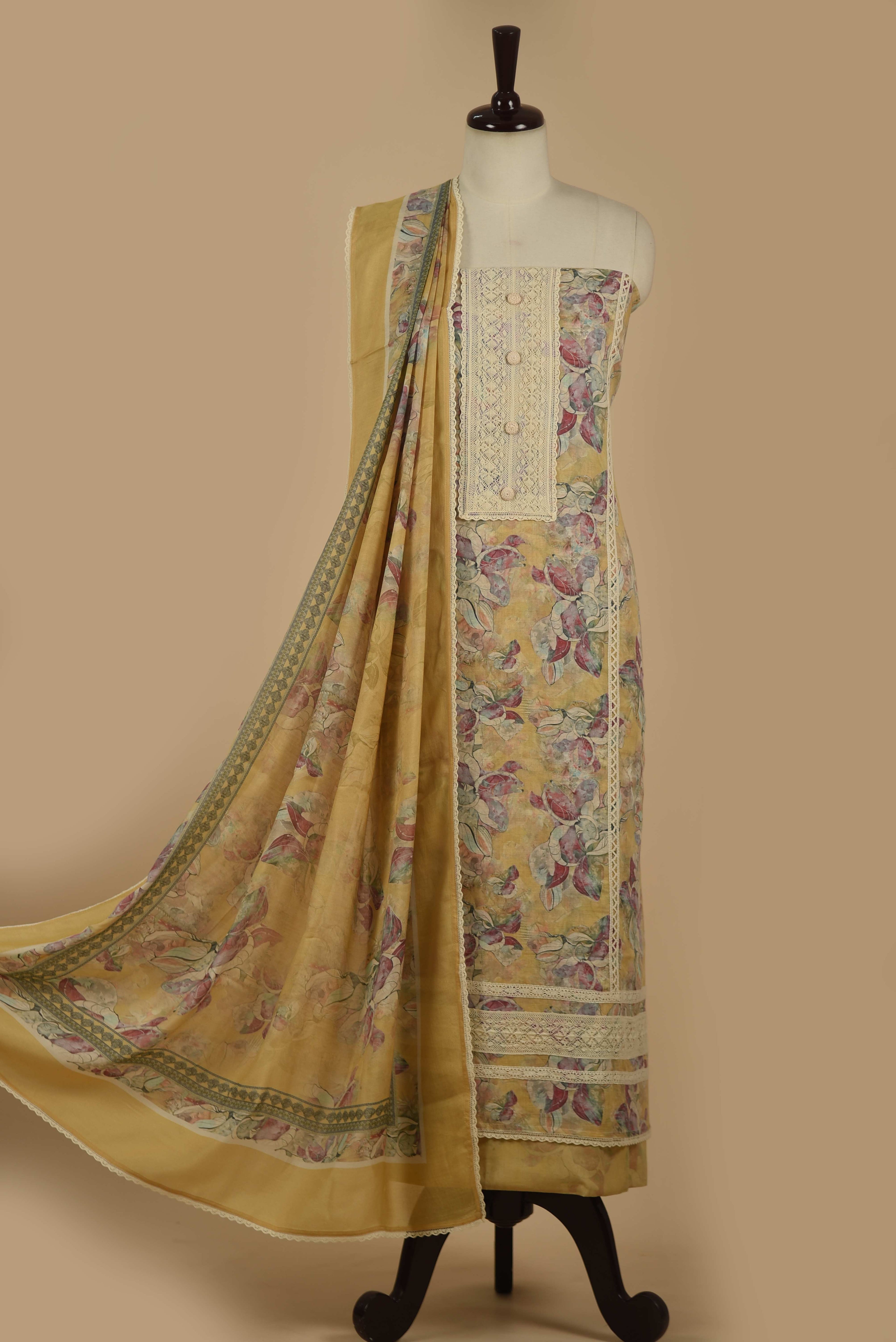 - Its matching mul cotton dupatta features beautiful floral prints, offering a light, airy drape that flows effortlessly and feels luxuriously soft against the skin.