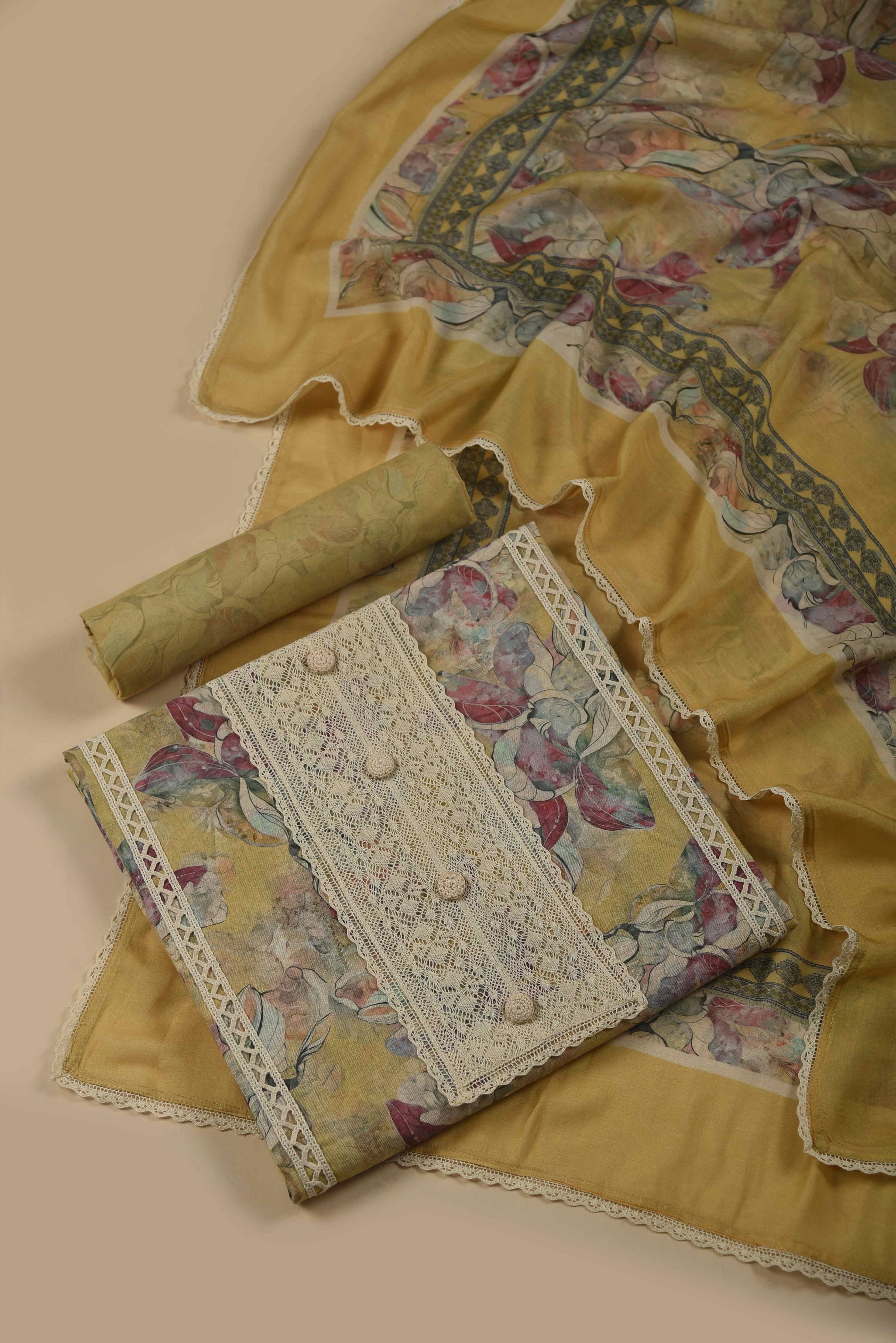 Lime Green Glazed Cotton Printed & Embroidered Unstitched Suit with Mul Cotton Dupatta