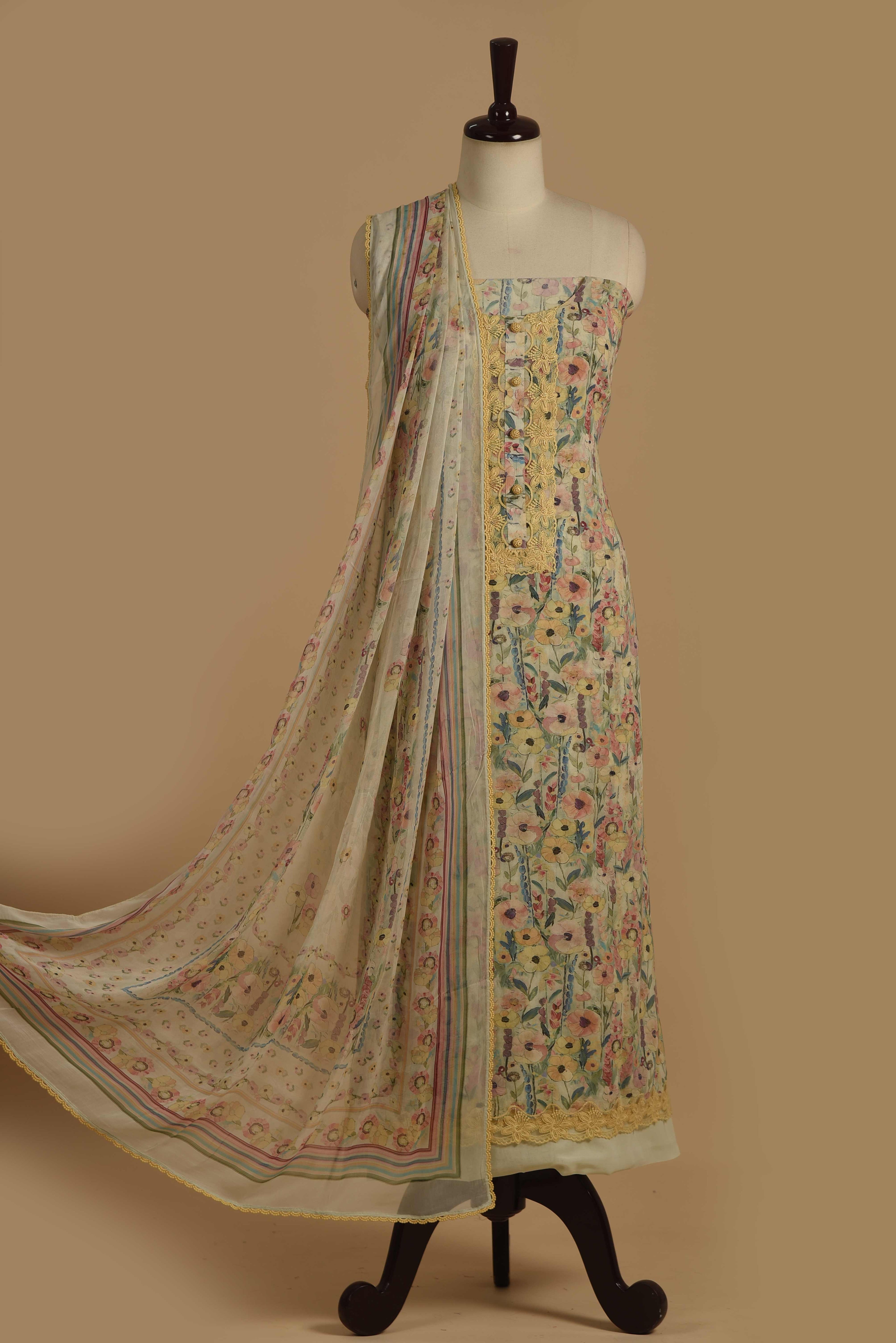 - The lightweight chiffon printed dupatta adds a graceful flow, completing the look with breezy sophistication.