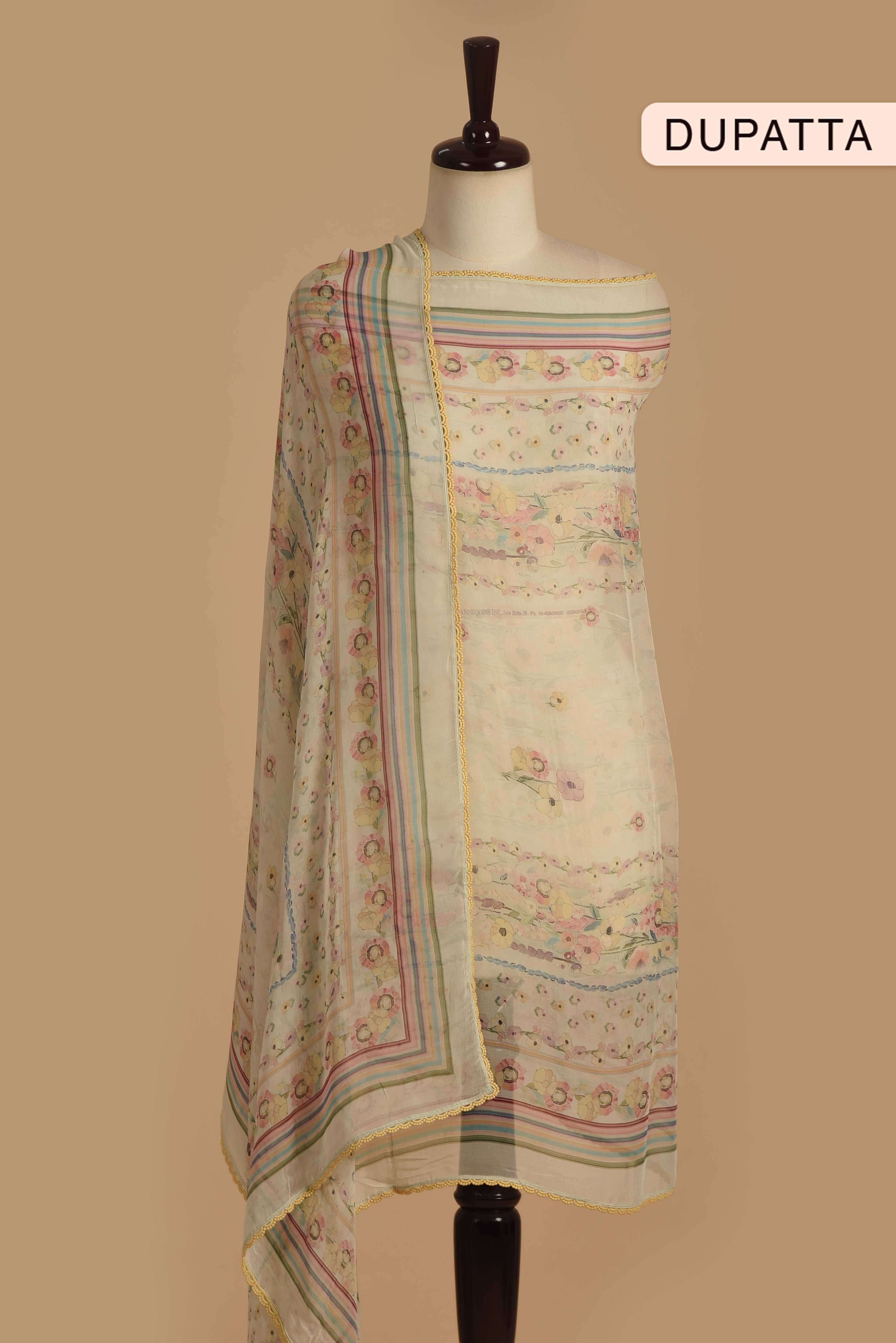 Off White Fine 2×2 Rubia Digital Printed Unstitched Suit Fabric Set With Chiffon Digital Printed Dupatta
