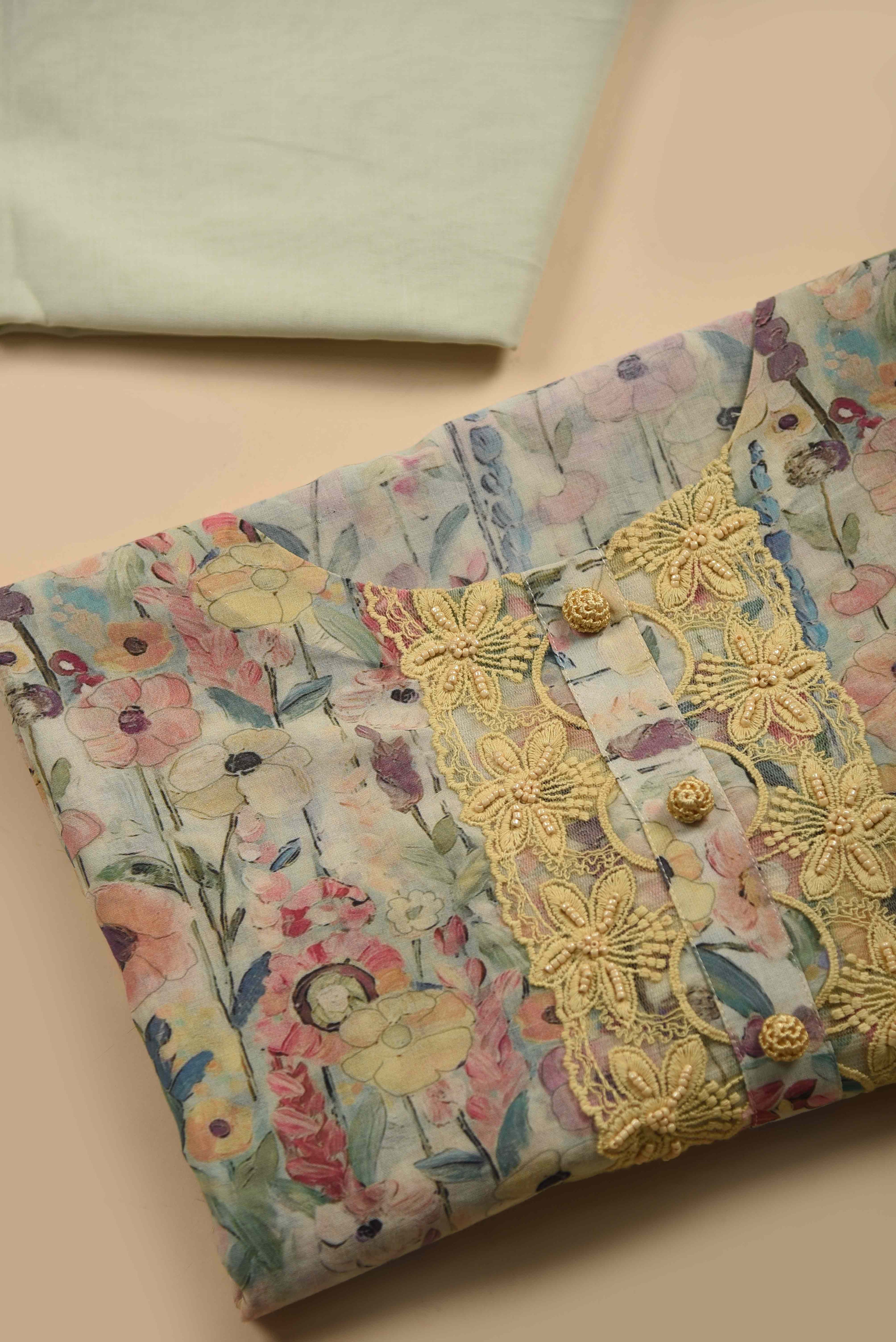 - Crafted from ultra-soft and breathable Fine 2×2 Rubia, the kurta fabric is adorned with floral digital prints, blending modern artistry with delicate femininity.