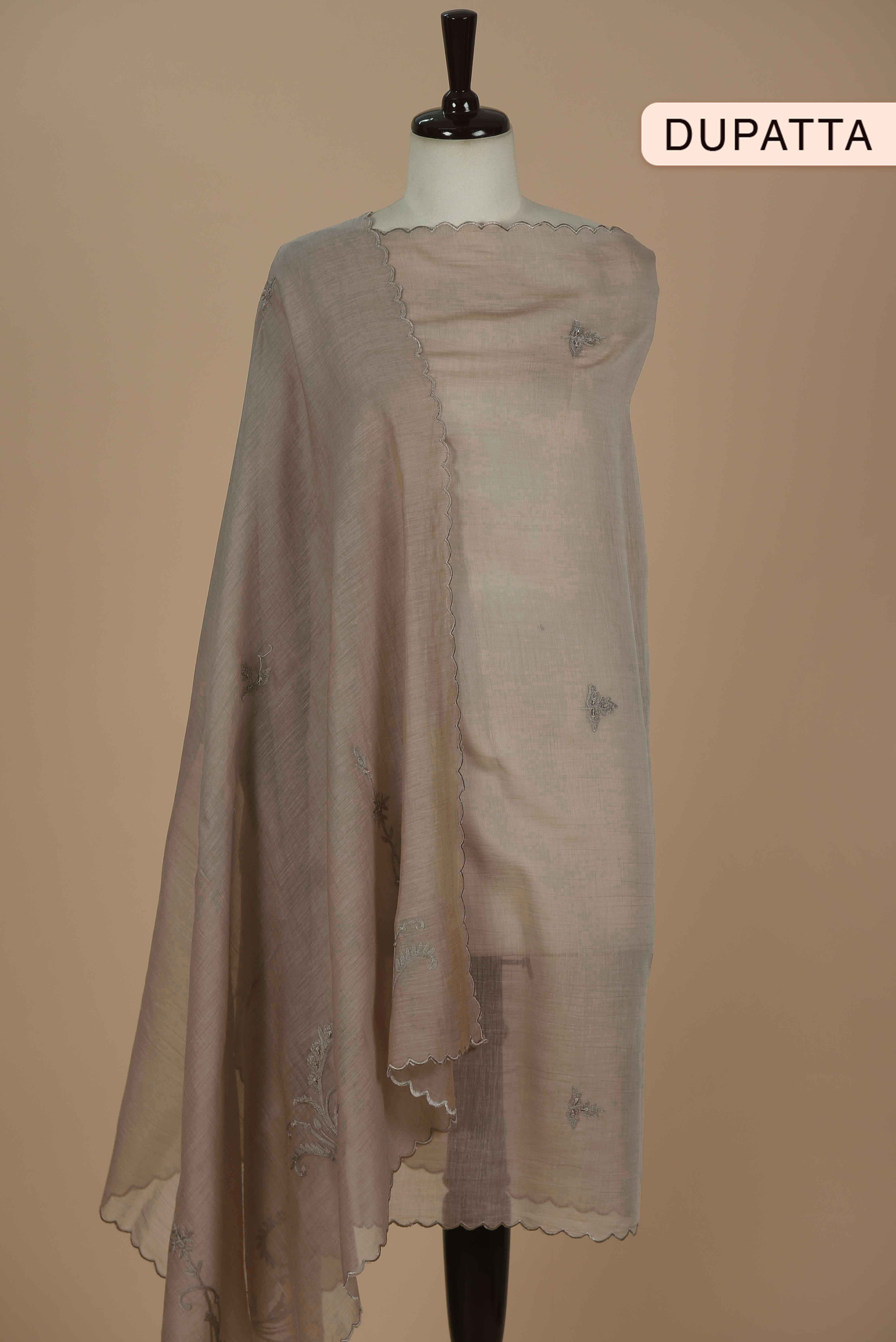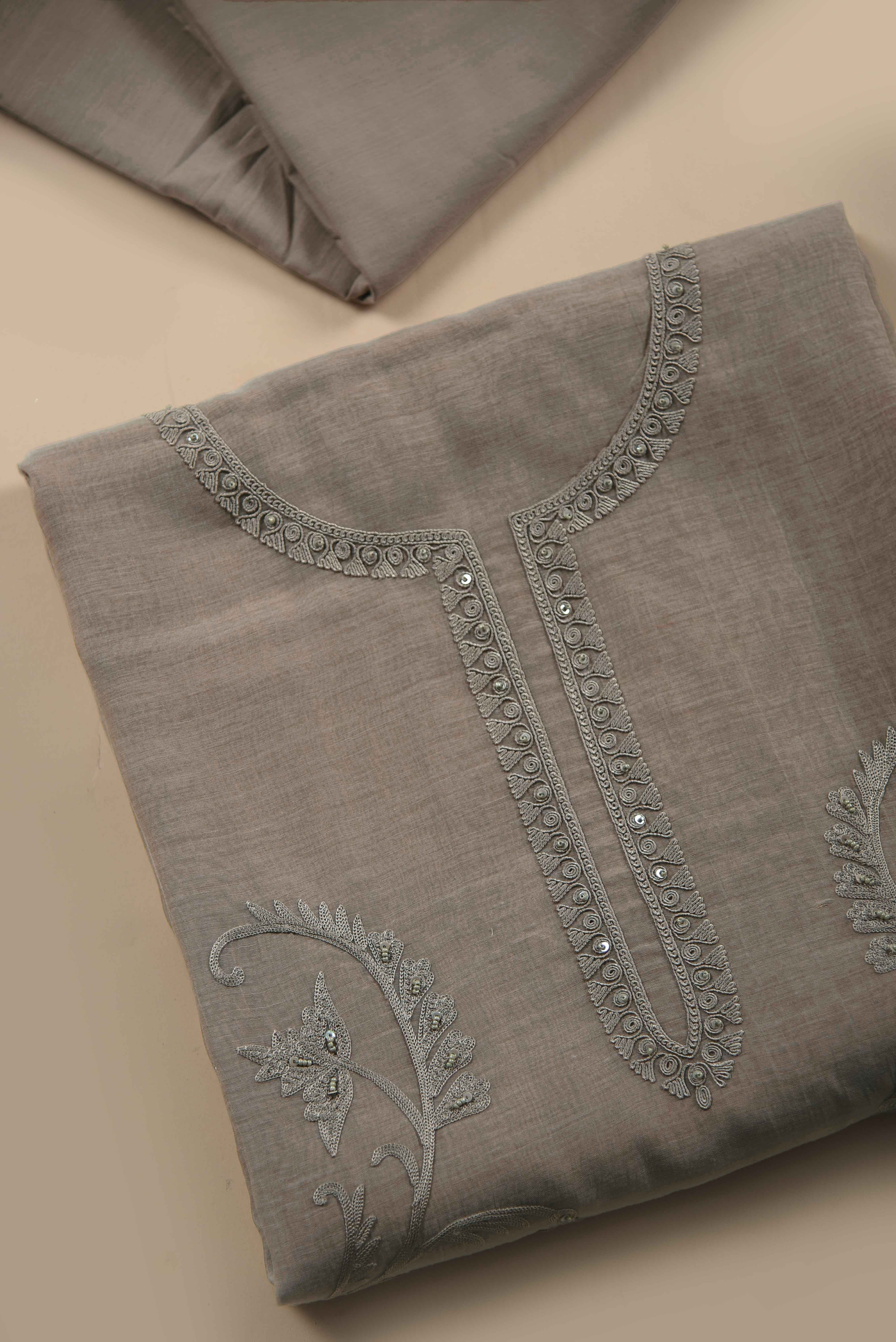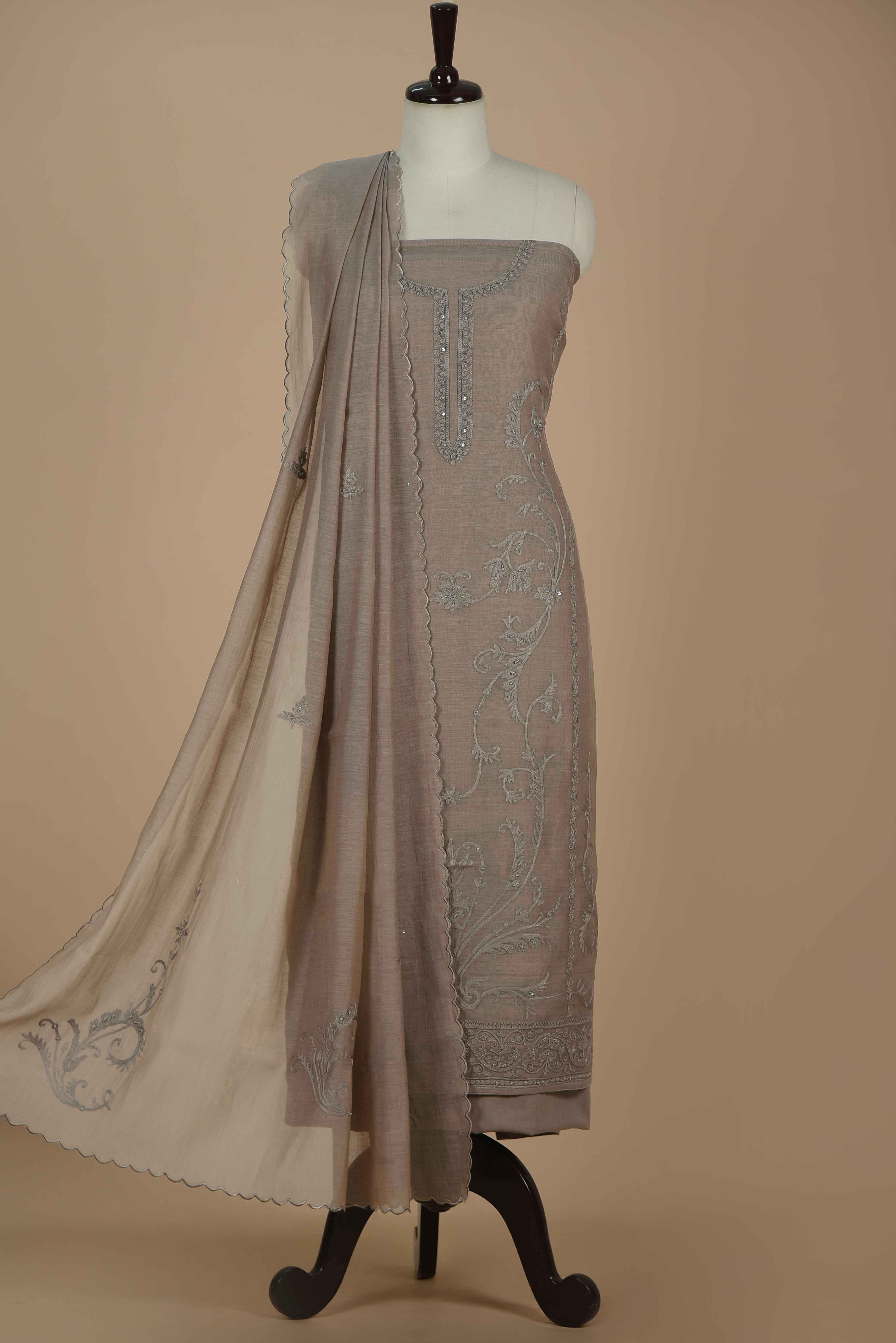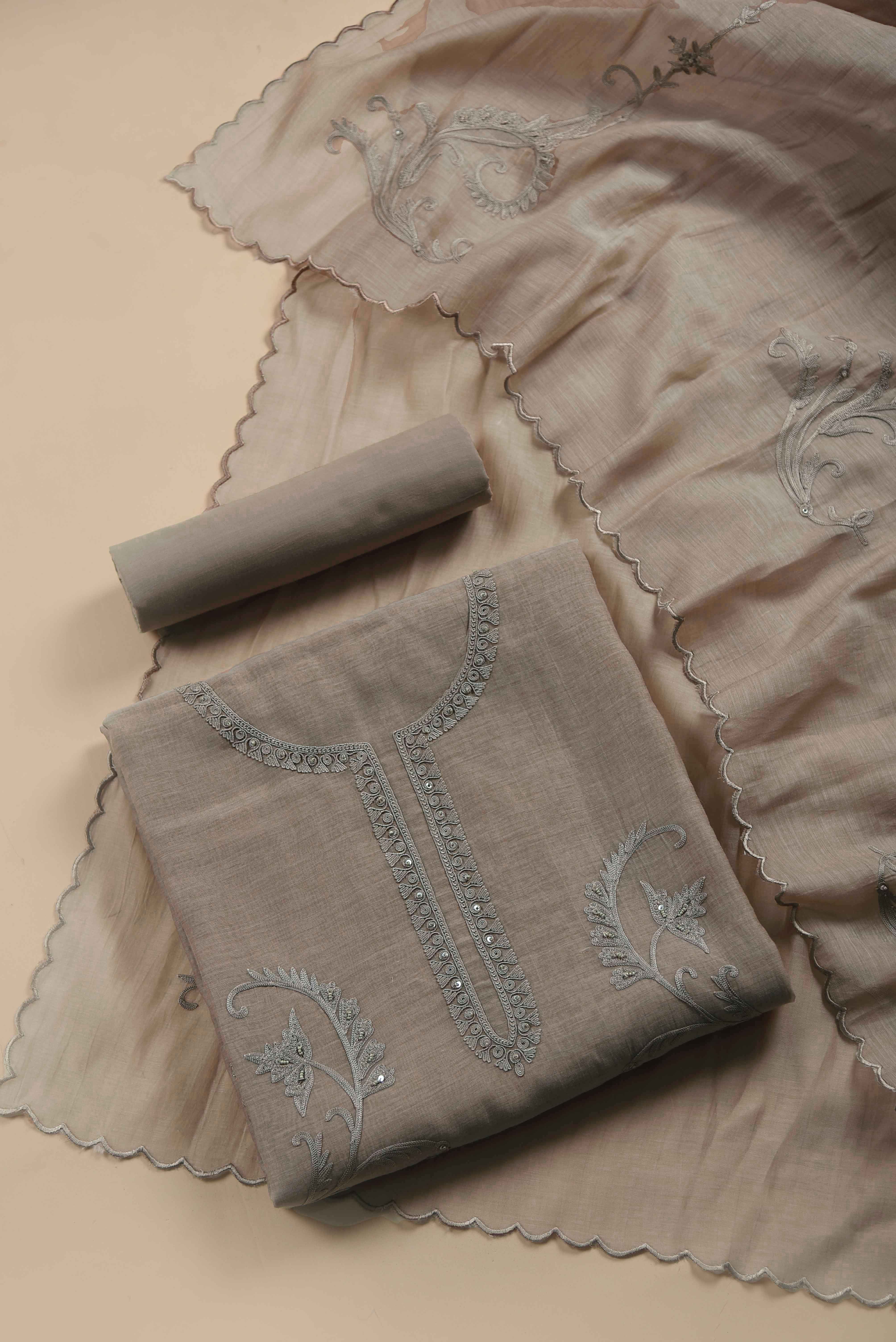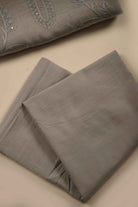 Gray Mul Chanderi Embroidered Unstitched Suit Fabric Set With Mul Chanderi Embroidered Dupatta
