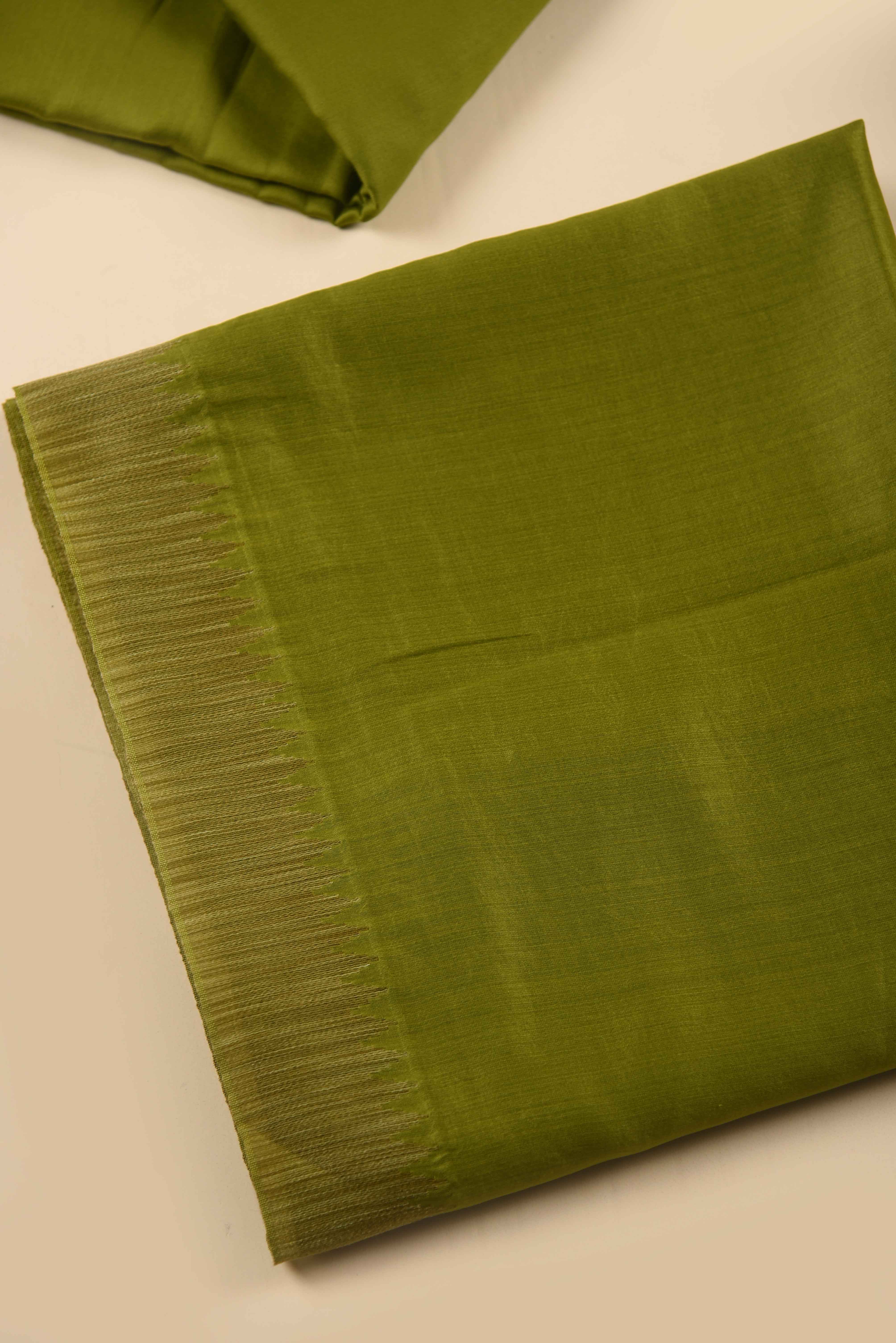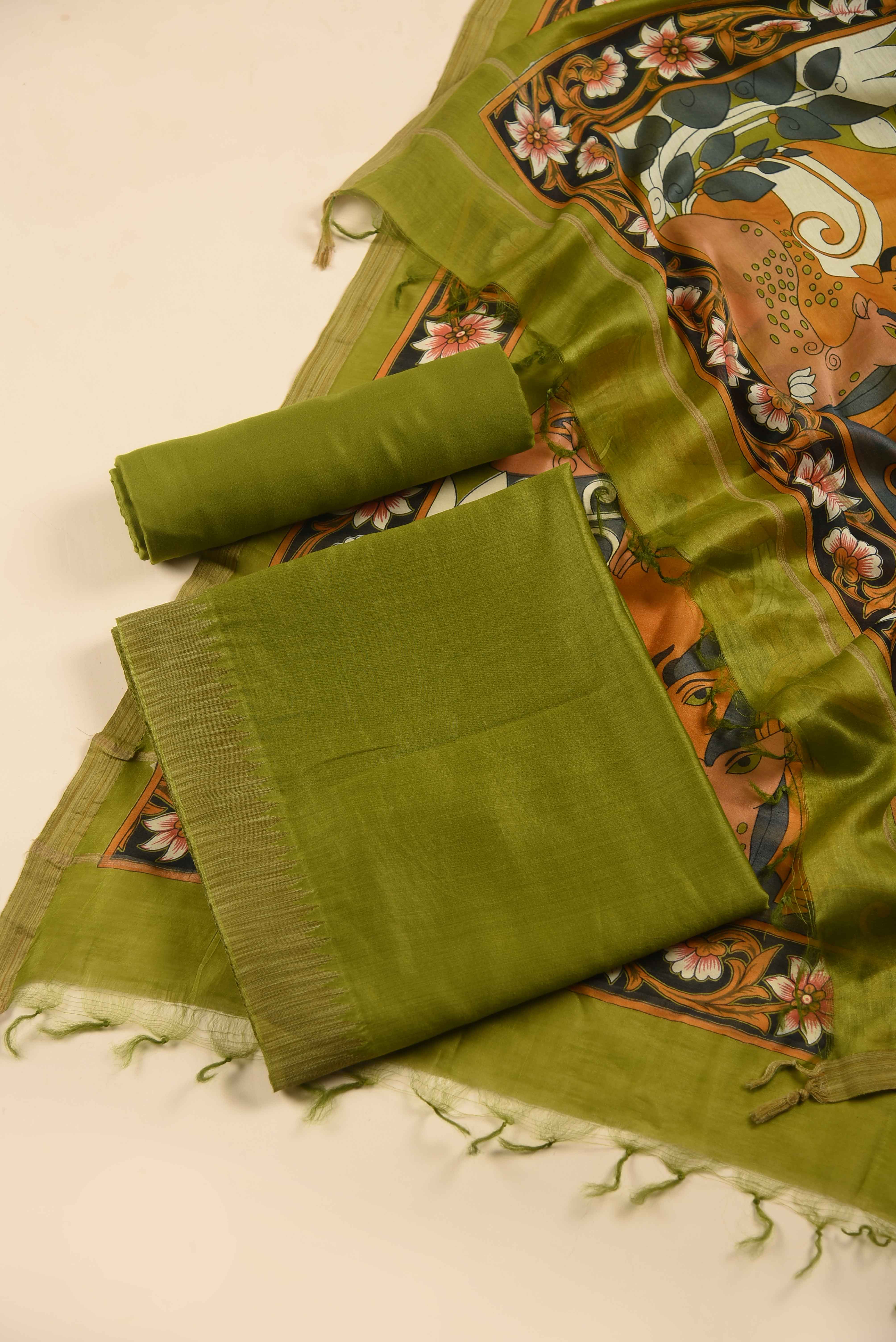 Embrace sophisticated elegance with this premium Green Chanderi Silk unstitched suit set, a masterpiece of traditional Indian weaving.