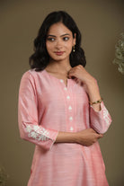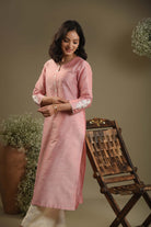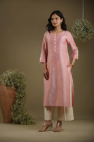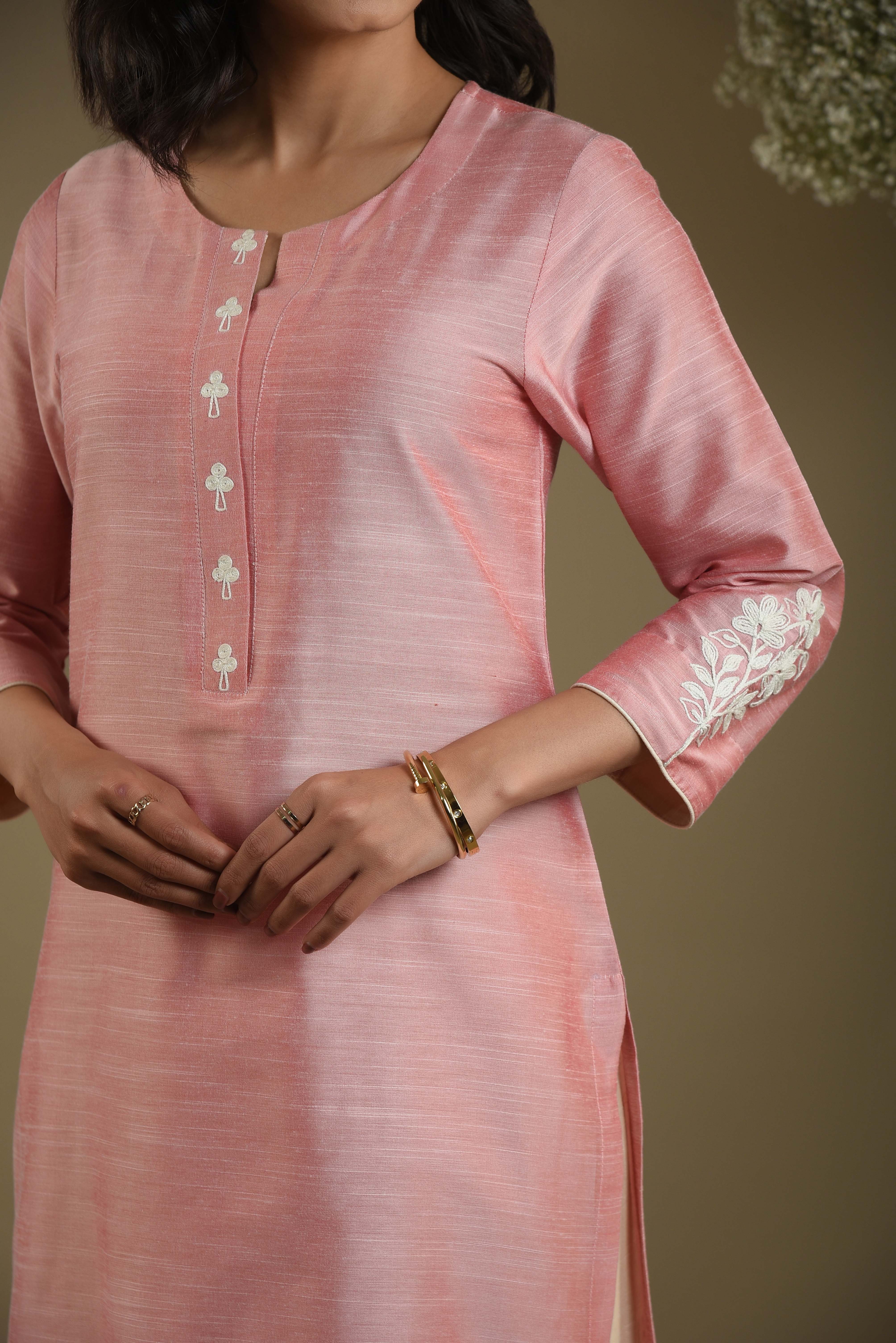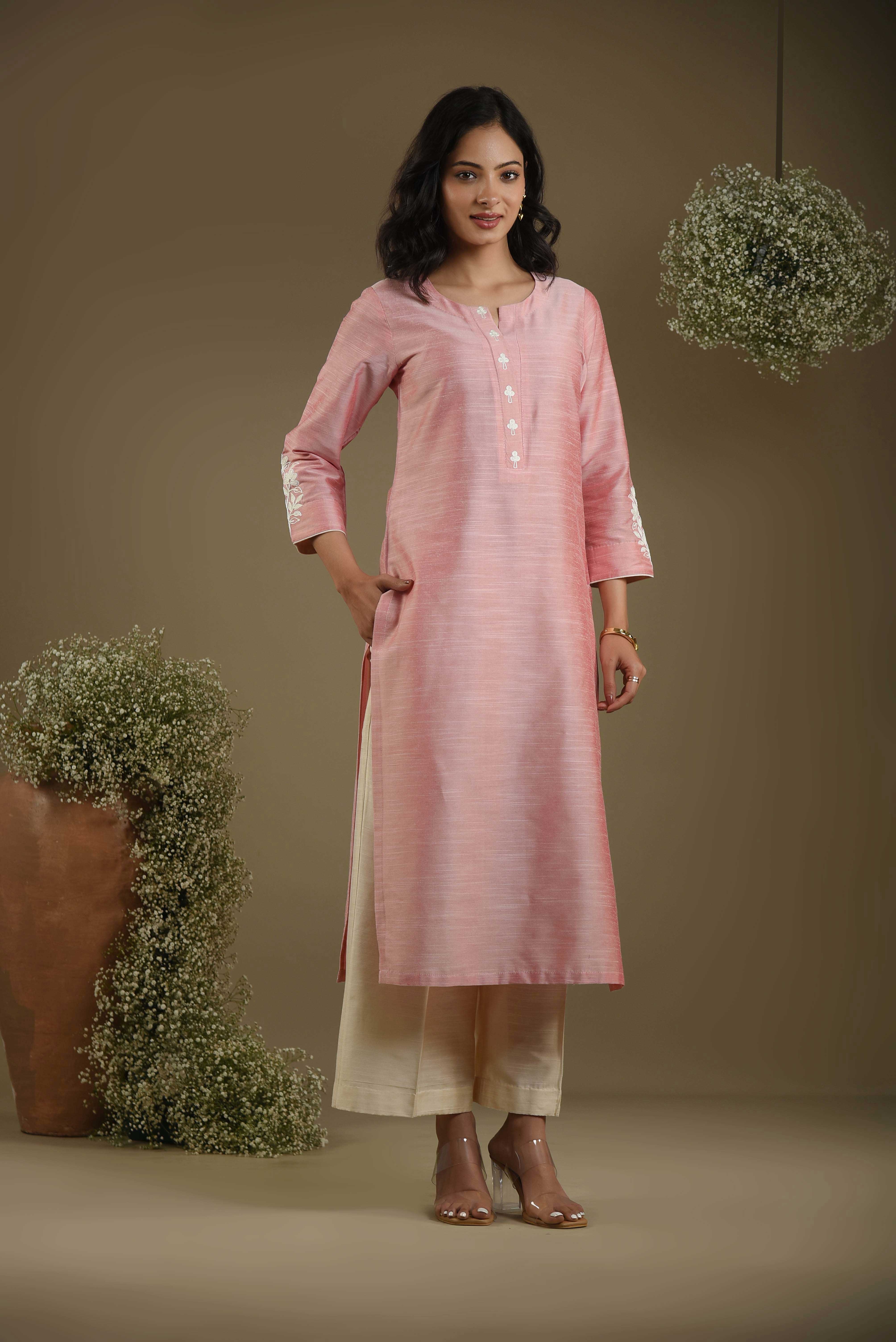 - Crafted in soft pink cotton silk, this regular-fit kurta set exudes understated occasion wear elegance.