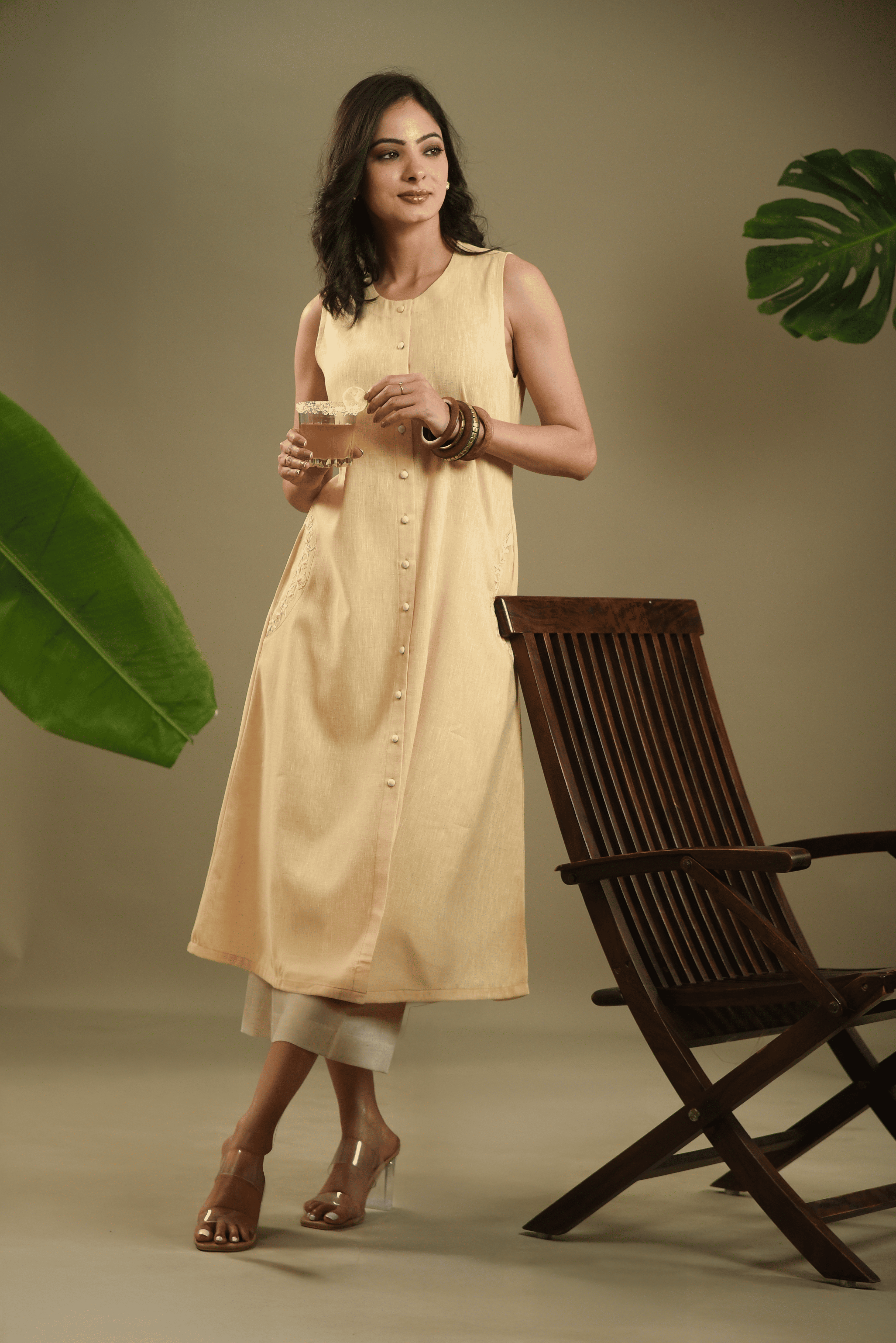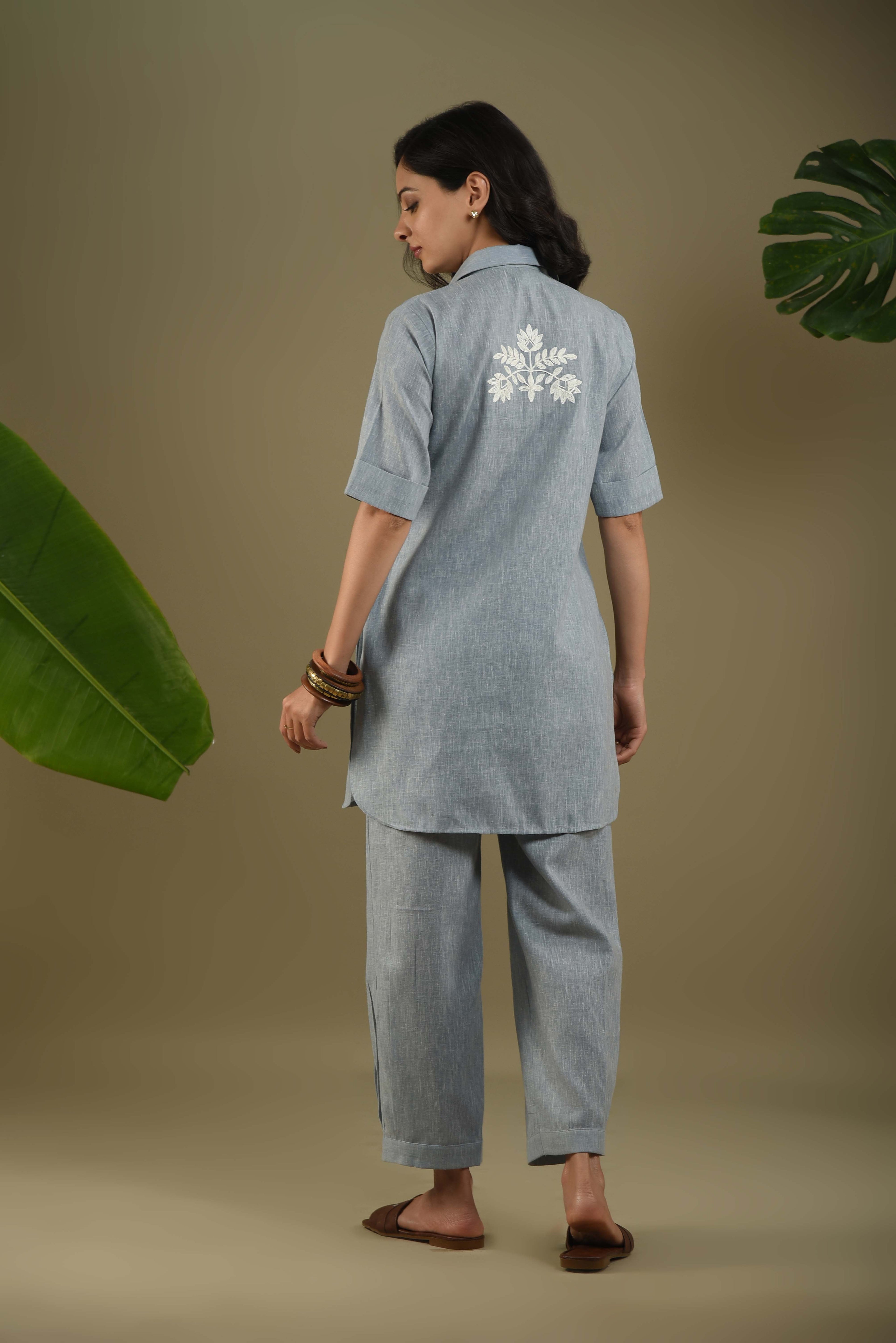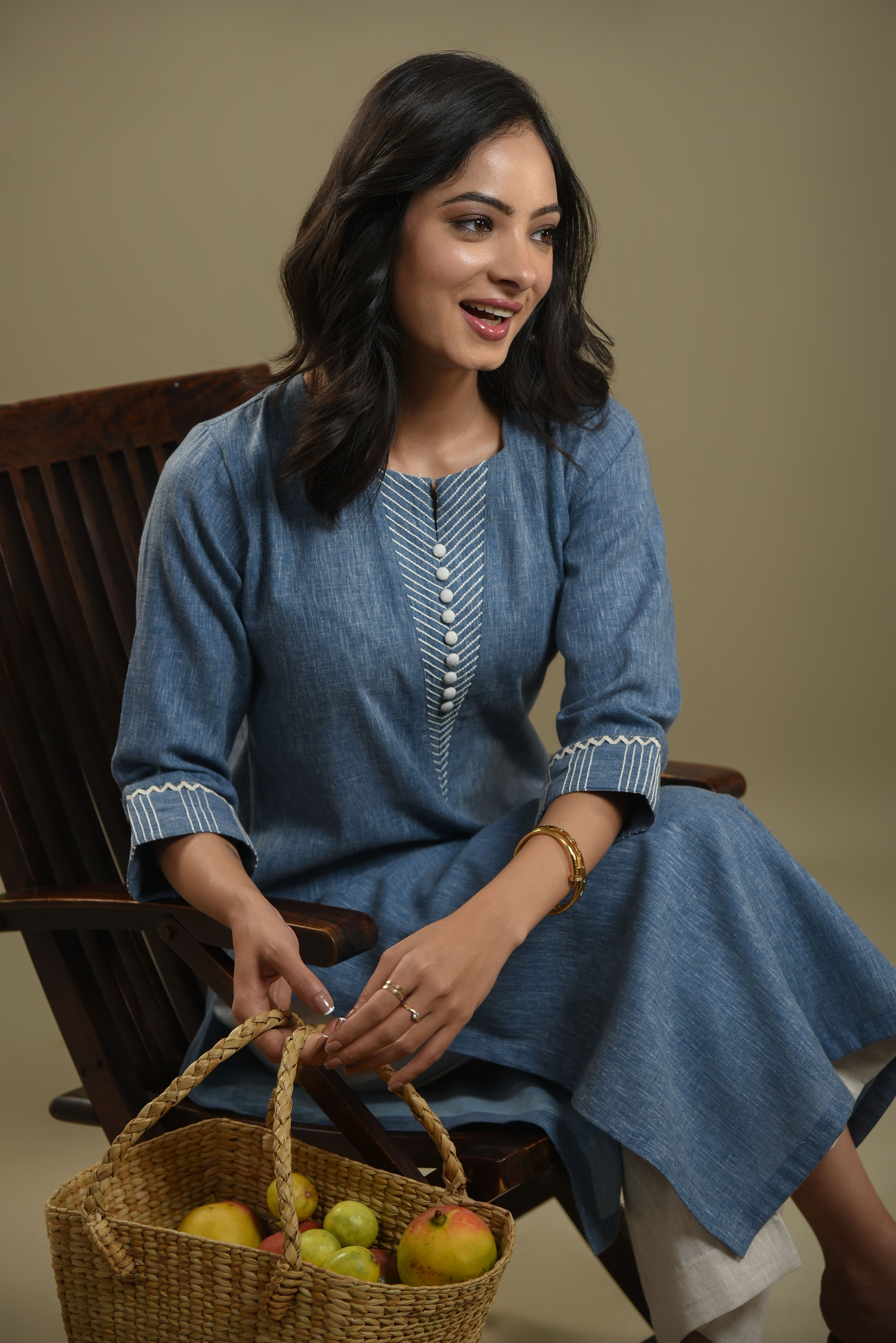 the check pattern is subtle and distinctive — reads as polished without trying too hard. embroidery along the neckline is just the right amount of detail. wore in delhi heat and stayed completely comfortable. culottes photograph beautifully — got several compliments on the overall look.