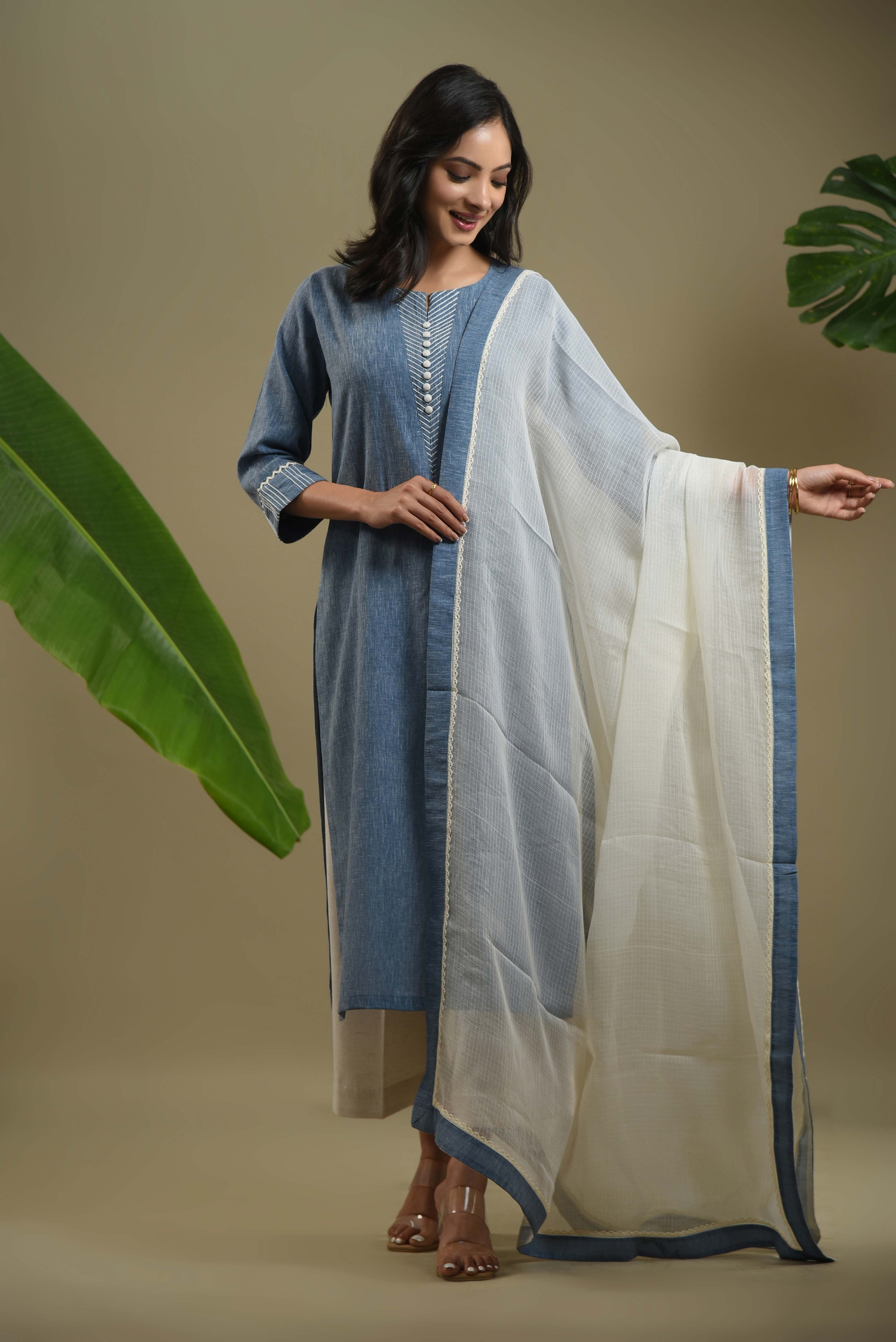 Blue Pure Cotton Printed With Lace Work Unstitched Suit Fabric Set With Cotton Printed Dupatta