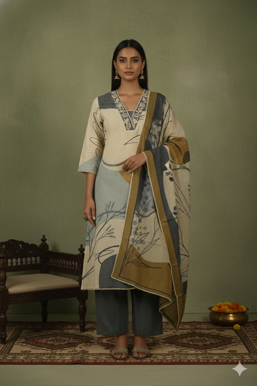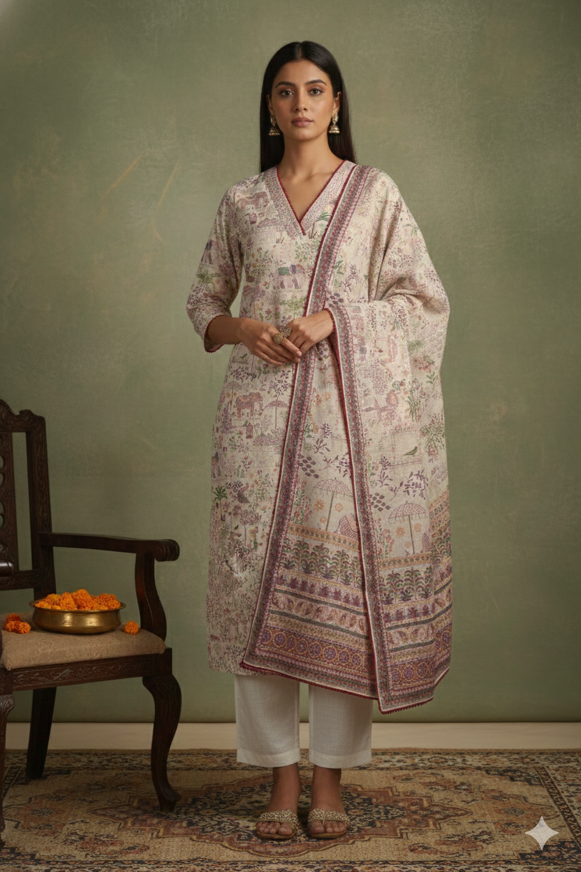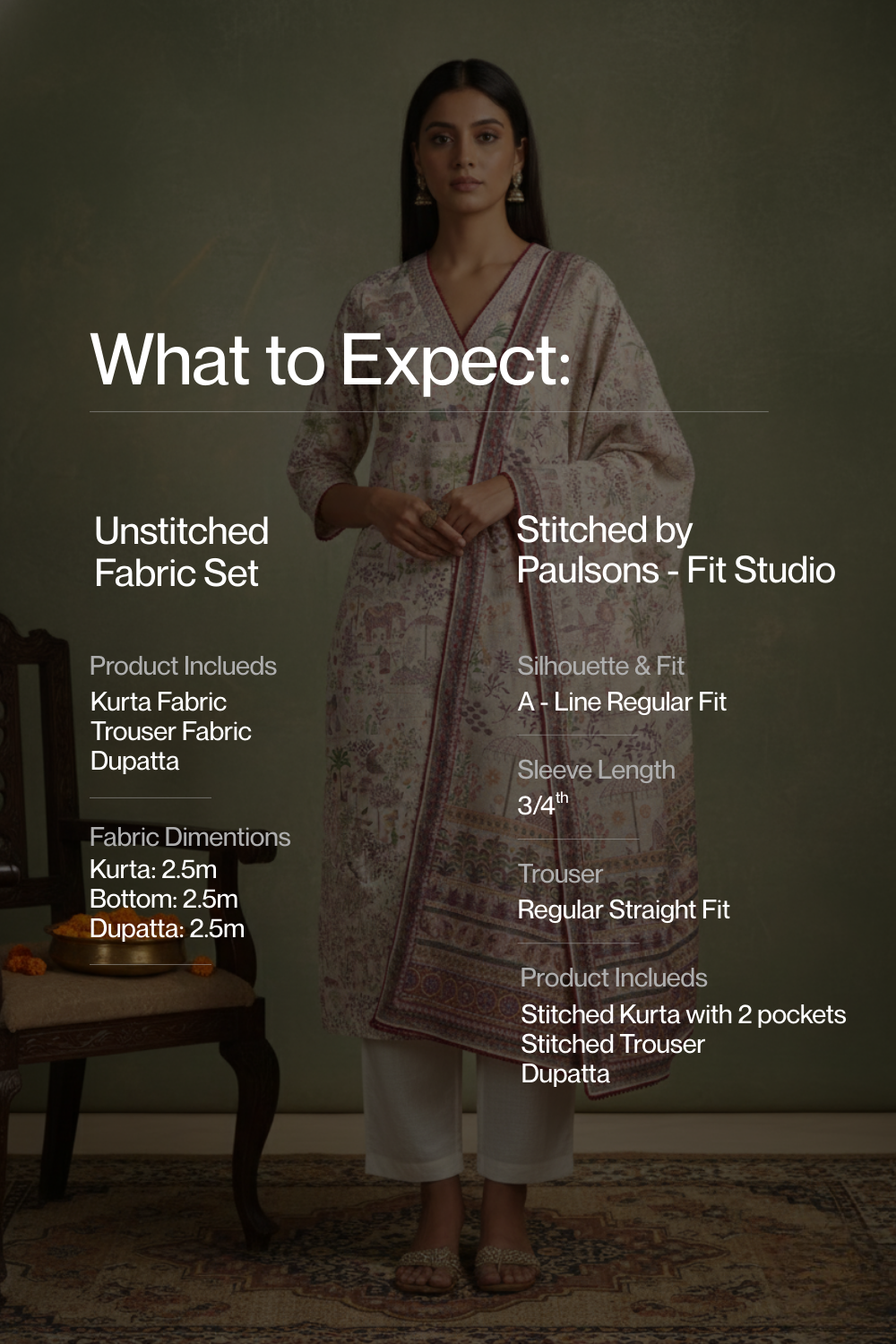 Fit Studio by Paulsons brings expert tailoring to your everyday ethnic wear. Our professionally stitched kurta sets are designed for women who want a ready-to-wear solution with a refined fit and premium finishing. Each set features a straight-fit kurta, tailored pants with two functional pockets, and a coordinated dupatta, stitched in-house for all-day comfort. Stitching charges range from ₹1,500 to ₹3,000, depending on the design, and are included in the MRP. Choose stitched or unstitched every Fit Studio suit is made for lasting style and comfort beyond a single wear.