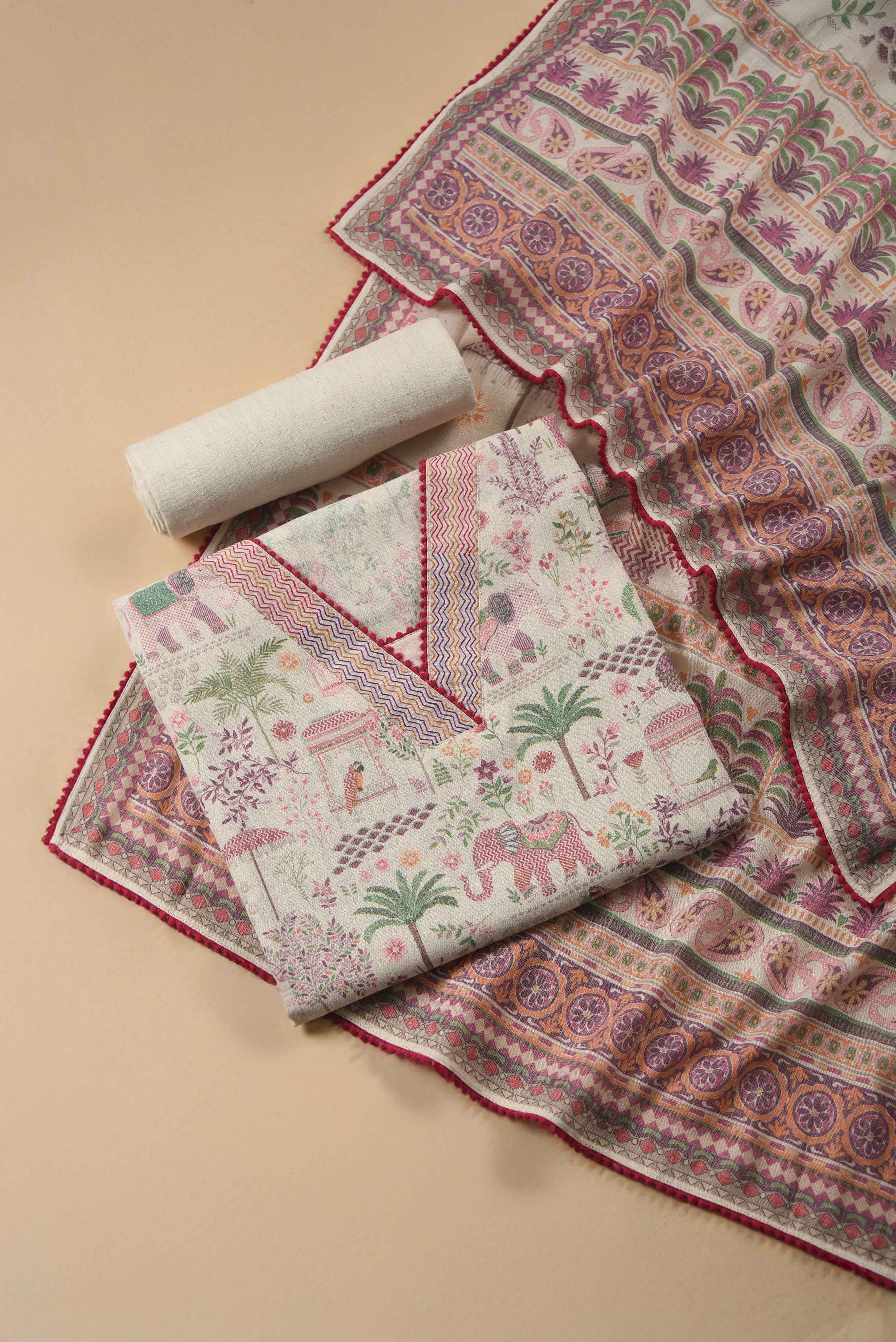 Red Mul chanderi Embroidered Unstitched Suit Fabric Set With Mul Chanderi Embroidered Dupatta