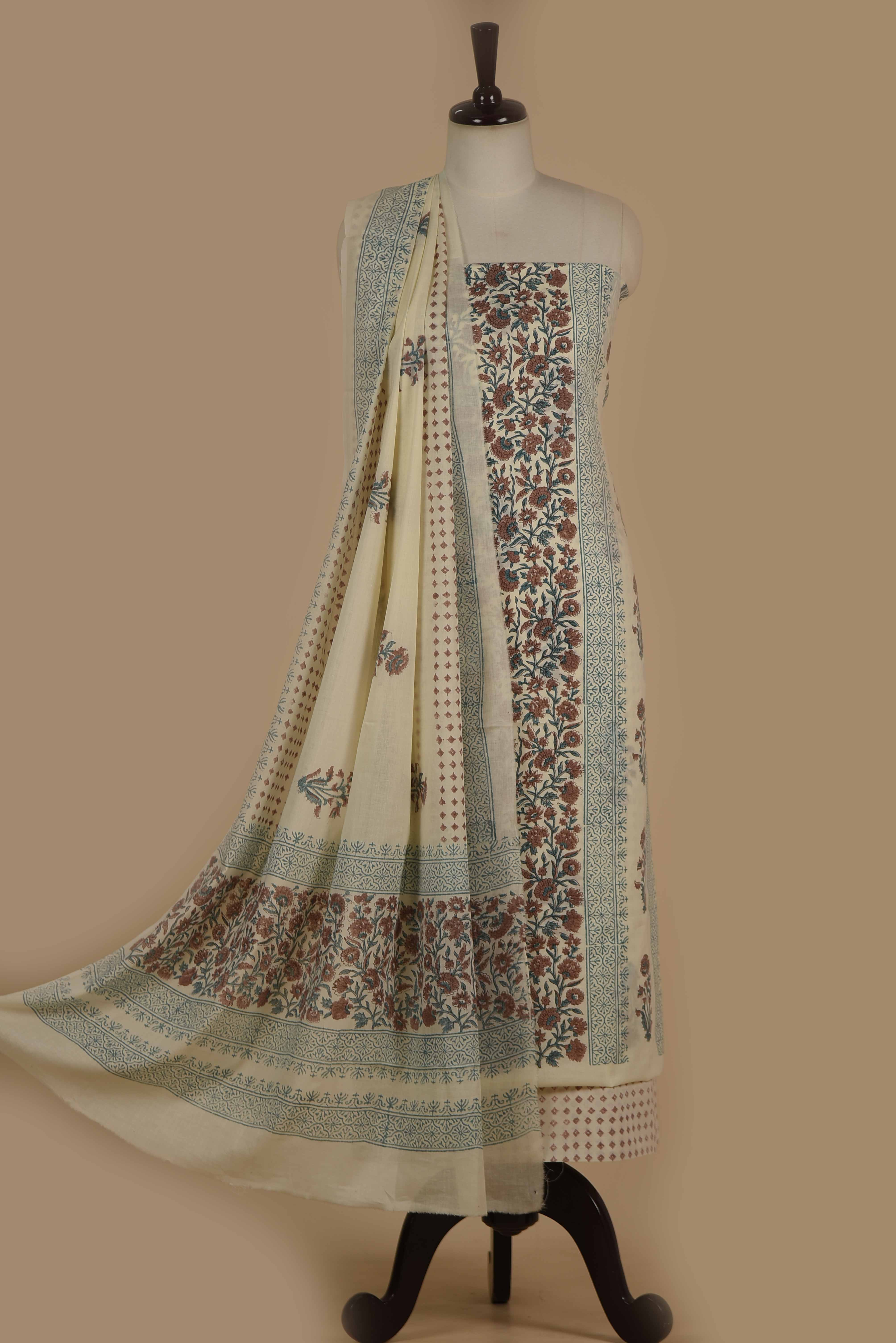 Made for women who care as much about fit as they do about fabric, this cream hand block printed suit with printed dupatta is designed for effortless, polished dressing.