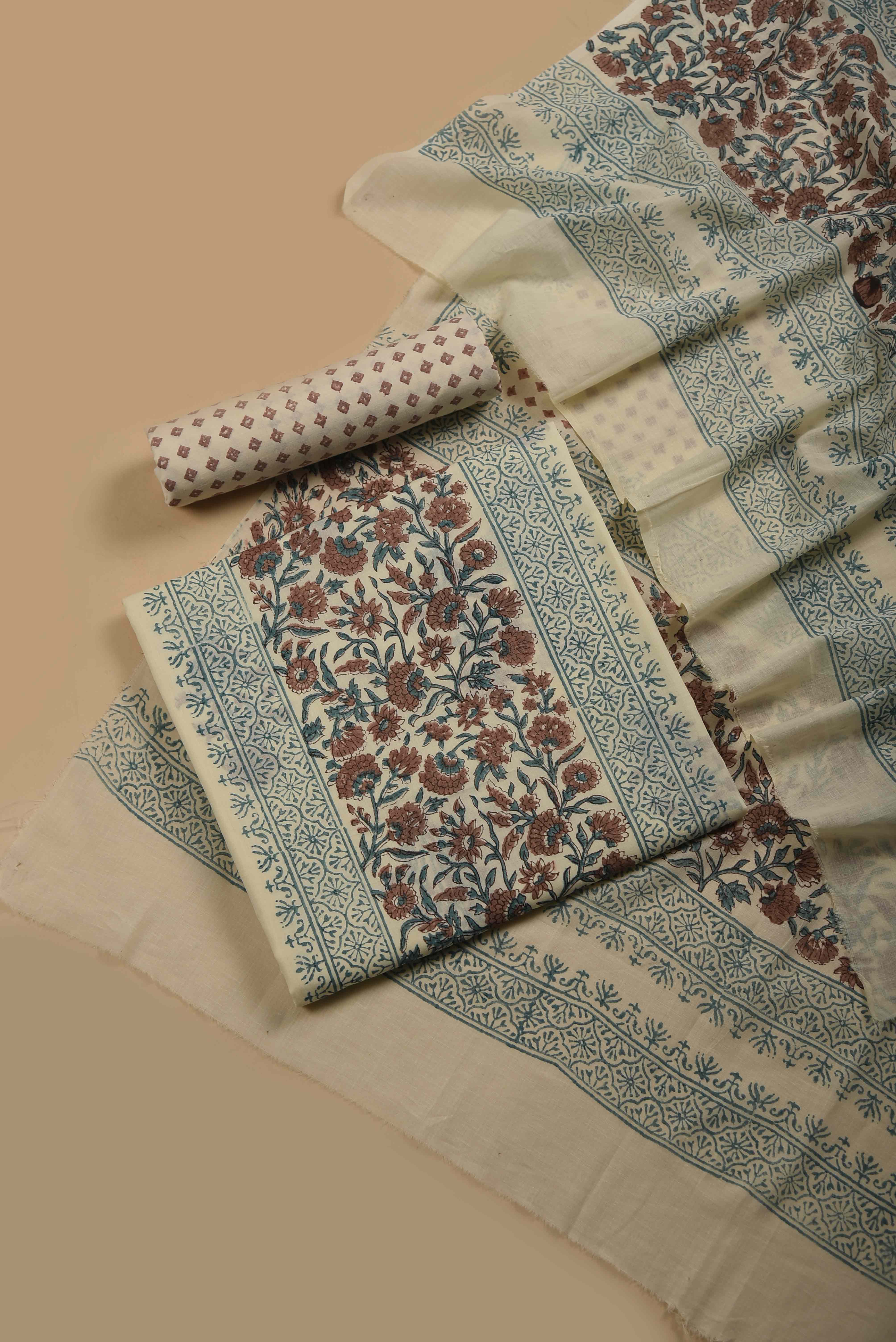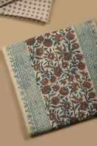 Cream With Brown Mul Cotton Printed Unstitched Suit Fabric Set With Mul Cotton Printed Dupatta