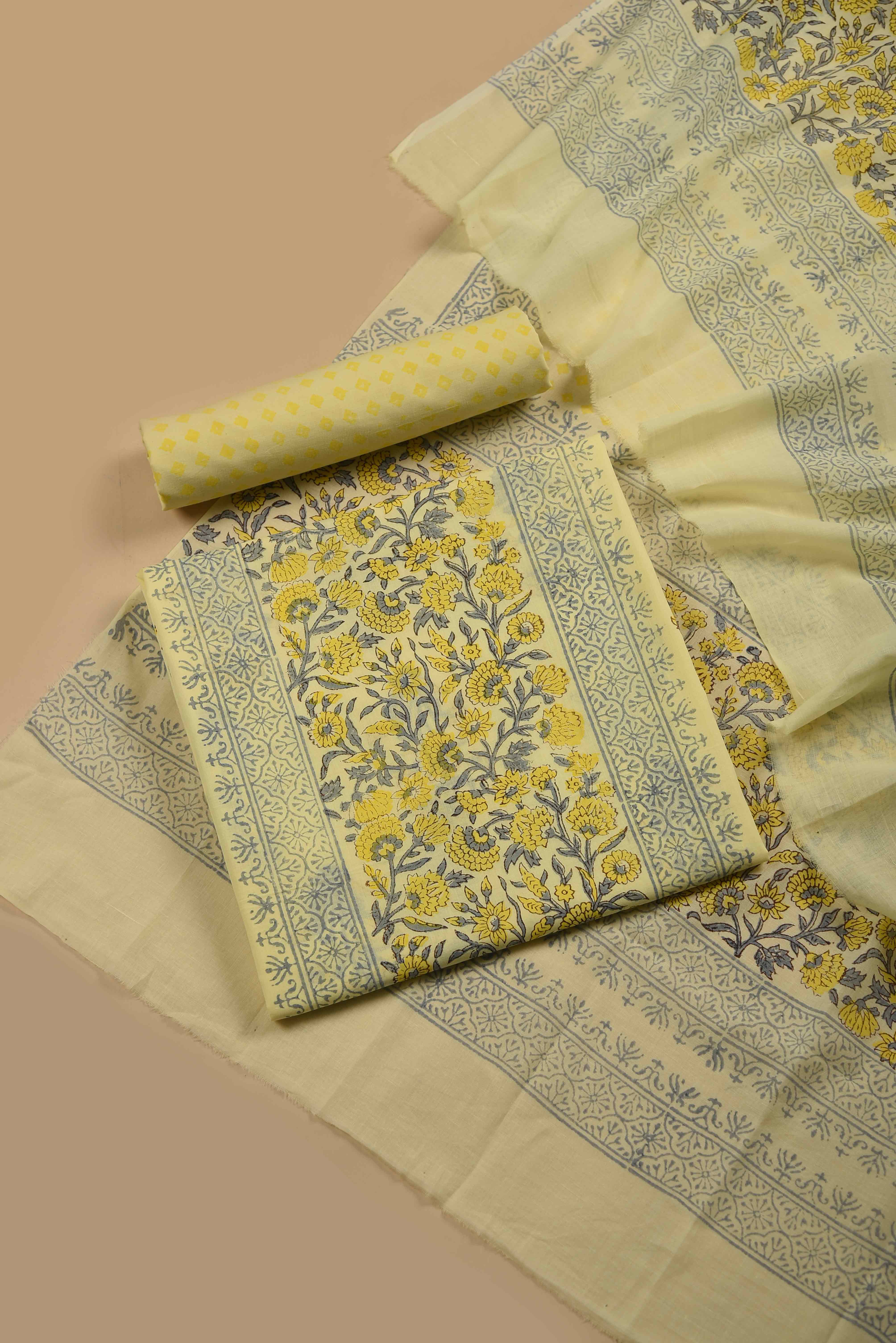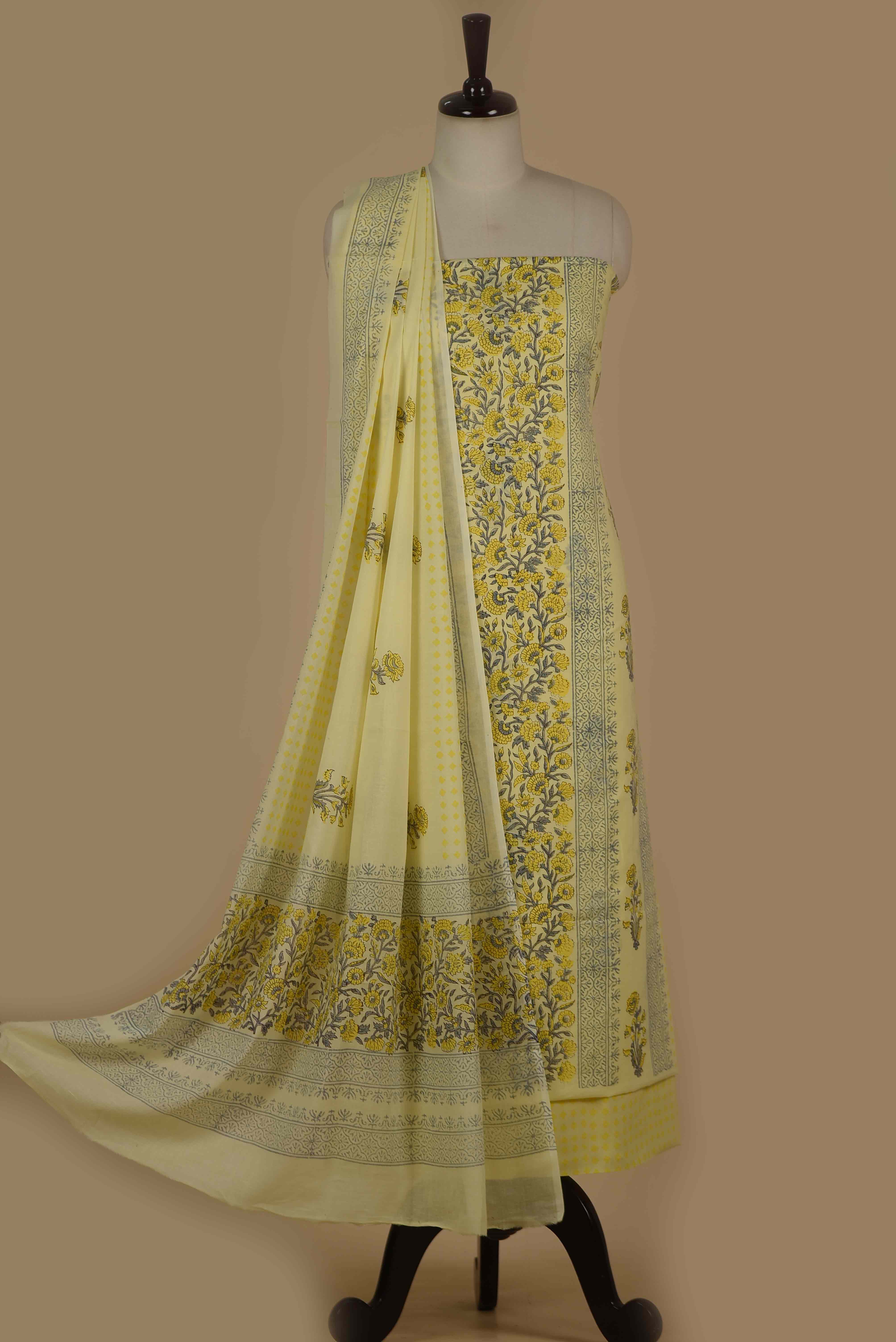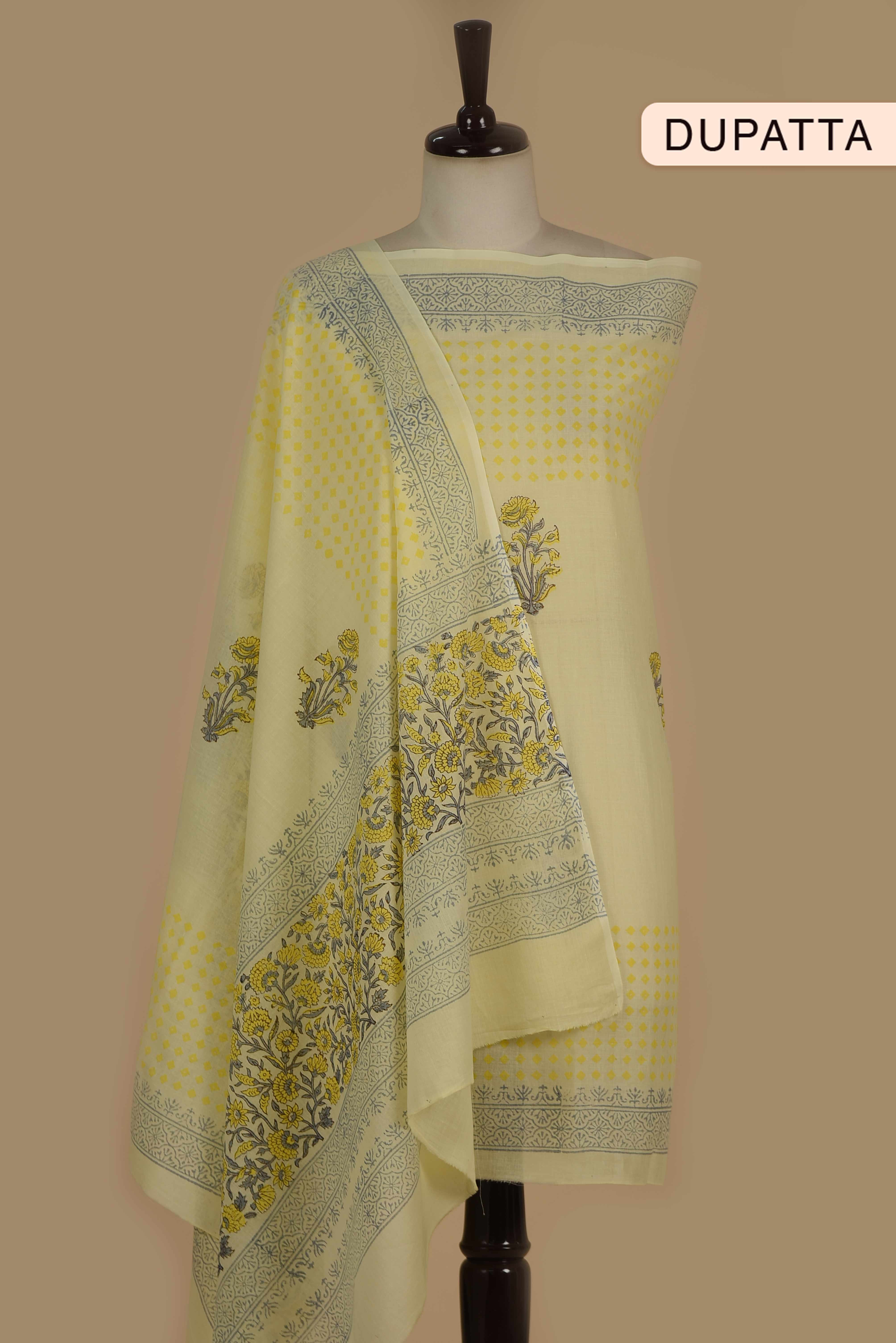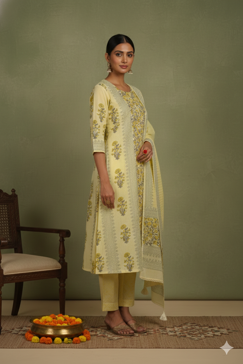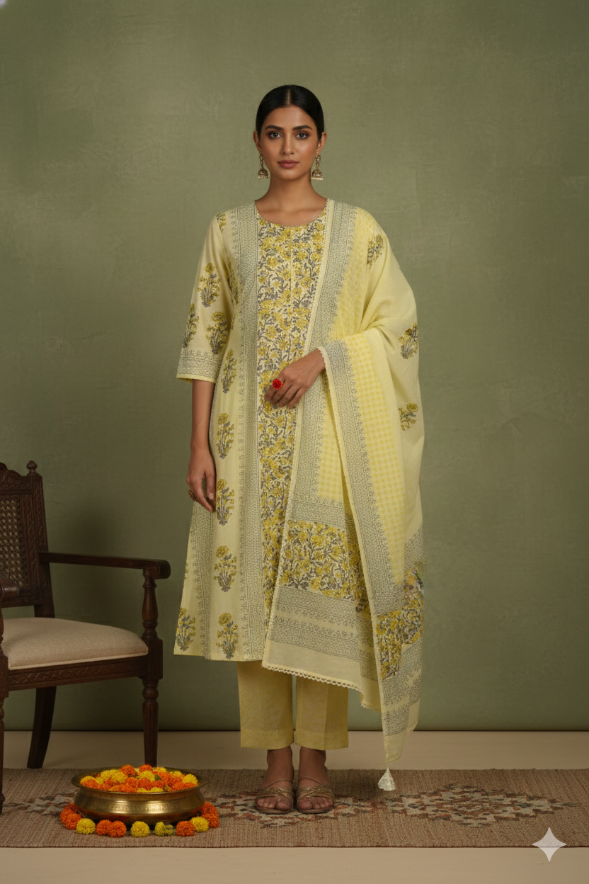 Made for women who care as much about fit as they do about fabric, this yellow hand block printed suit with printed dupatta, designed for effortless, polished dressing.