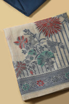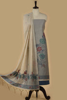 - Elevate your ethnic wardrobe with this graceful beige and blue Chanderi blend unstitched suit fabric set, designed to reflect understated elegance and timeless charm.