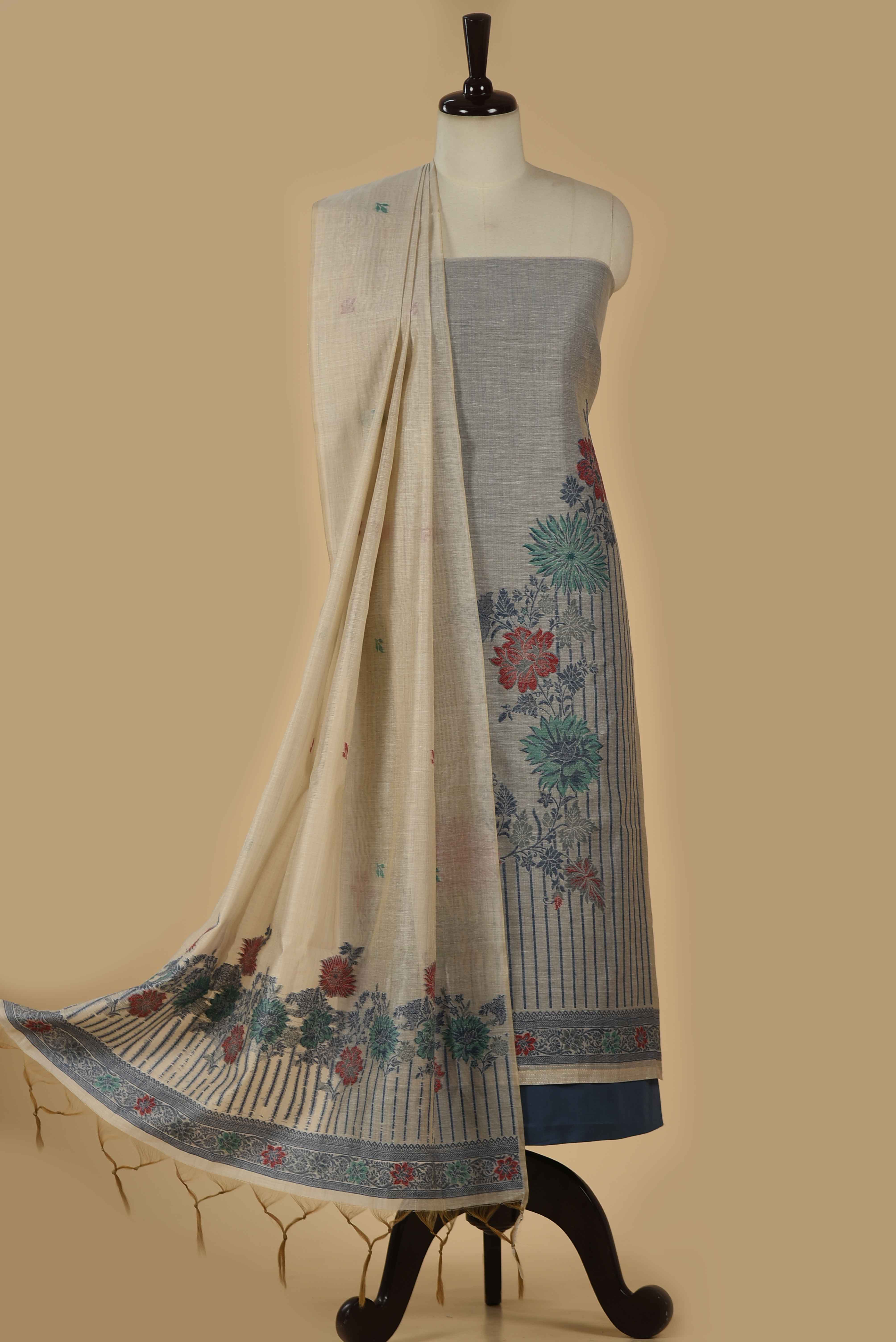 Beige With Blue Chanderi Blend Woven Unstitched Suit Fabric Set With Chanderi Blend Woven Dupatta